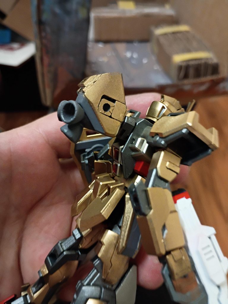 使用した塗料は主にアルクラッドのラッカー塗料です。ペールゴールドとチタニウムゴールドの2種類を使用しました。また、アルクラッドシルバーにクリアレッドを上塗りしたものも各部に使用しました。バックパックにはMr.ホビーのスーパーゴールド2とスーパーイタリアンレッドを使用しました。最後に、目とカメラにはMr.ホビーのスカイブルーを使用しました。