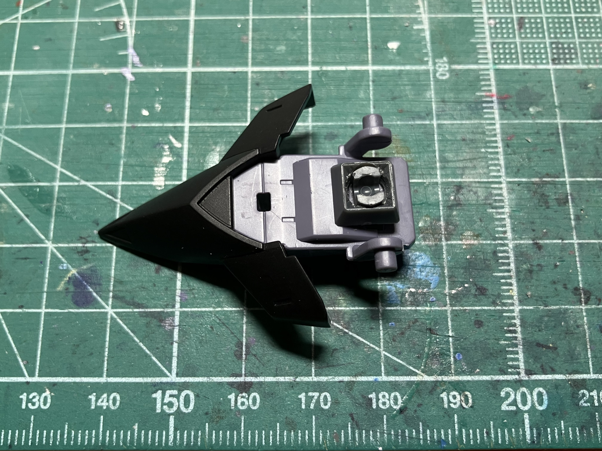 首は単なる軸接続で埋もれがちなため可動はほぼ皆無でした。フロントアーマーと同じく、ボールデンのボールジョイント(小)を使って可動範囲を拡大しました。胴体フレーム側の受けが飛び出して隙も大きいため、ウェーブの角・バーニアをリーマーでゴリゴリ穴を広げてカバーを製作。後ろにはくさび形に隙間が空くので、エポキシパテで埋めて整形。