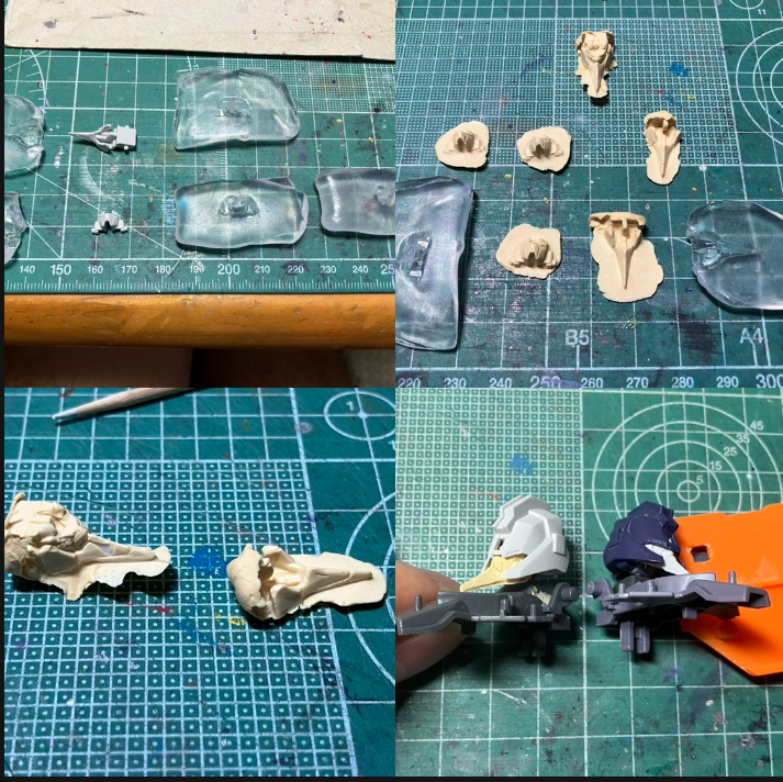 100均で買ったおゆプラを使ってマスク・アゴを個別に型取り、エポキシパテで複製しました。初めての複製ということもあり、失敗を前提に複数の型を起こし成功した物を選びました。