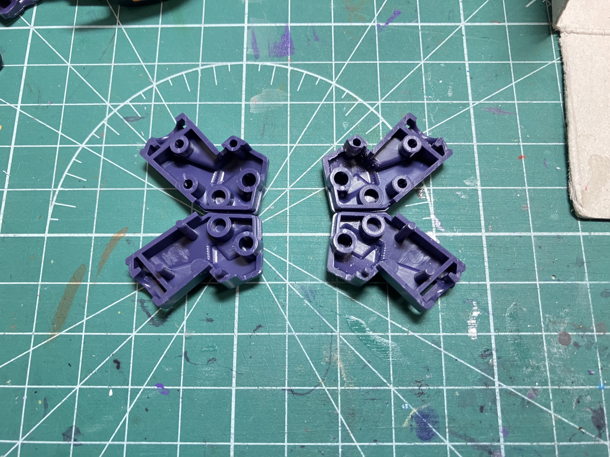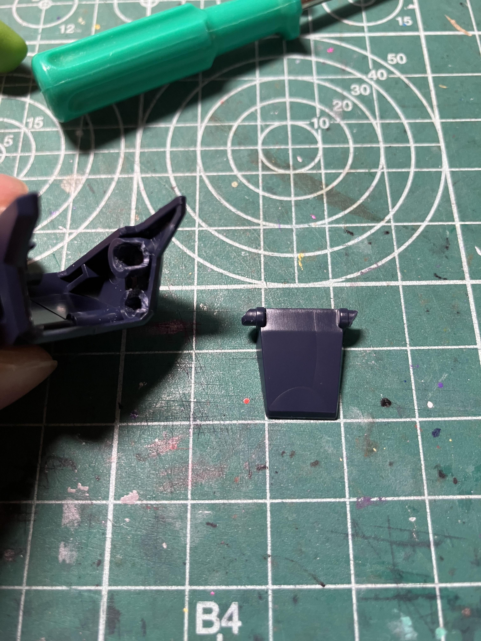 肩側面の可動プレートは受けをC字に切り欠くだけでは軸が長すぎたため、斜めに切って組み込めるようにしました。予想よりも軸の長さが不足したためすぐにすっぽ抜けやすいです。