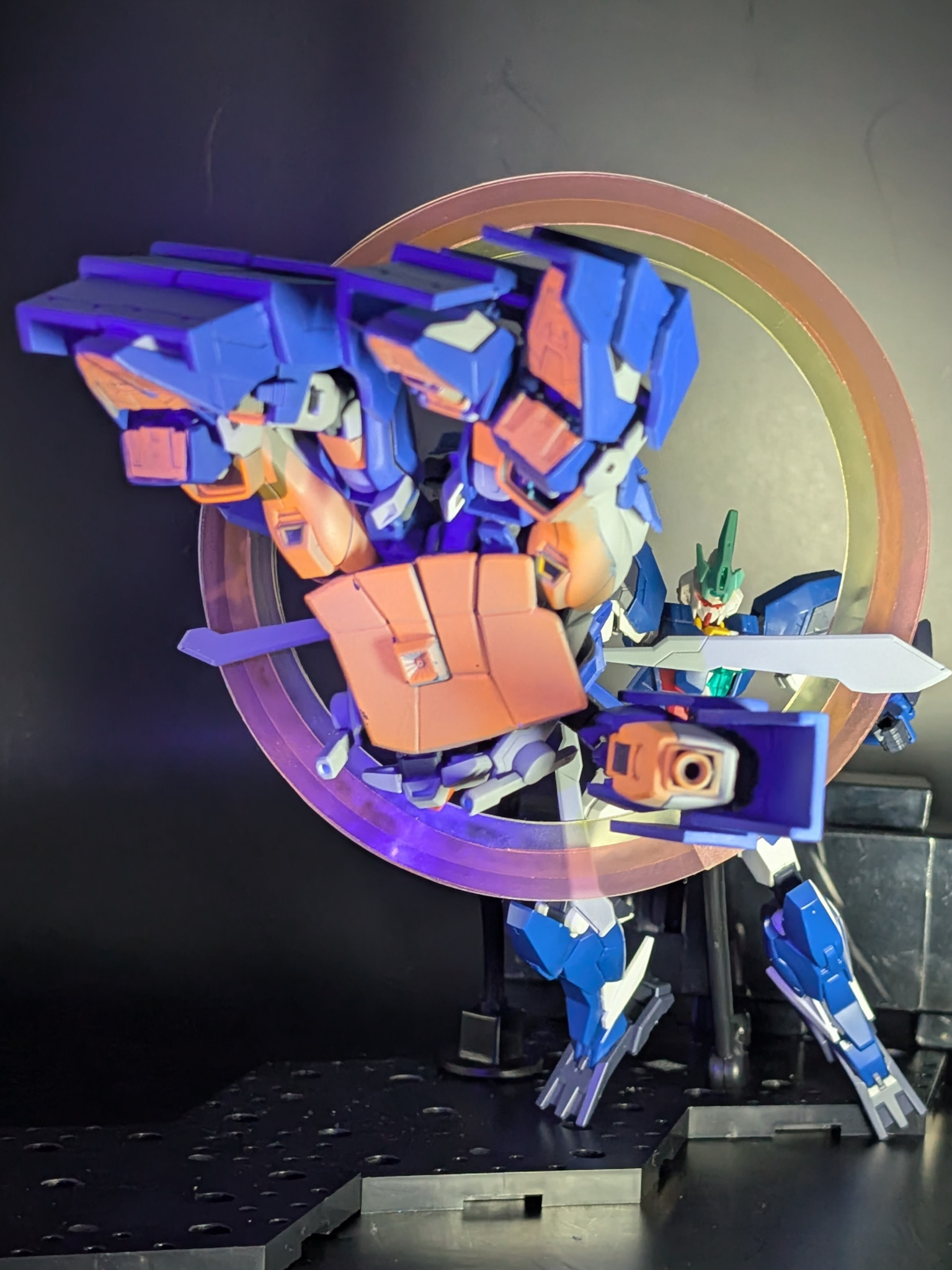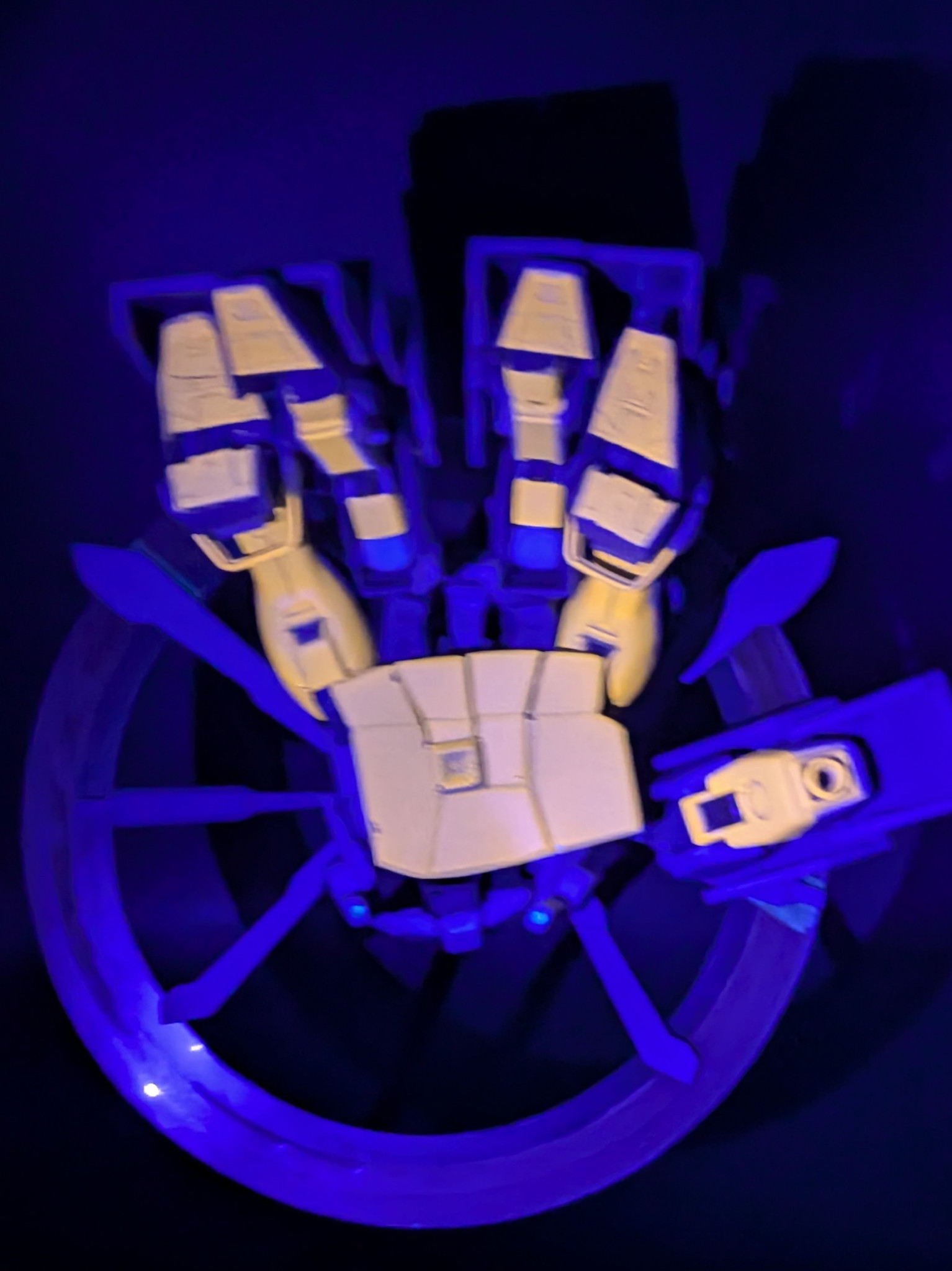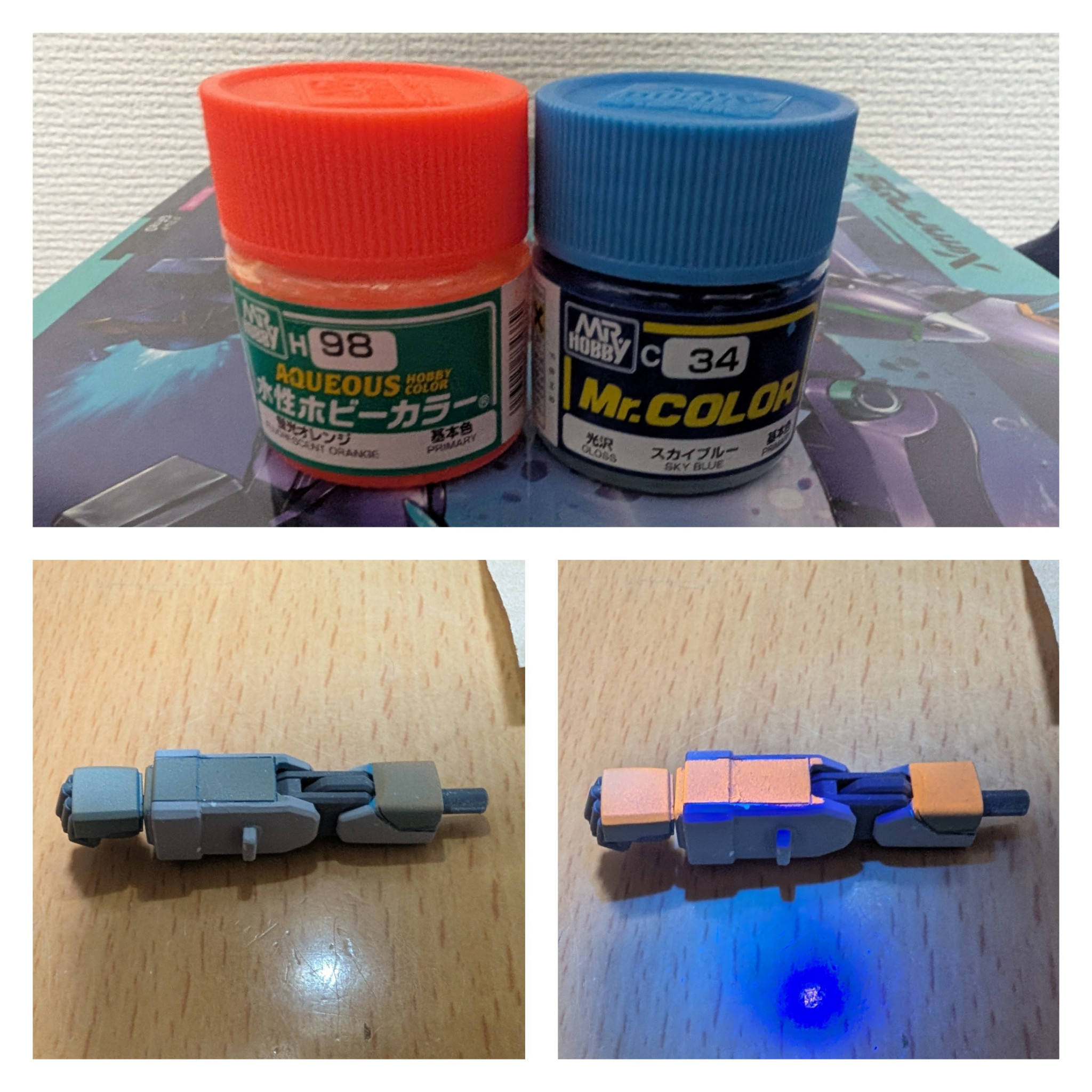 ブラックライトでオレンジに光らせたカラクリは、スカイブルーを下地に蛍光オレンジをクリアで薄めて5回塗りして、補色でグレーにしました。欲が出て1回多かったので全体的にちょっとオレンジになってしまいましたが、発光前はほぼグレーにできたので満足