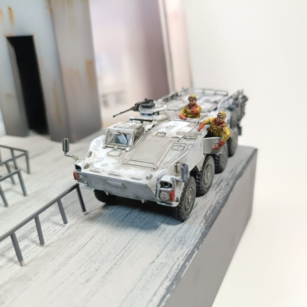 手前の装甲車はアオシマの陸上自衛隊96式装輪装甲車 1/72を使用しました。フィギュアはハセガワ 日本軍搭乗員セット1/72を改造して使用しました。