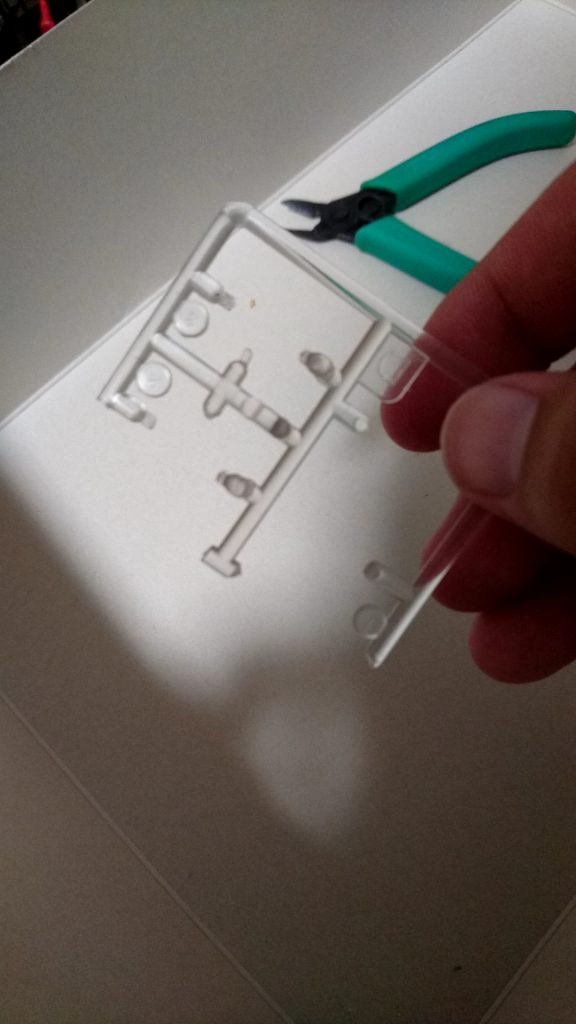 その辺にあったランナーから切り出し、やすりがけでサイズを調整してはめ込みました。これ塗装するからクリア使う意味なかったな…