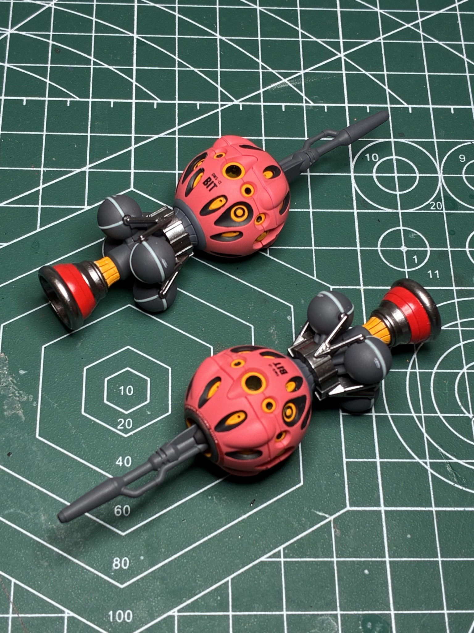 塗り分けの面倒なビットです。そもそも、一番内側に入る丸いポツポツのついたパーツは、黄色の成形色にして欲しかったです。見てのとおり、カラフルですが、4つあるタンクの筋を塗ったり、バーニアの赤や黄色の部分、そしてビット外装の涙型の黒い縁取り、ビーム砲やタンク以降に繋がる丸い基部の黄色・グレーの塗り分けなど、かなり面倒でした。
