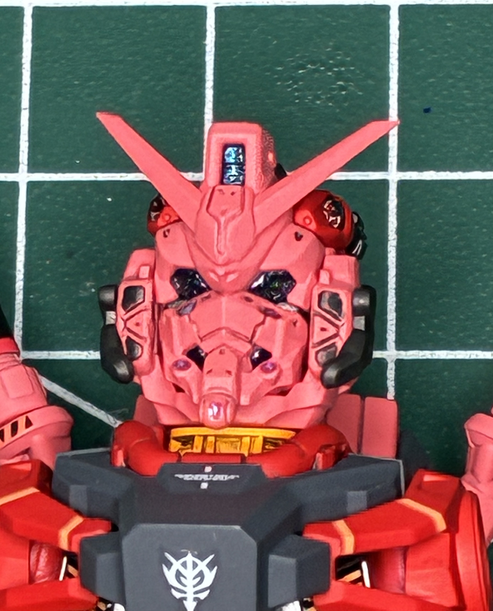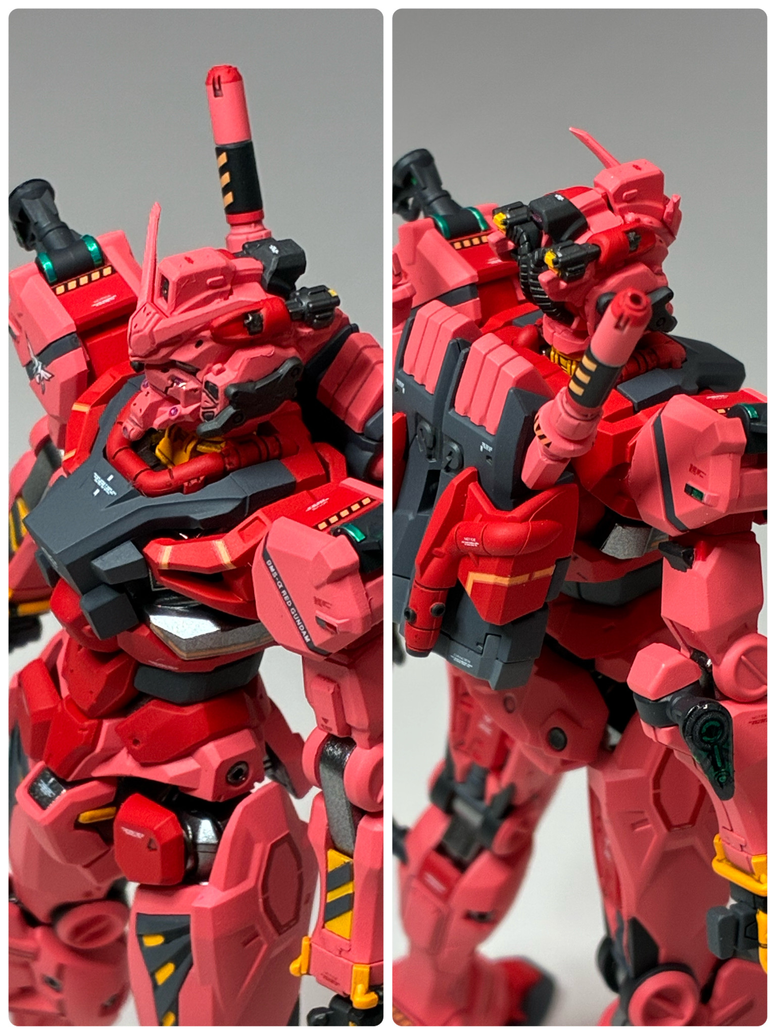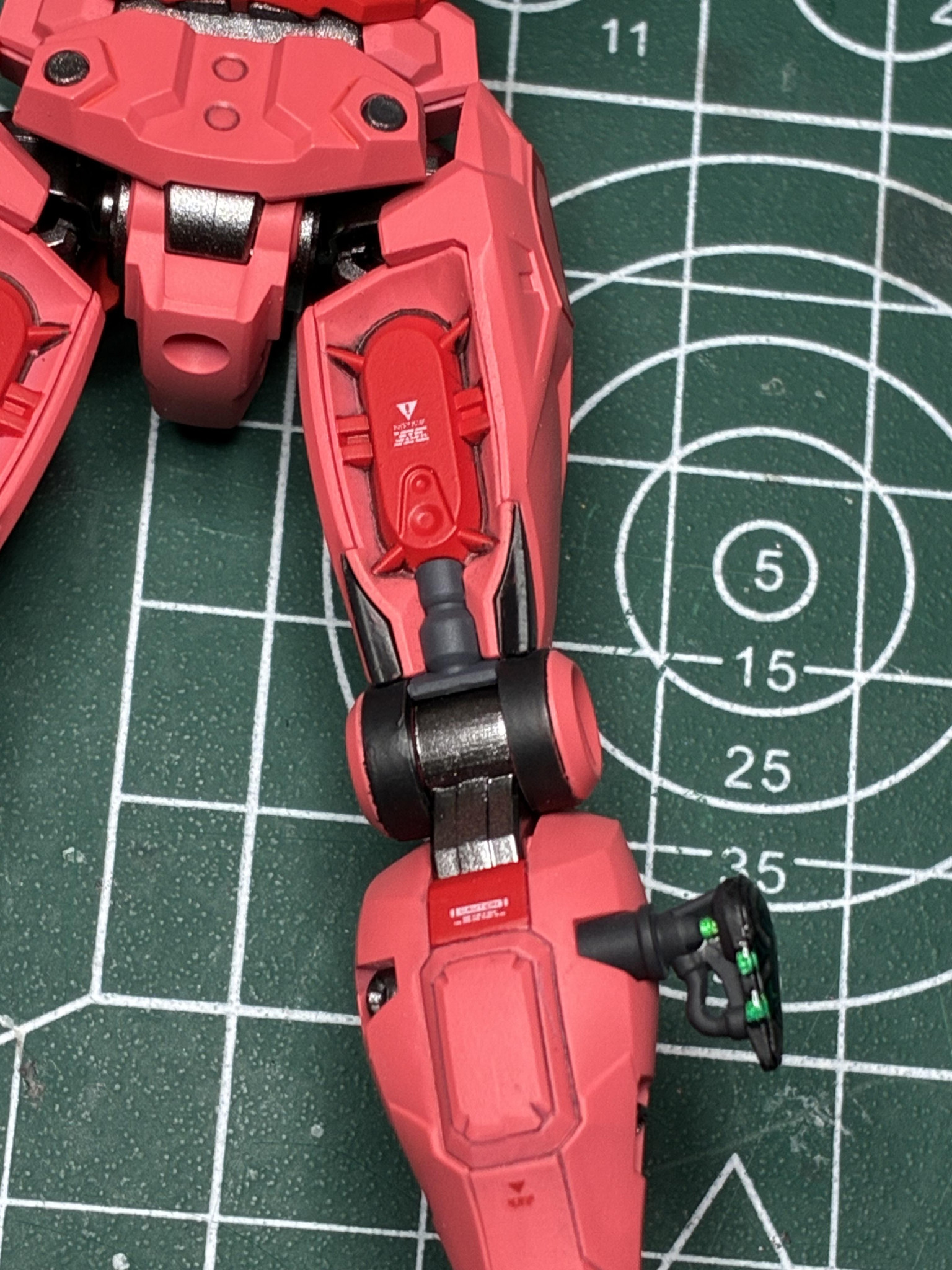足は膝とモモ裏が面倒な塗り分けをしました。特に、膝のマルイチパーツの内側だけ黒いのは、0.4ミリのマスキングを根気よく巻いて筆塗りで凌ぎました。モモ裏の赤いパーツも完全に塗り分けせざるを得ず、なぜこれらのパーツを別パーツにしてくれてないのか、と嘆きました。価格とリリースのスピードからしたら、やむを得ないのですね…。