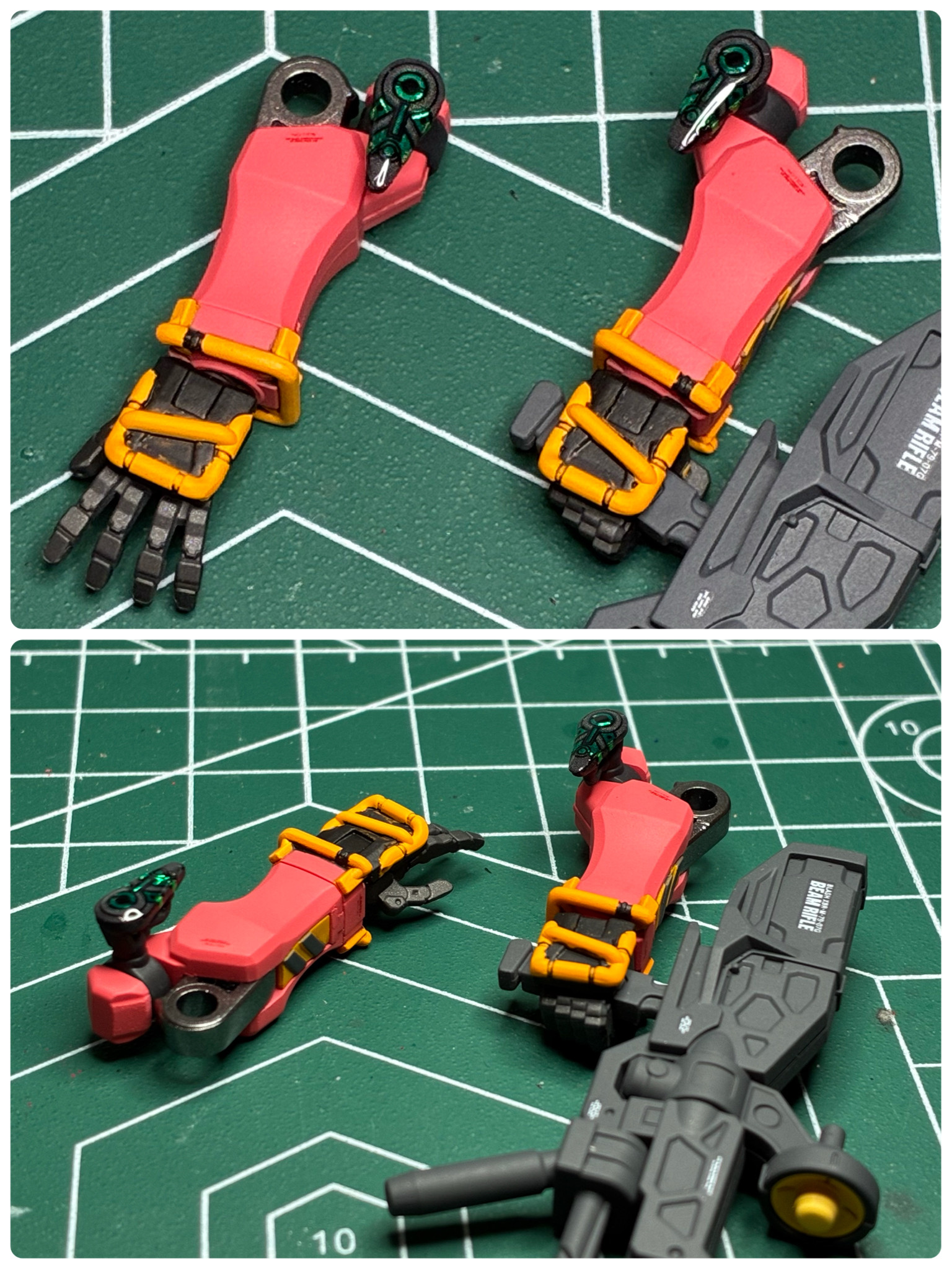 手首のパーツも黄色部分はマスキングによる塗り分けをしました。ここも横着がって、塗り分けが甘かったところは全て墨入れで誤魔化そうとしたのですが、そういうことをしたために結果的に汚くなりました。手の甲パーツも黄色成形色にして欲しかったです。