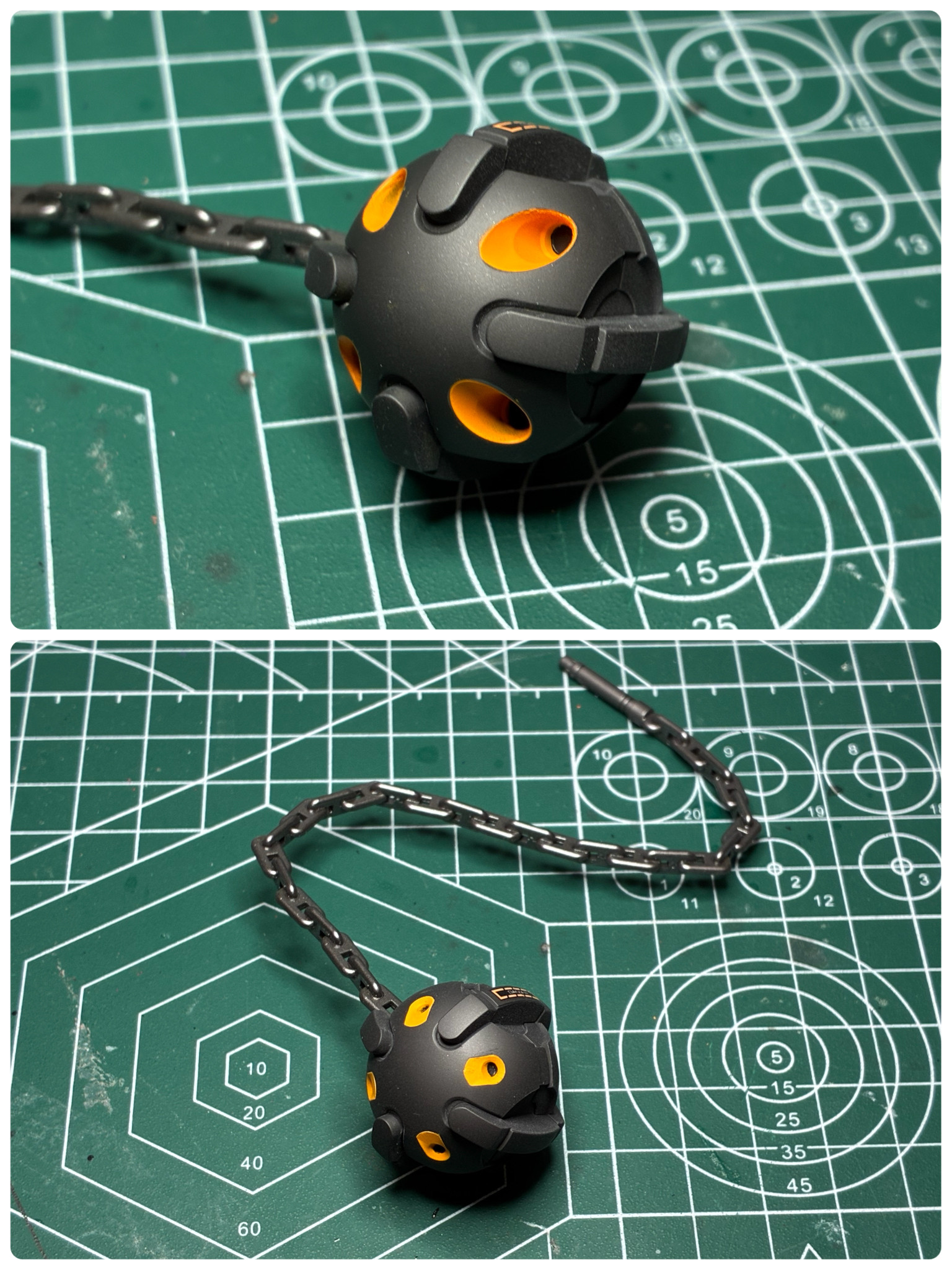 地味に、ハンマーの塗り分けも気を遣いました。黄色の部分をどう塗り分けるかいろんな方法がありますが(水性やエナメルの拭き取りとか、先に黄色塗るべきとか)、浅い方のくぼみはマスキングによる塗り分けで乗り切りましたが、深い方の黄色は頭を悩まさました。結果、グレーの上からラッカーの黄色を塗り(ギリギリまでマスキングはしました)、はみだしが汚かった部分は、下地のグレーを侵食しないよう、4000番のスポンジヤスリで黄色部分のはみ出しのみ削り取りました。本来はグレーの上に一旦クリアを塗るべきですが、ここの塗り分け漏れに気づいたのがだいぶ後半で、面倒くさくなって、クリアを省略してしまいました。次回同様のパーツにぶち当たった時は、キチンとクリアを挟もうと思います。