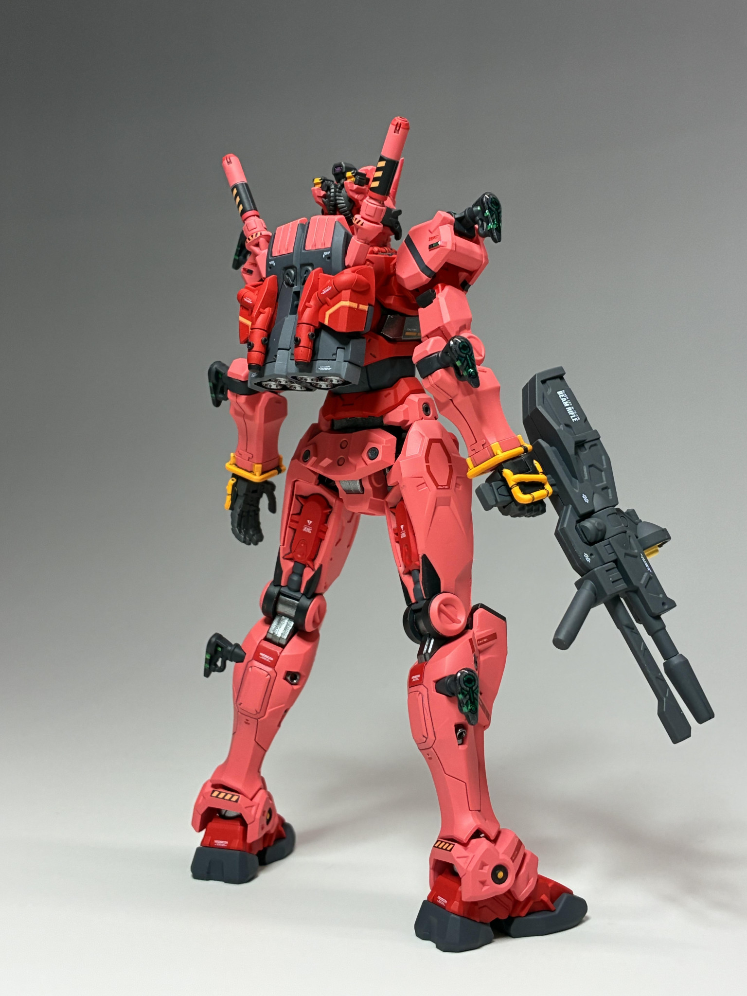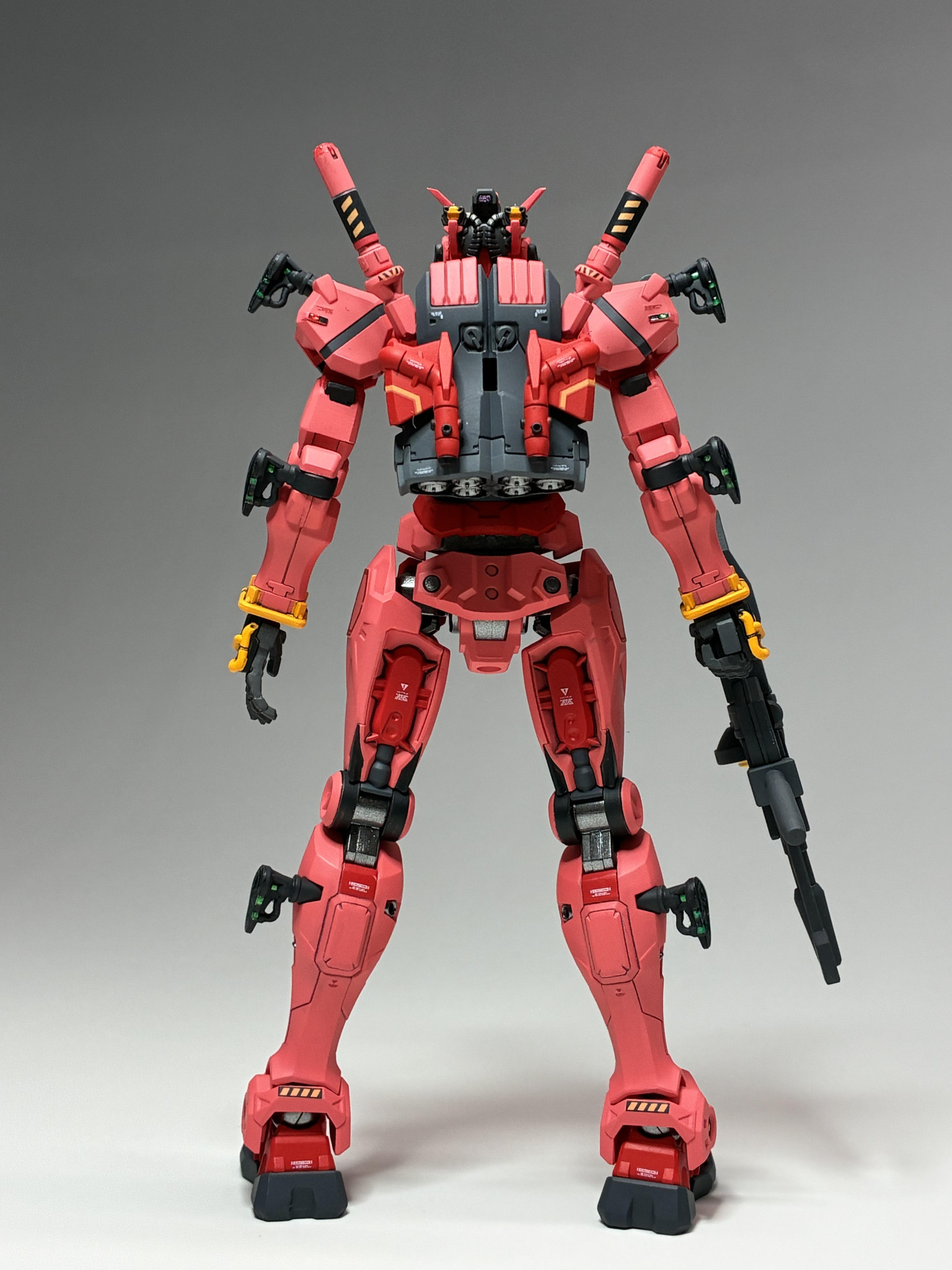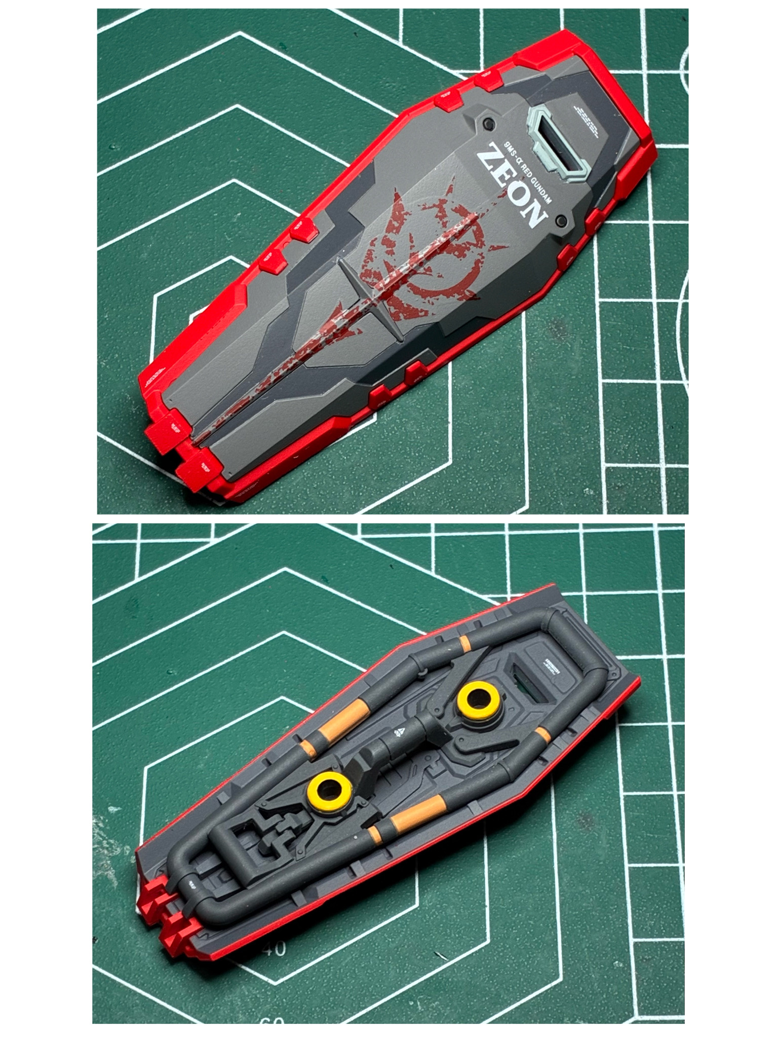 バックパックは、バーニアの部分を金属色に塗り分け、蛍光クリアを内側に塗布して仕上げています。サーベルの柄部分も地味に赤・ピンク・黒の塗り分けが必要でした。