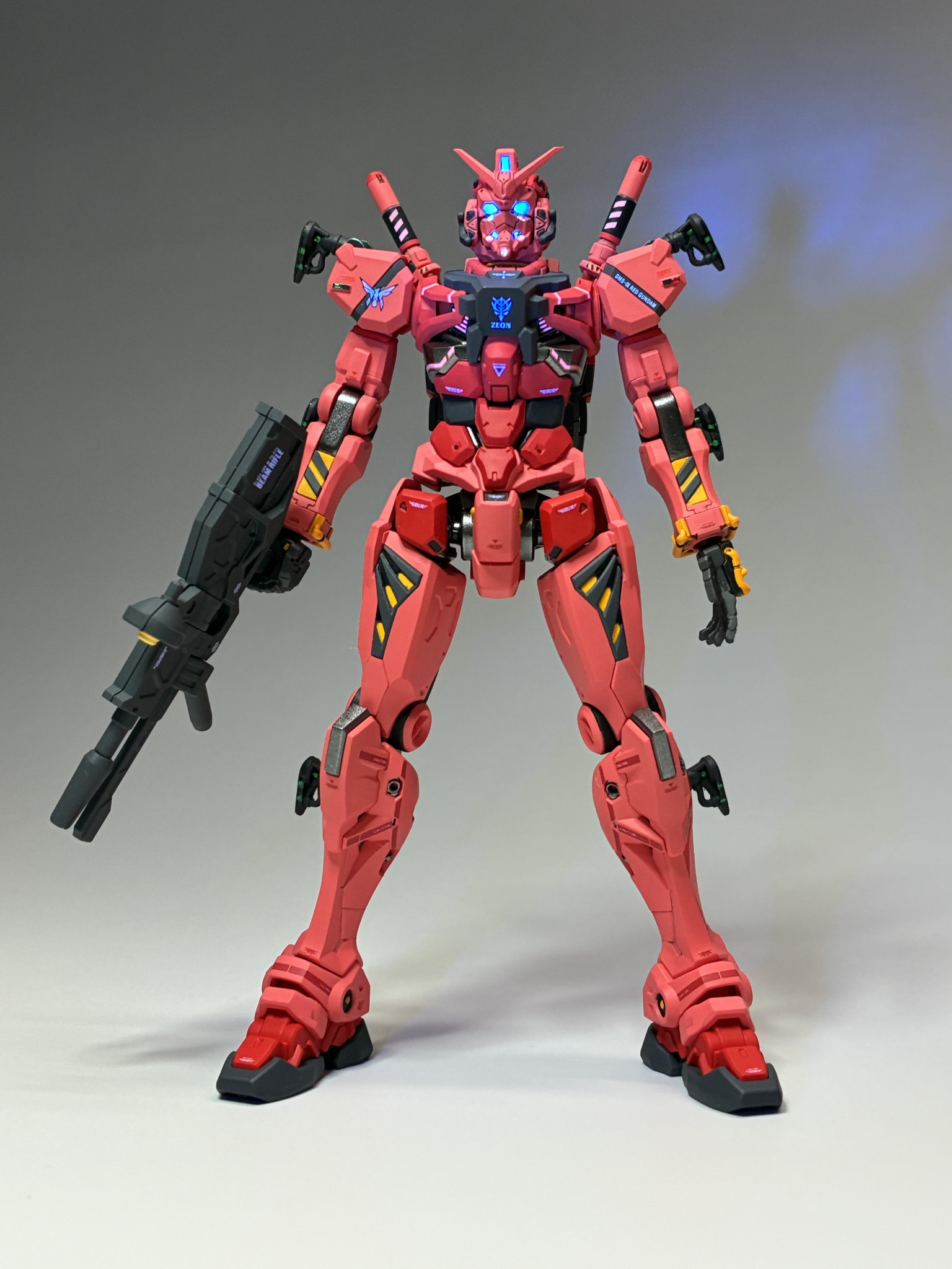 ピンク部分は、後で知りましたが、成形色には蛍光素材が練り込まれてるようで、ブラックライトに反応しました。とはいえ、もう少し赤くしたくて、調色して全塗装しましたが、最後のフラットクリアをかけた結果、白っぽくなり、ほぼ成形色と同じ色味になってしまいました。クリア掛かを想定して、もう少し赤くしてもよかったです。