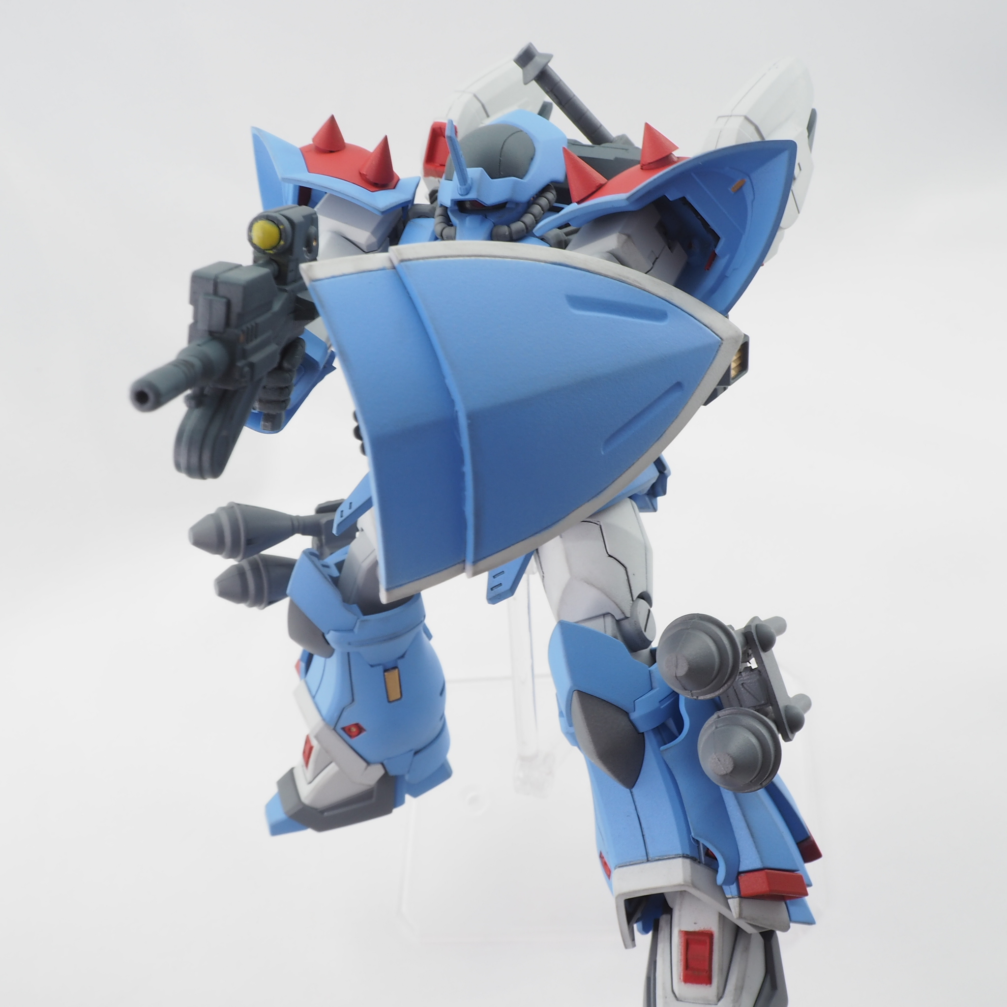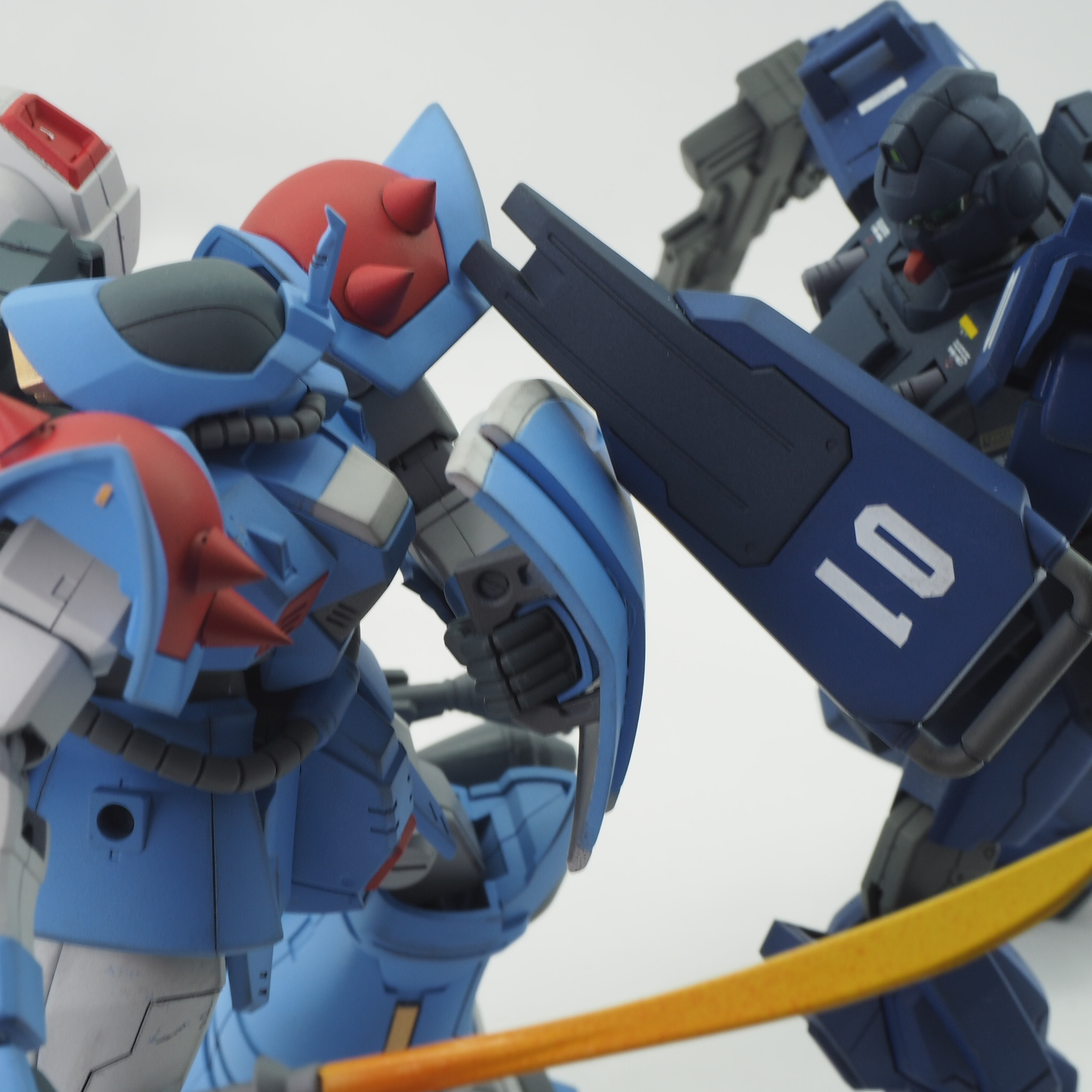 アクトザクのビームライフル、ゲルググベースのショートシールドを装備させ、正史で搭乗する2号機に近い装備にしています。