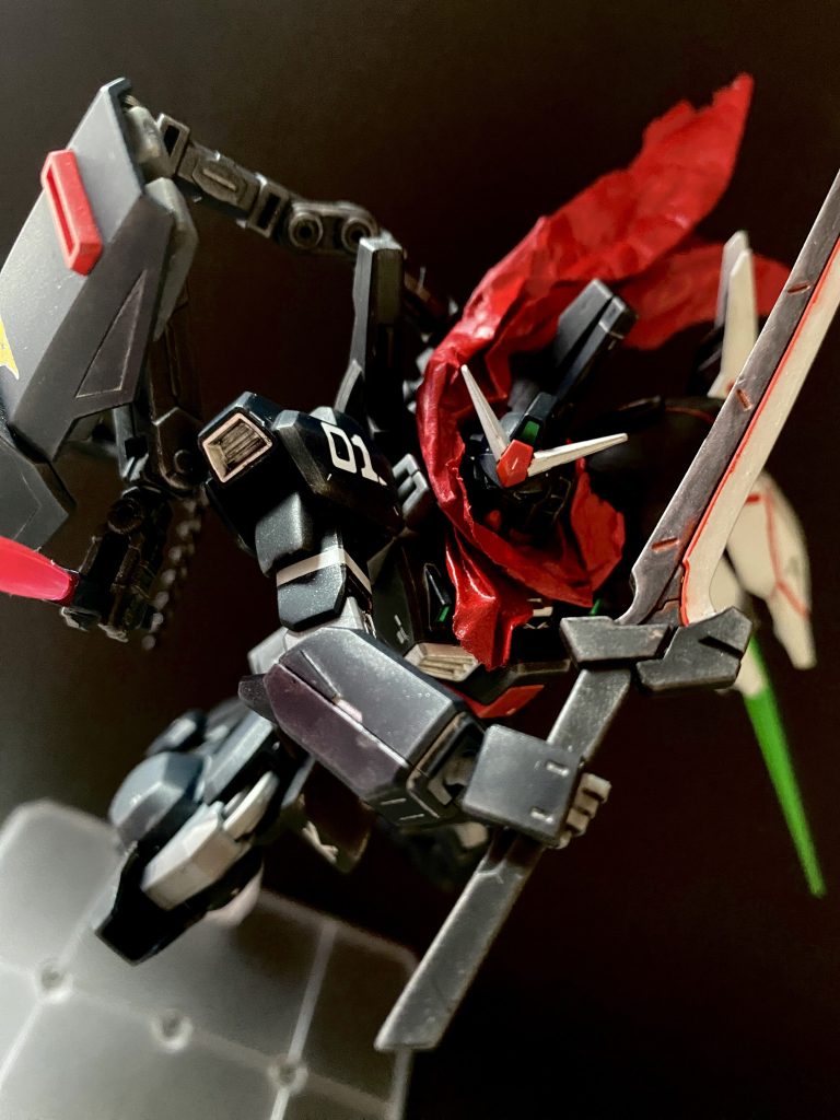 子どもの頃カッコいいと思った要素、赤いマフラー(ボロマント)、アシンメトリー、デカい腕、ツメ、封印の鎖、刀、侍、忍者、和風、黒いガンダムをふんだんに詰め込んでいます笑