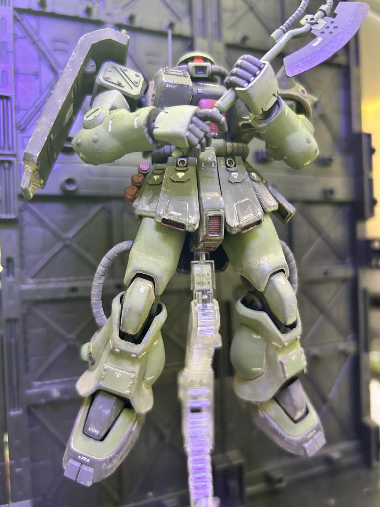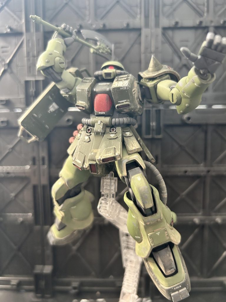 胸部と脚部の装甲追加や、リアスカートのブースター追加など素晴らしい改修ですね(zaku-kao2)ウェザリング具合もいい塩梅で、歴戦感出てますねー。ザク改はやっぱりいいですね!魅力引き出すディティールと塗装素晴らしい。