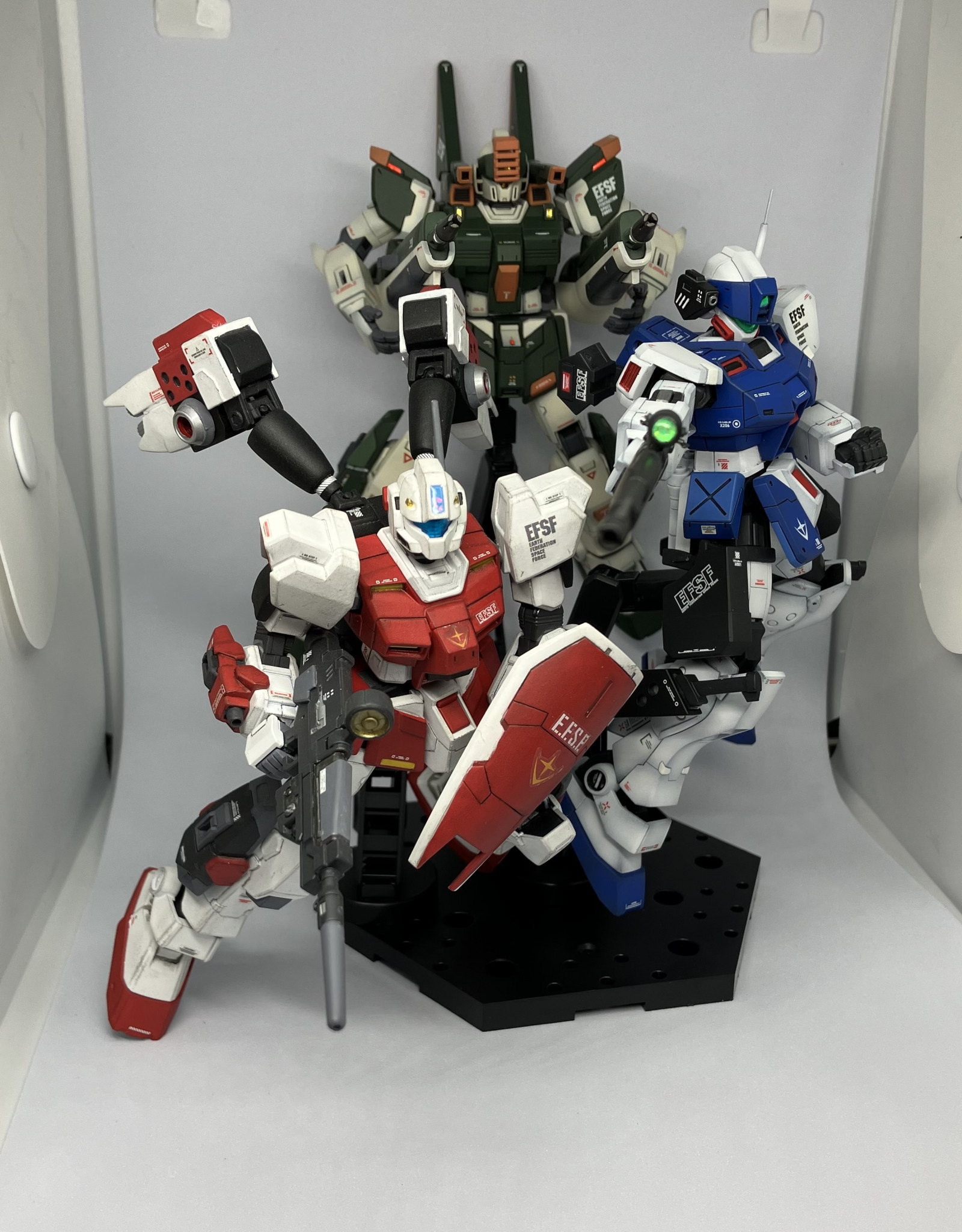 三機の作成間隔が開いているのでディテール等に統一感があまりありませんが、長年形にしたいと思っていたジム小隊が完成したので満足しています😆