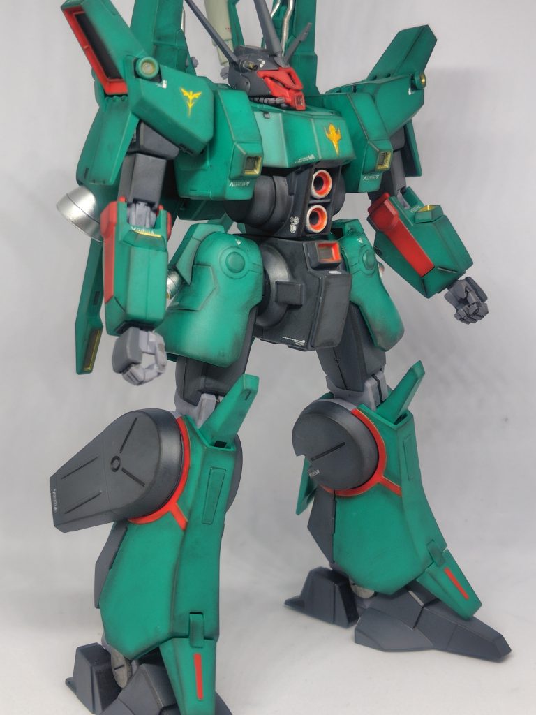 全身至るところのバーニアと赤ラインの色が足りないのと目立つパーティングラインが多く、部分塗装派には大変なキットでしたが合わせ目は少なく見た目のわりに可動も良好なキットでした。エッジを中心にウェザリングマスターで汚しつつ成形色の彩度を落としました。