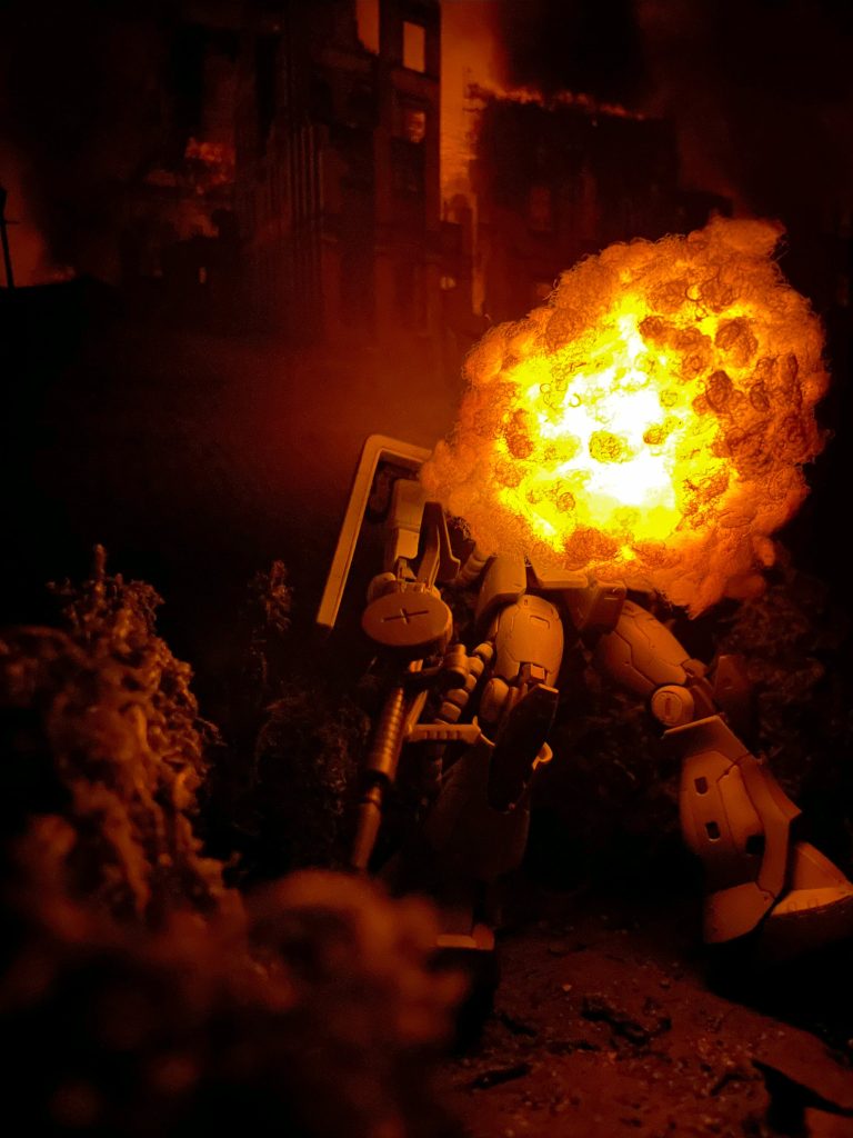 "Feddies finally got themselves a mobile suit...!" ビームライフルに撃ち抜かれ爆発炎上するゲルフィのザクをイメージしています。