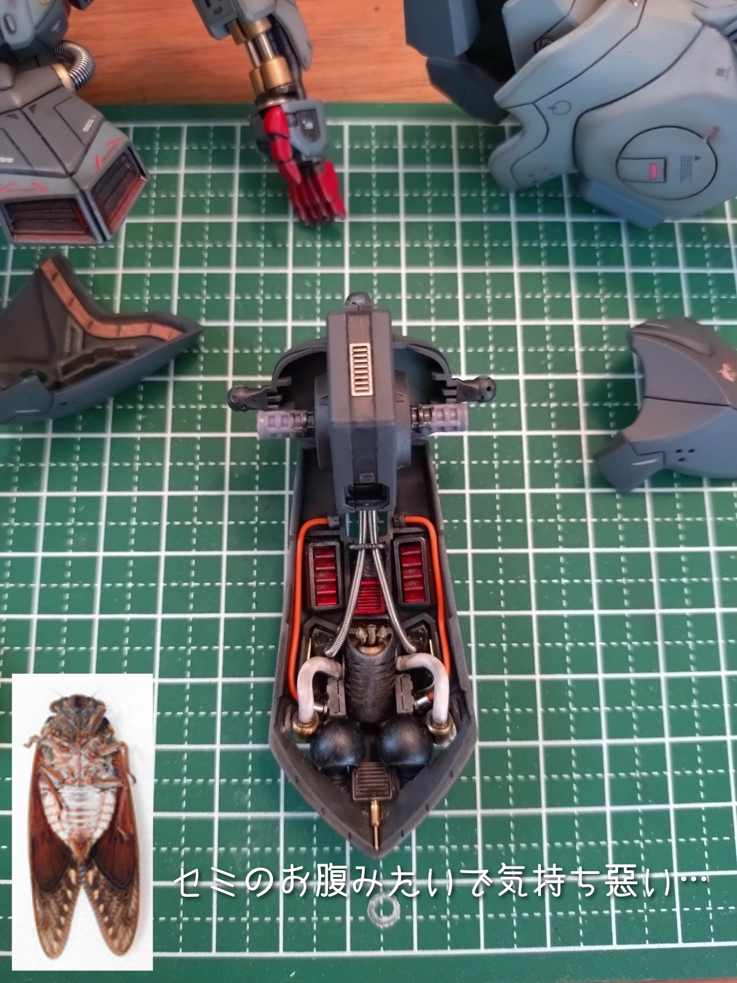 お腹から飛び出して正面ふんどし部で接続する動力パイプは脱腸のようで好みではありません。後のサーベル差し込み部から前に回り込むように変更しています。このパイプ回しはお腹周りがスッキリし、かつ可動枠が広がるので気に入っております♪