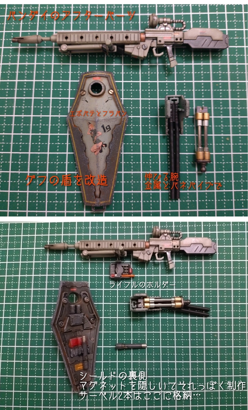 それに余っていた「グフの盾」をリメイクしました。それは「手から撃つやつ=皆グフ」と単純構成の脳細胞がそう指示したためです。その盾裏に「ビームサーベル」を入れ込みましたので、背面の空いた2つの穴は「動力パイプ系」と「何かのパイプ」にあてました。