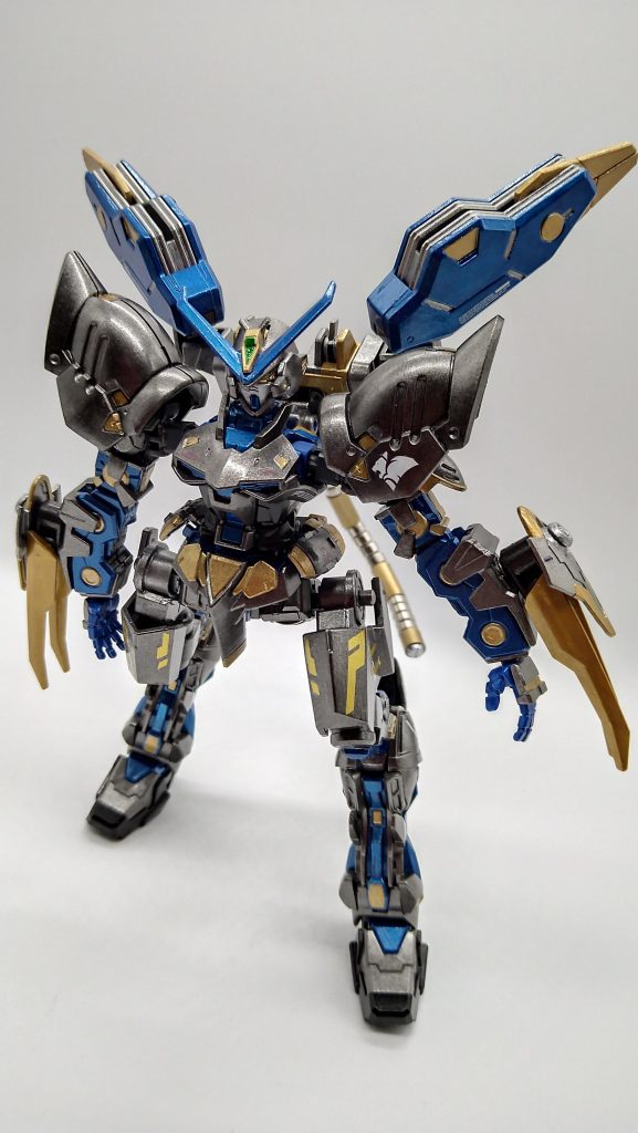 今回使用した機体は、アストレイブルーフレーム、グレイスリッター(脚の一部)、ガンダムグレモリー(肩)、ブレイディファントム(爪)、30msオプションパーツ(手甲)、ガンダムエアリアル改修型(バックパック)です。
