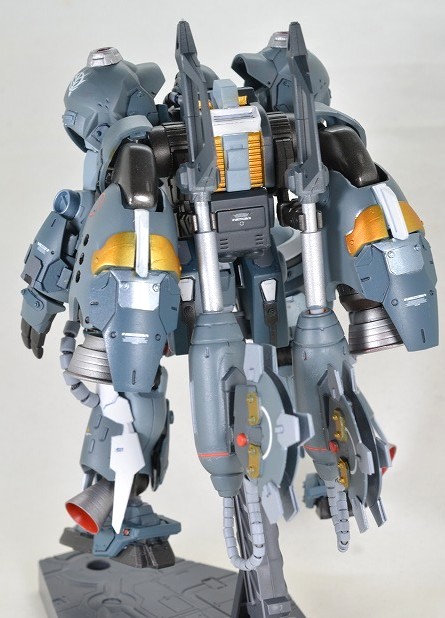 背面です。デミバーディングのバックパックをベースに作成。ジークアクスの世界では、なんとなく背中のブースターはMSの脚部を流用しているイメージなので、大型のブースターはハイゴックの足をベースに使用しました。