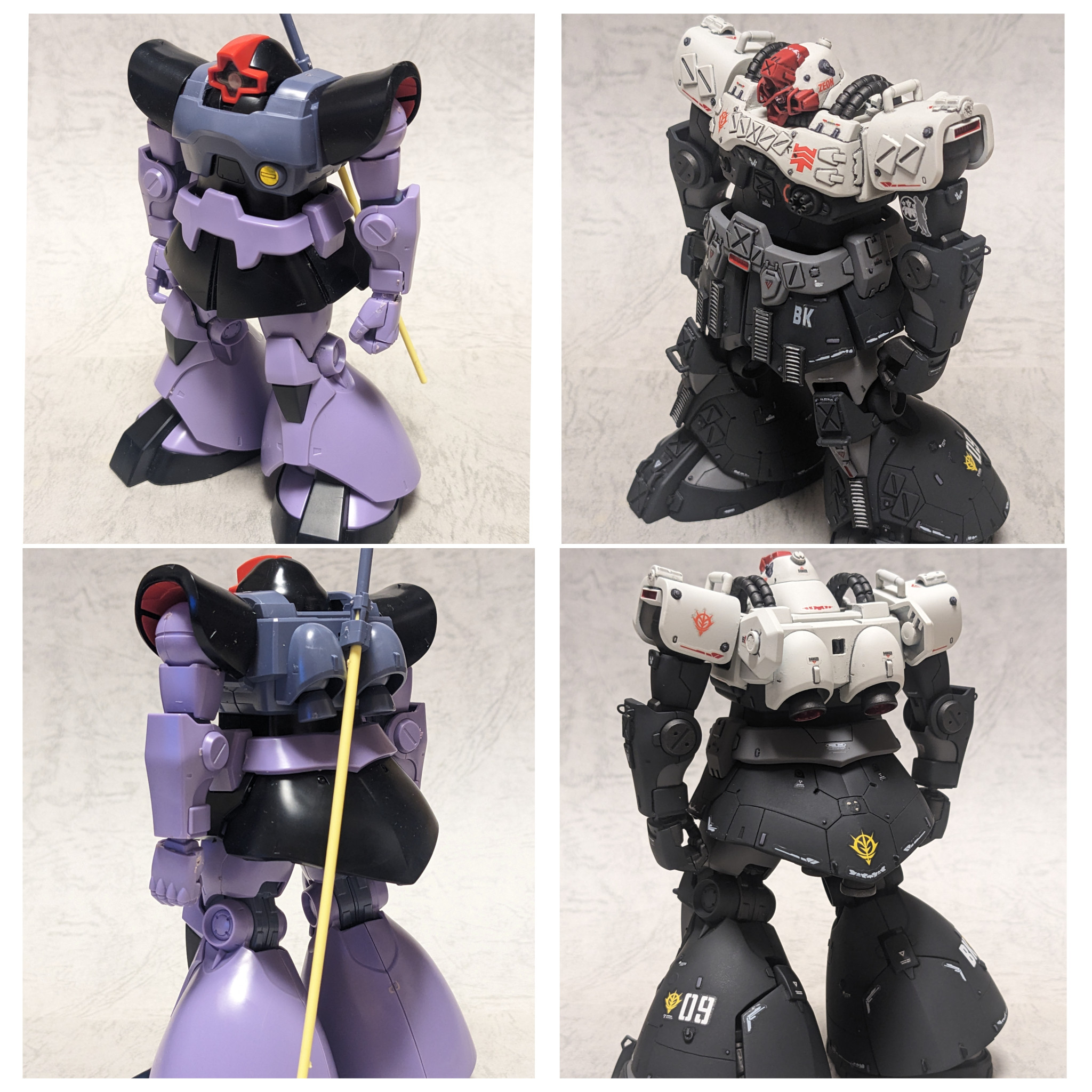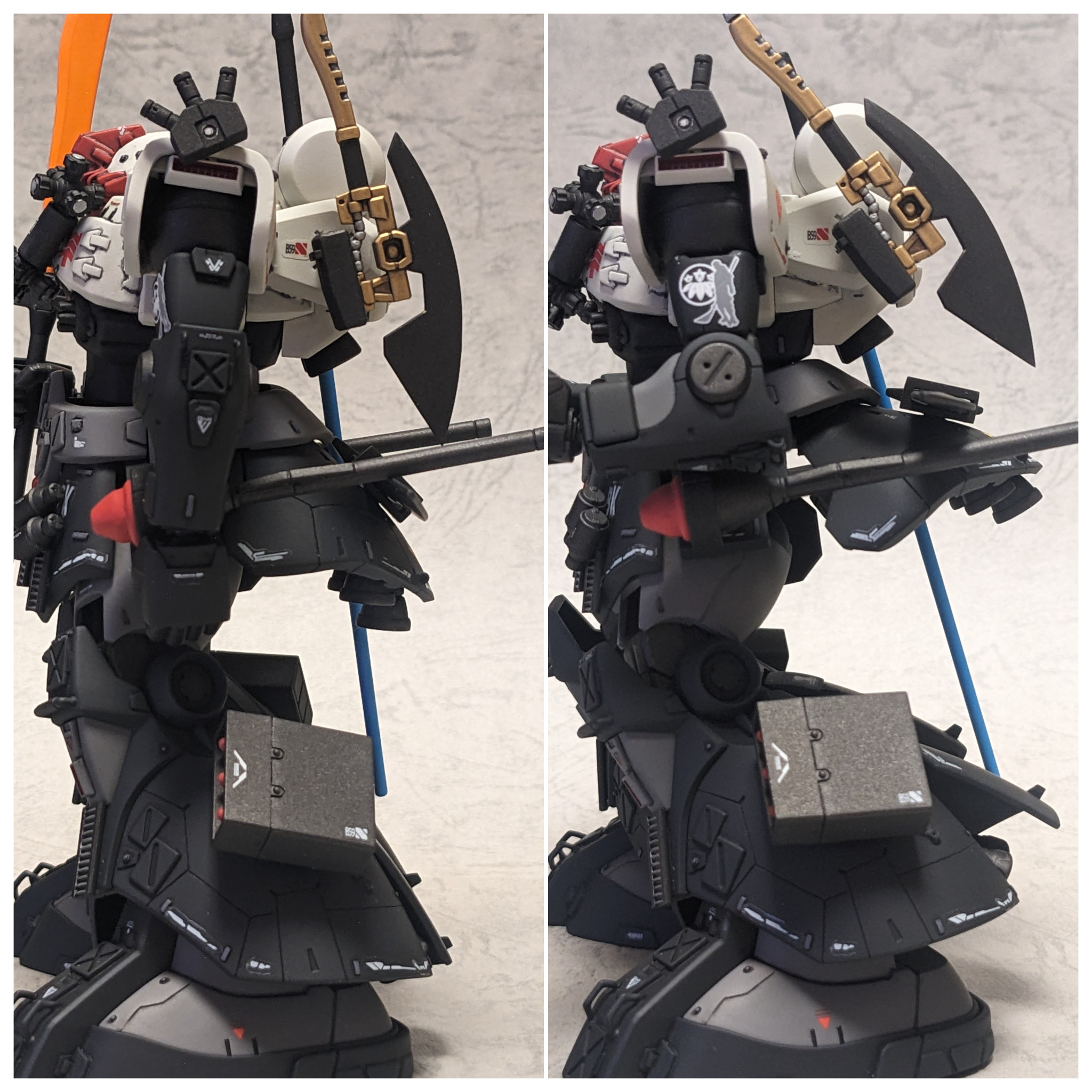比べてみるとこんな感じ。このリアスカートの可動のために背部追加プロペラントタンクはドワッジと違い上に付いてるという設定になってます。