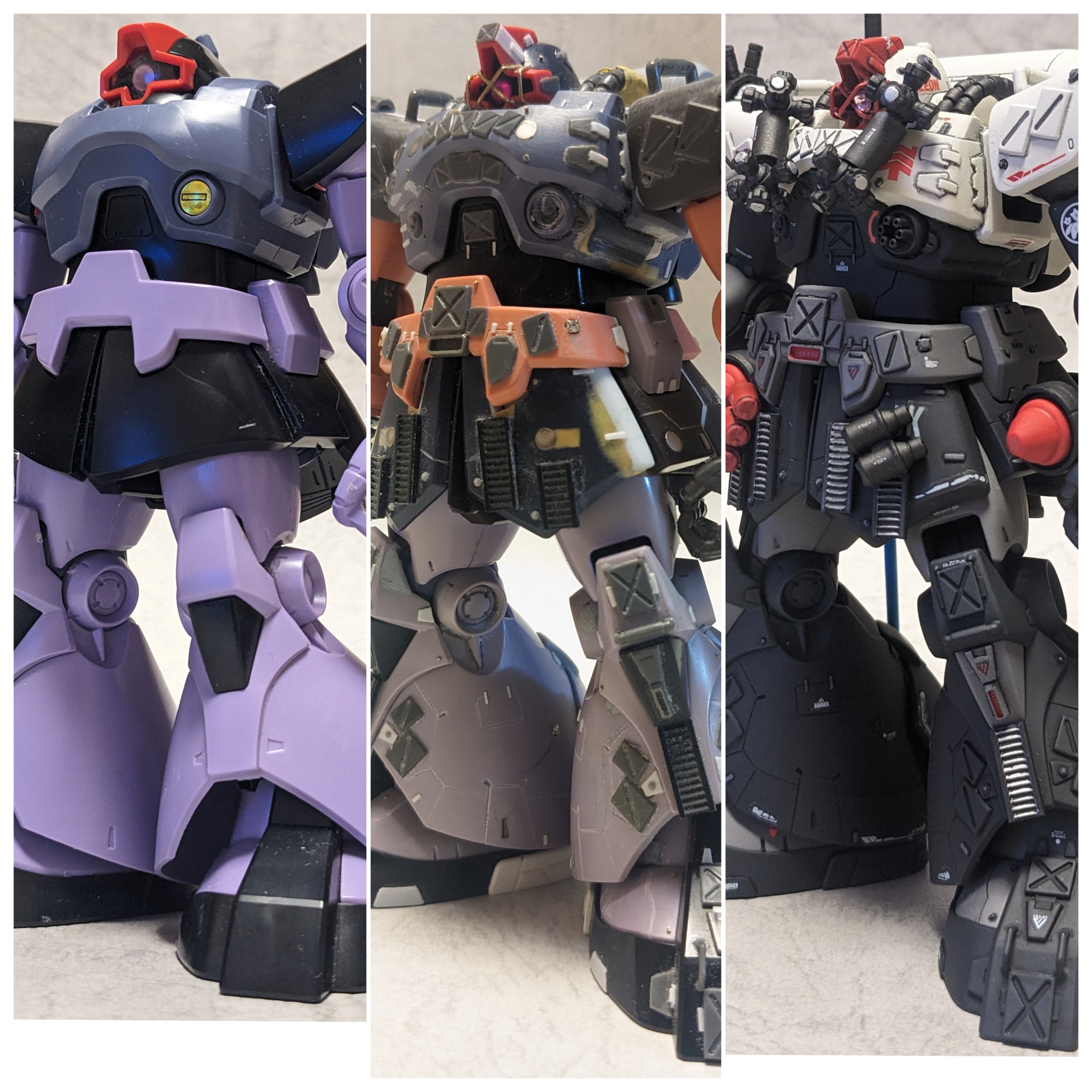 hgucドムとの比較。今回筋彫りは結構頑張りました。真っ黒だと目立たなくなるので黒いパーツはジャーマングレーを使いました。