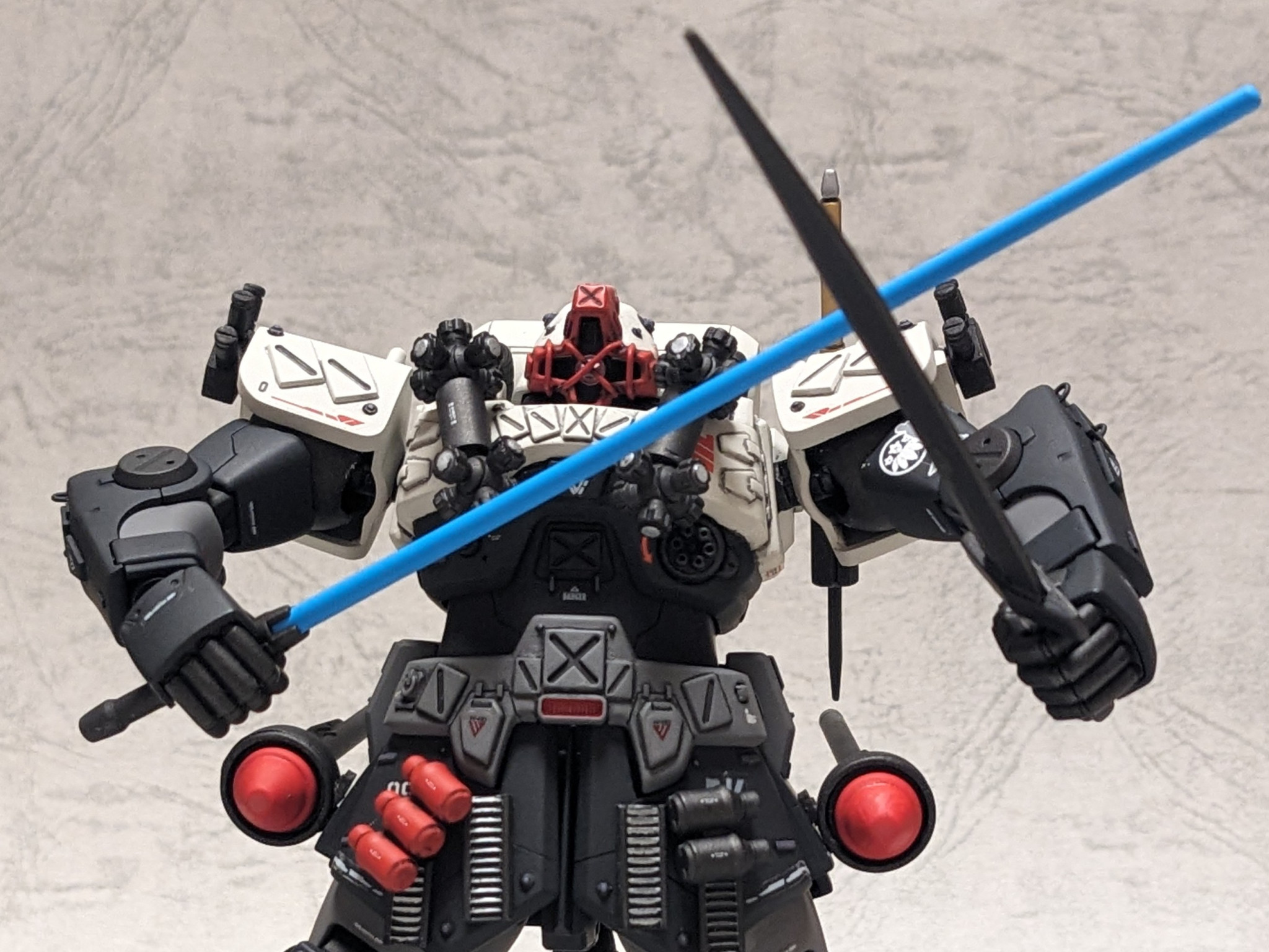 いくつかポーズを取ってみました。まずは、二刀流!ヒートサーベルはも少し薄い青にするつもりでしたが、混ぜて出来た色がこんなんだったのでそのまま塗っちゃいました。