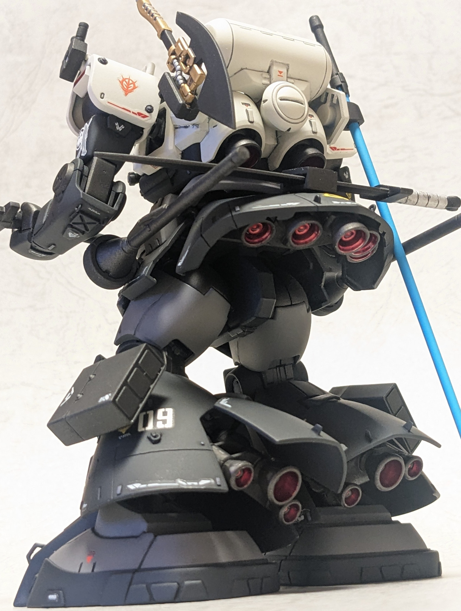 というわけで後ろ姿はこんな感じです。リアスカートの中の5連バーニアはリックドムⅡの物です。バーニアの中は他のパーツと違い艶ありになっていて、アクセントになってます。