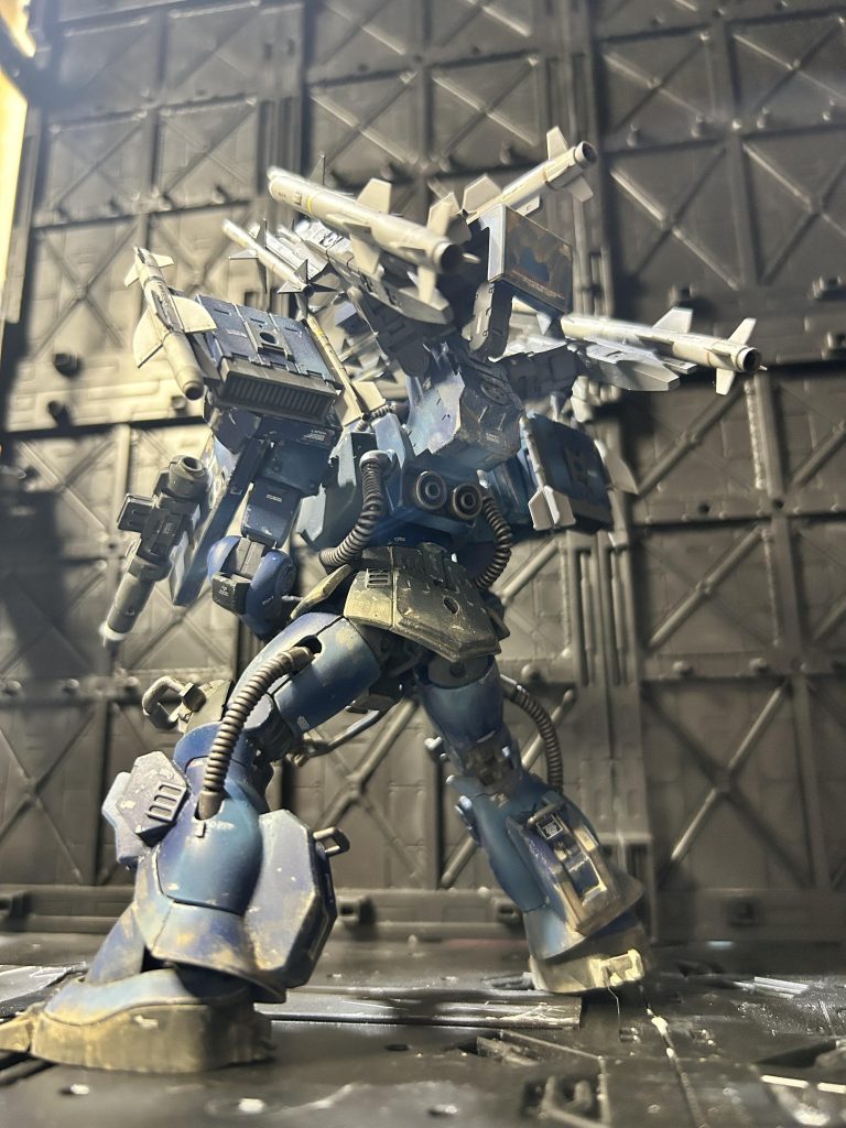 なんと勇ましいザク!!全弾トラブルで射出されなかった時は空の彼方へ消えて行きそうですね^^;友軍にも敵軍にも『あの青い鶏冠のザクには近付くな!!』と言われてそうな特務感満載のザクですね!!撃ち放った後も汚れを見るに相当手強そうですよ!!ただのザクじゃないっす!!きっと『あのザク軽くなってからも厄介なんだ、、、夜間はあの武装で基地襲撃だろ?見張りが見つけた頃にはヤツに機体も基地も着弾されてるんだ。倒すなら日の有る日中しか無いが暗い時間帯しか現れない、、、あぁ明日は俺が見張り番かぁ”青い鶏冠”来ないと良いな、、、』って死亡フラグな連邦兵の声が聞こえてますw