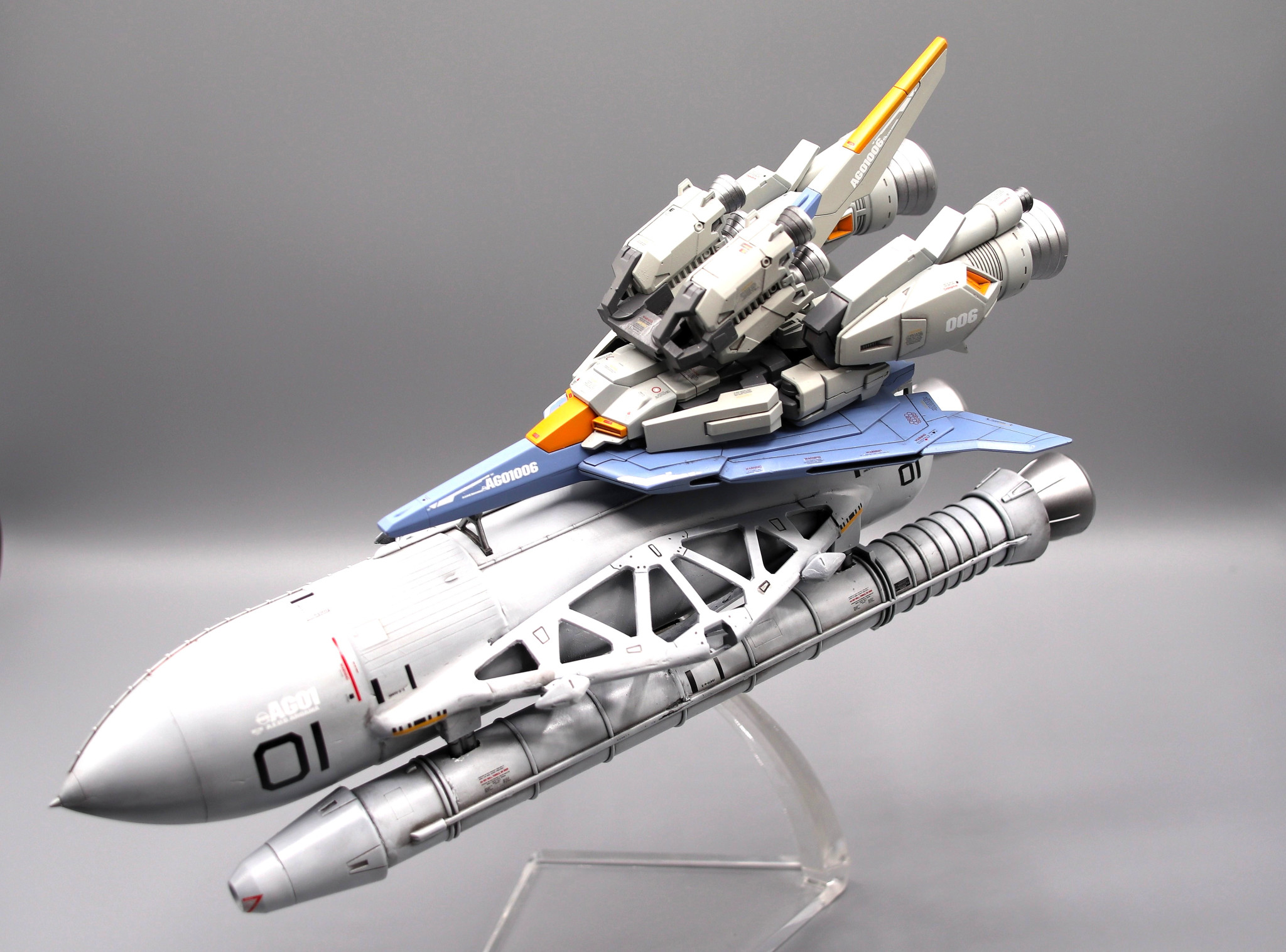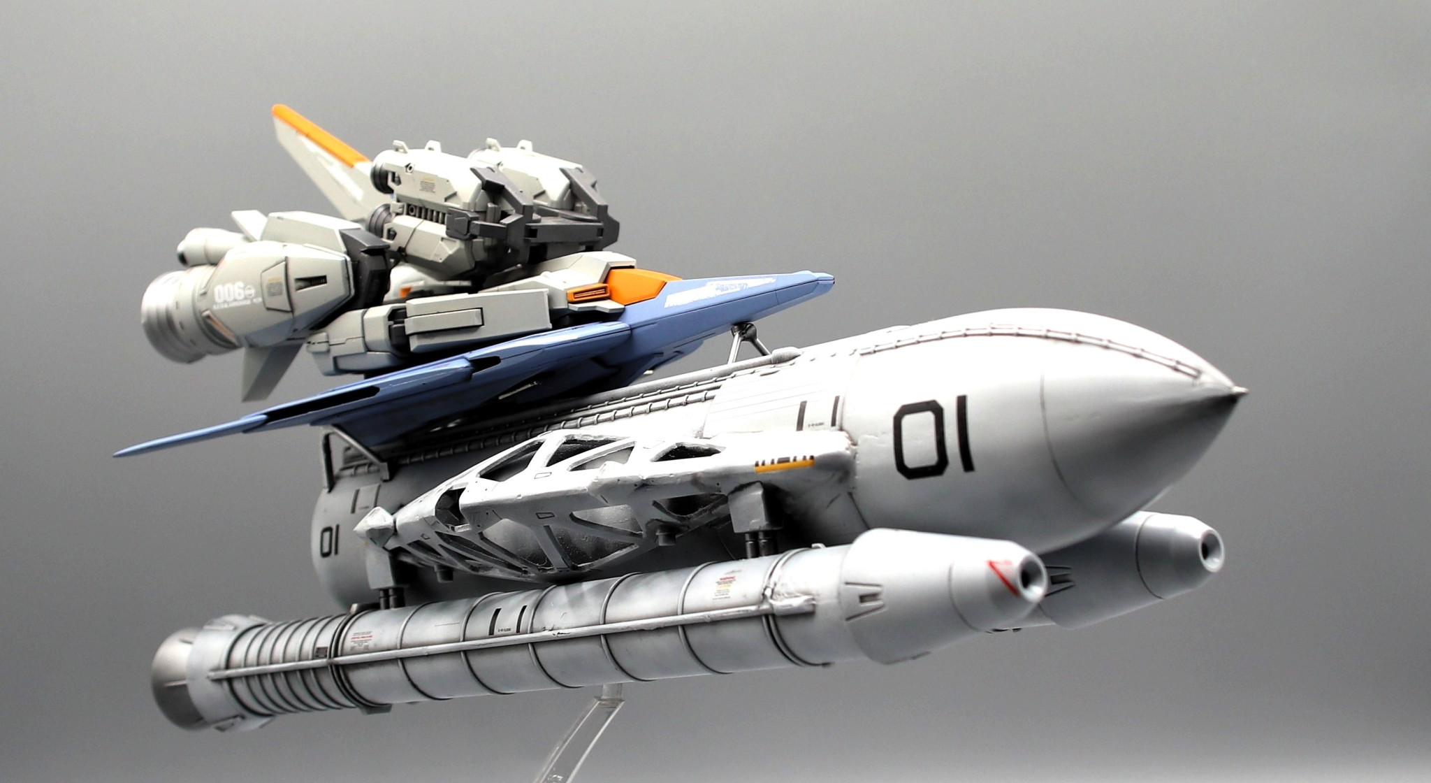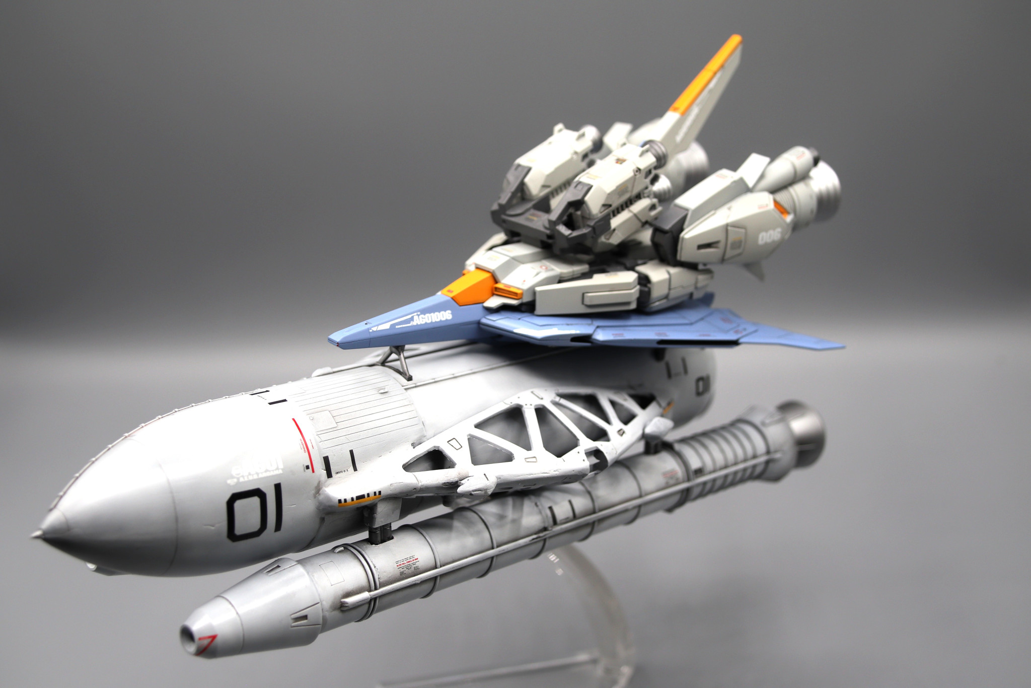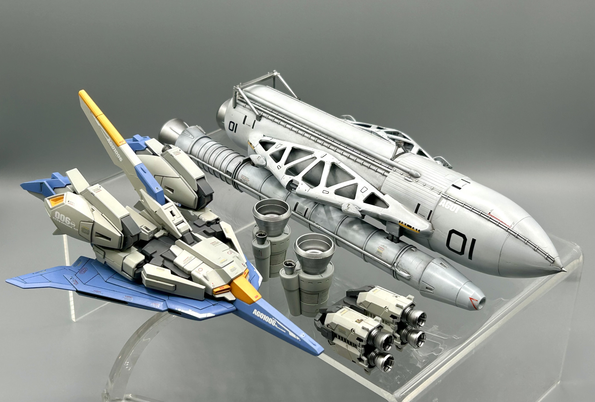 男のロマン、スペースシャトルを彷彿とさせるブースター、zガンダムのウェーブライダーに似合って映えますね。宇宙に飛び立つことも惑星間移動もこなしてくれそうです。もちろん塗装や細部の仕上げも素敵です!