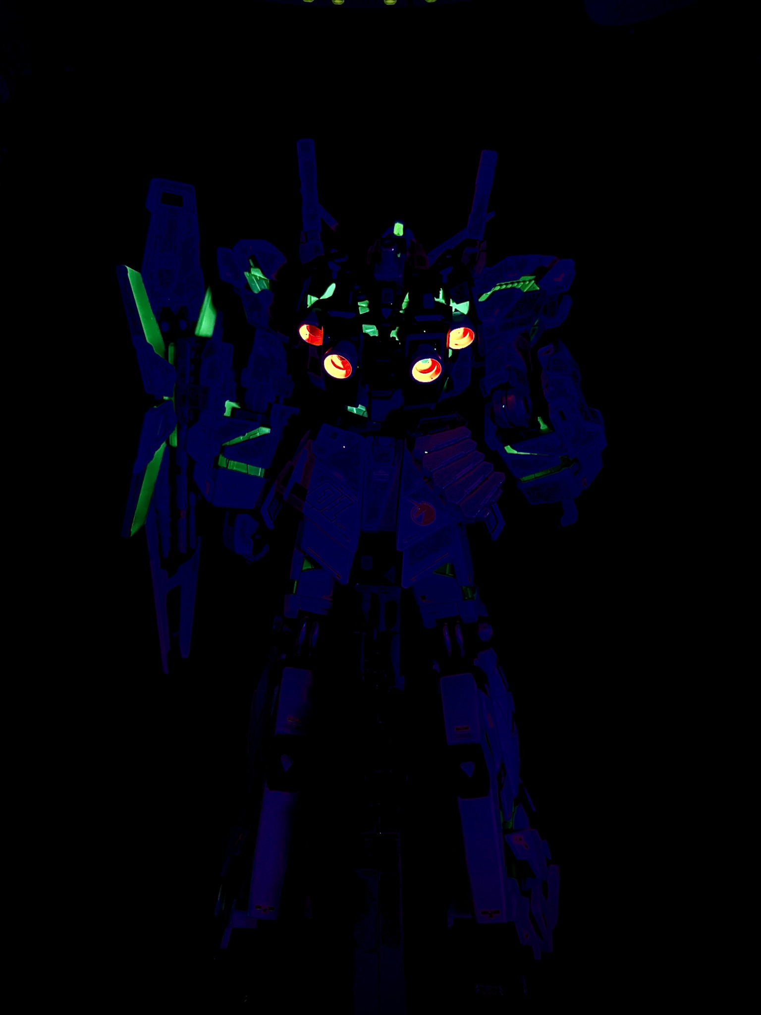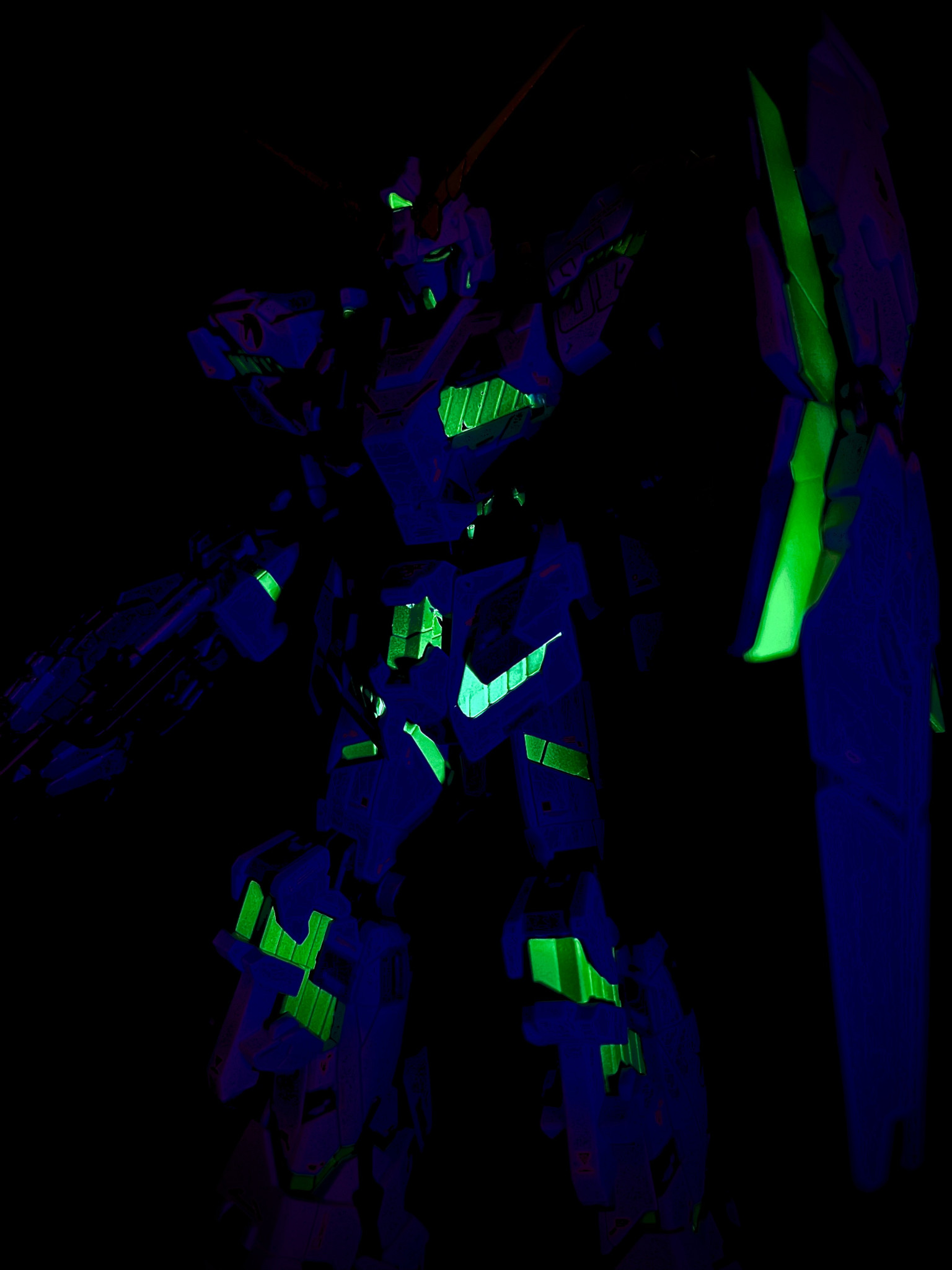 これが見たくて赤のクリアパーツをわざわざ下地Ex-ブラック→スターブライトシルバー→蛍光クリア→クリアグリーンで緑に変更しました。