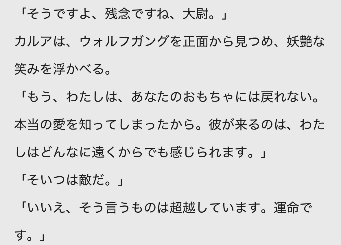 カルア奪還っ!!ナイス少佐、良くピリ付く空気感の中動けました!!カルアへの占有欲が戦場の皆を上回りましたね!!最後、カルアの良い事思い付いちゃった的な無邪気な笑顔素敵でした!!正座では無く残業終わり至福の読み物でした(*^▽^*)!!