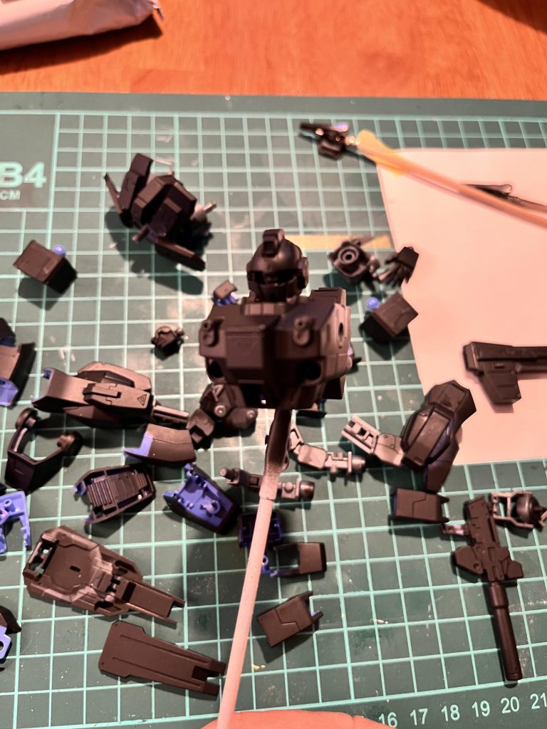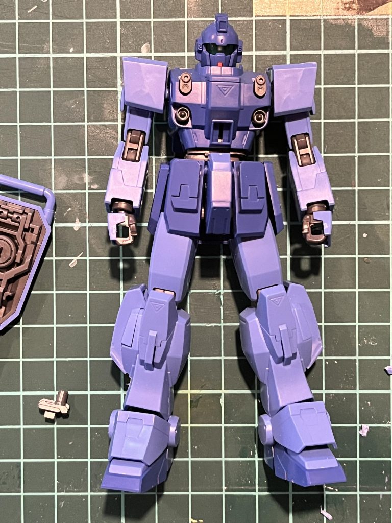 キットを素組みしてみると意外とムッチリガッチリしていたので、肩と腕の突起部を削り落とし、腰のマガジンも削り落とし、脚部スラスターもオミットして、軽めにしてみました。