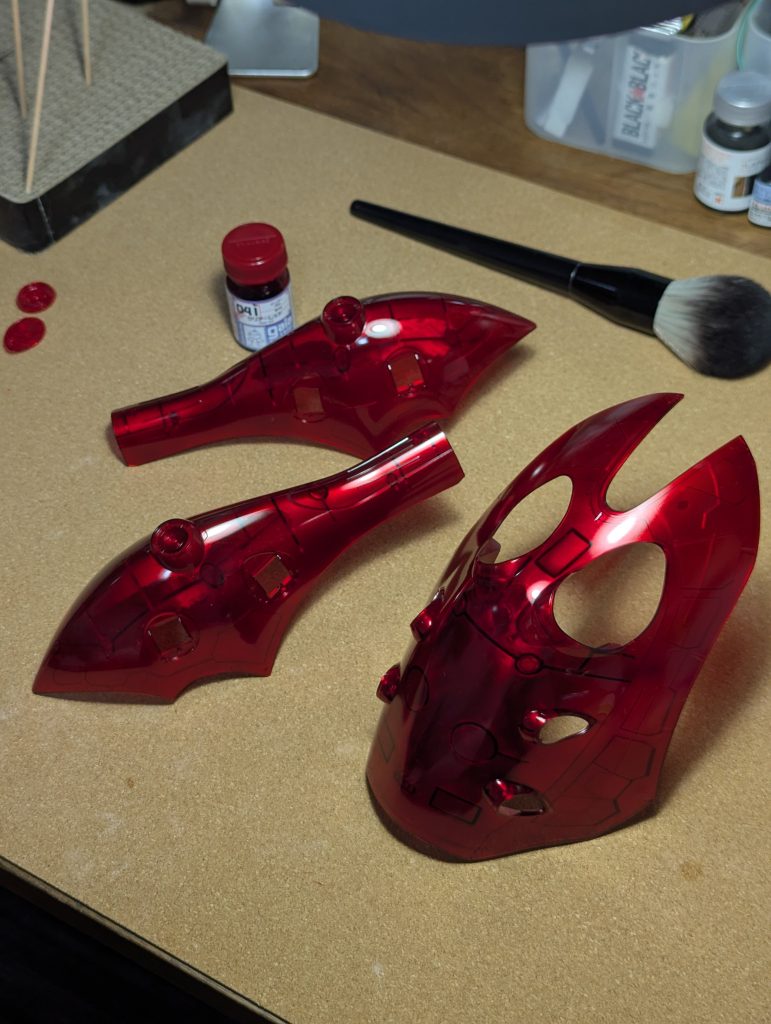 盾の黒のテラテラ塗装に1番苦労したよ!塗料が溜まって個々の粉末が表面張力で結合した瞬間のギリギリ加減が難しかった!吹きすぎて何度も液だれしては、ヤスリで削ってやり直した!
