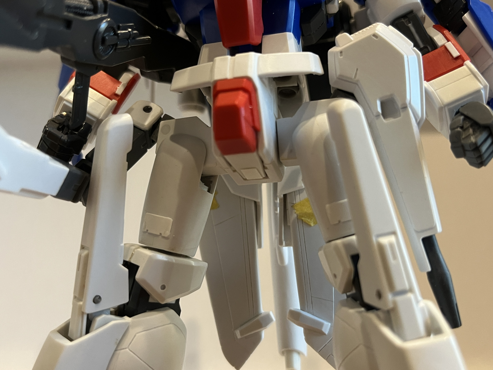 太腿下部の回転軸はキットのままだと斜めになってしまうので、ご家庭のガスコンロで熱してヒートプレスのようなことをしてプラ板を整形、水平に回転するようにしています。画像でもわずかに貼り付けた部分が見えるかと思います。