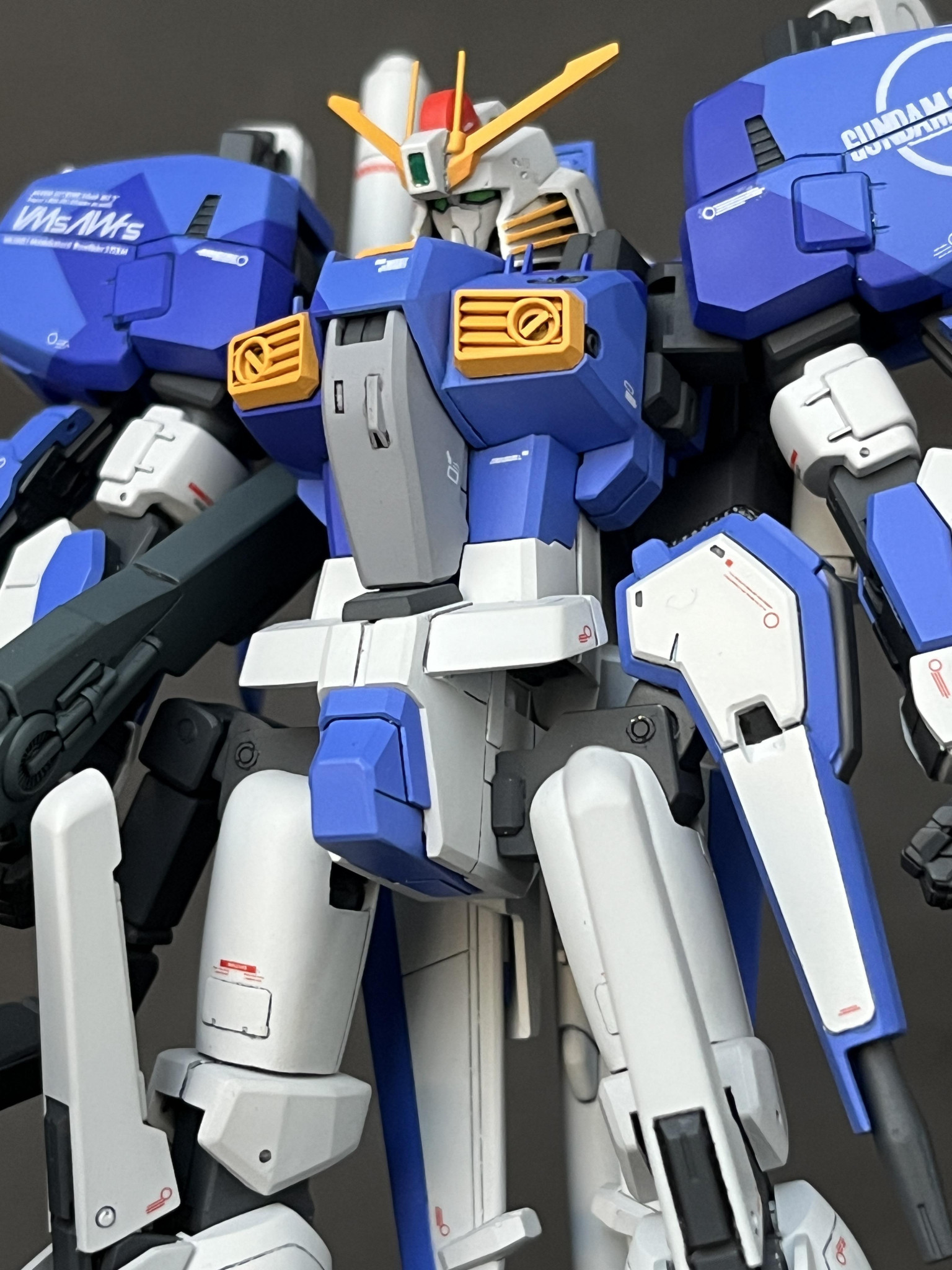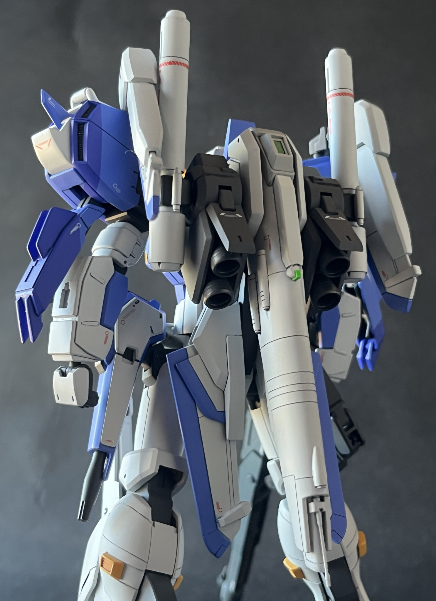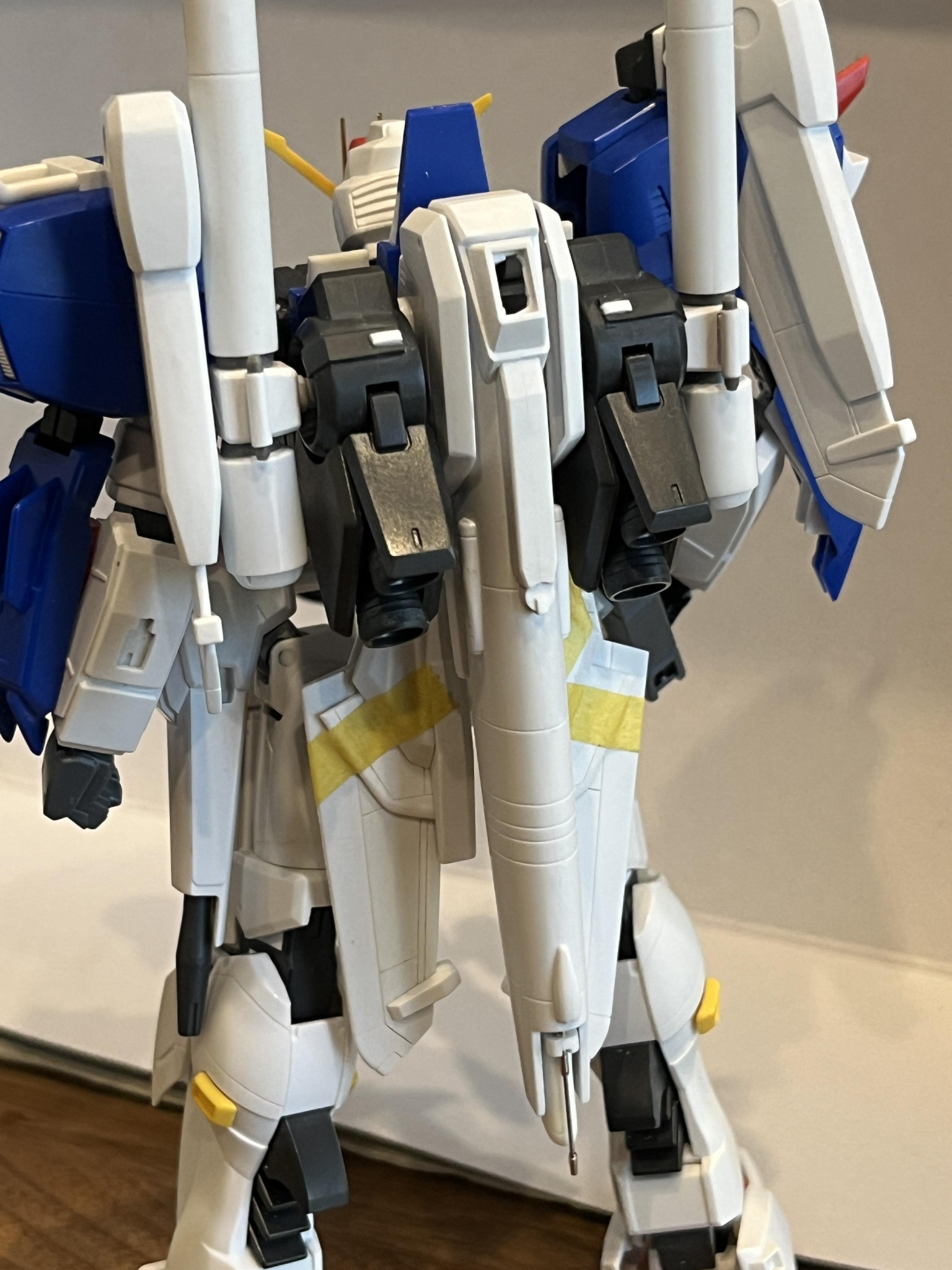固定だった腰後ろは左右独立して可動するようにしました。脚が後ろに引けるようになり、立ち姿が良くなります。羽根は旧作マスターグレードの物をフリマサイトで購入して大型化、元々のパーツも活用して設定通り二枚にしています。