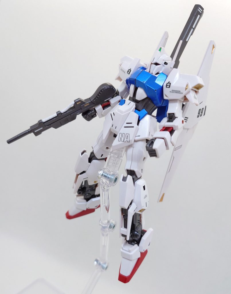 武器の合わせ目消しをした後に全塗装で製作しました。白部は白サフ→クールホワイト→ホワイトパールと3層重ねて塗装しています。そして全体的に光沢トップコートで仕上げています。今回は"百"デカールで"白"を表現できるかという事にチャレンジしてみました(gundam-kao6)