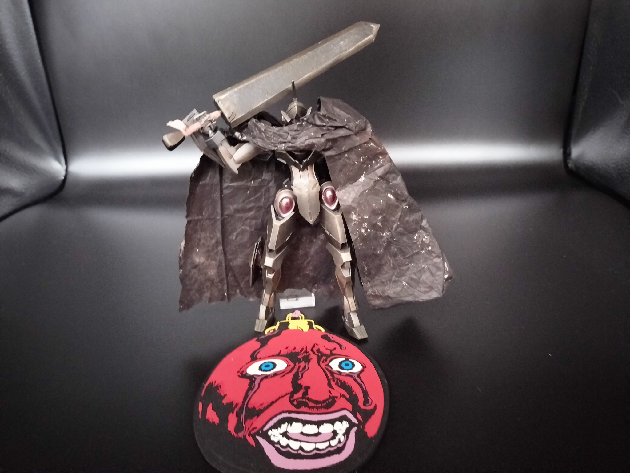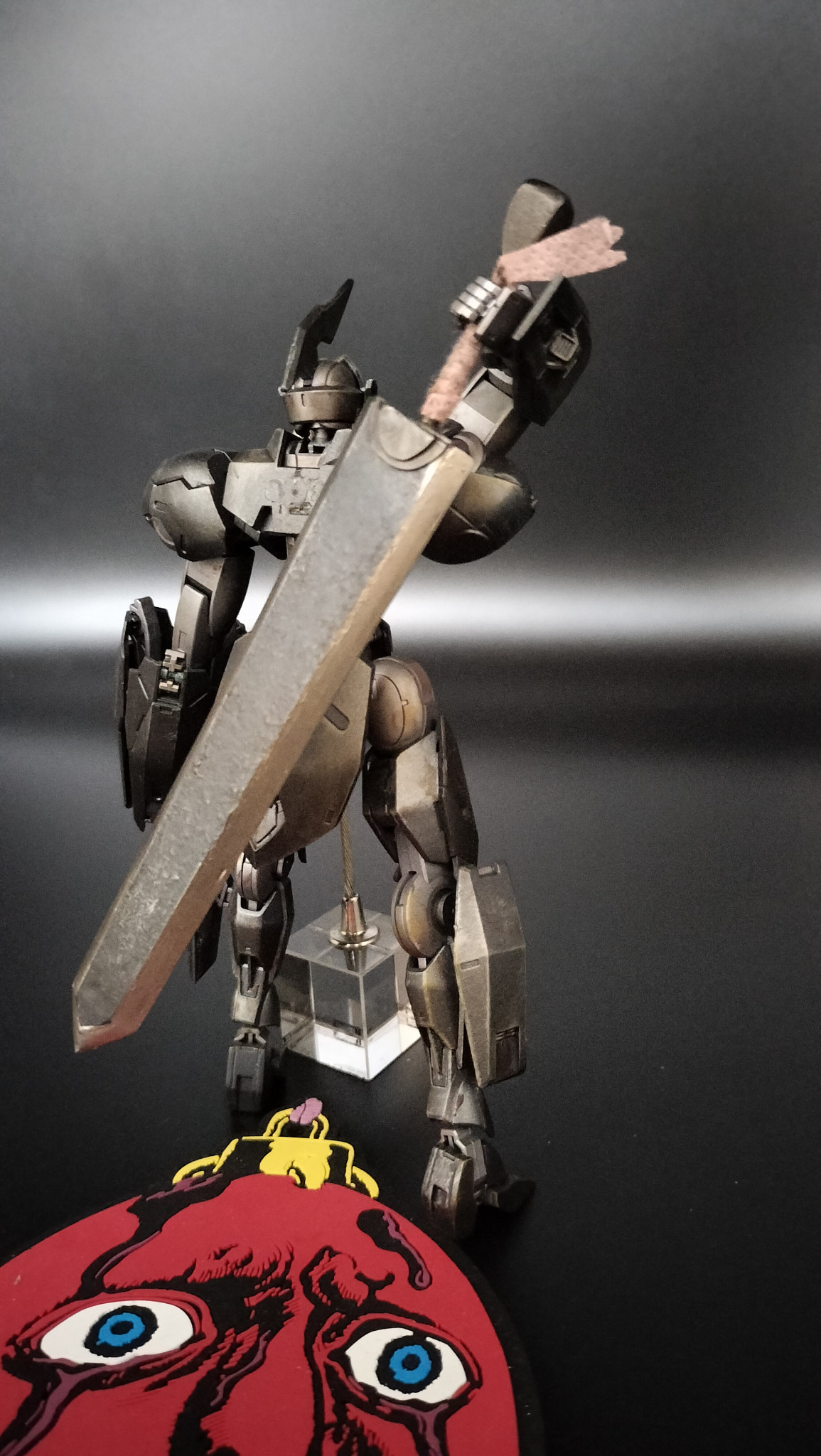 全身。渋沢さん2人前費やしゲットした足元のベッチーがチャームポイントです(gundam-kao7)大剣はYOUTUBEでpZeroさんの動画を参考に約1/14で作成。プラとパテの塊で思ったより重くなりましたが、その分しっかりした作りになったかとzaku-kao4)