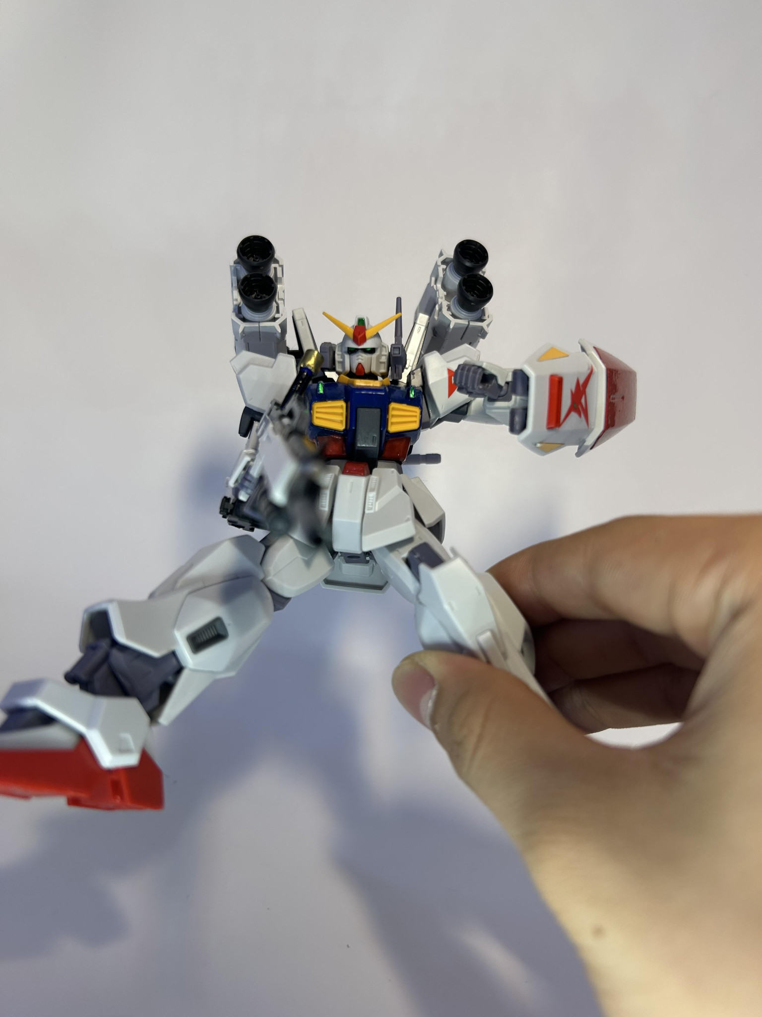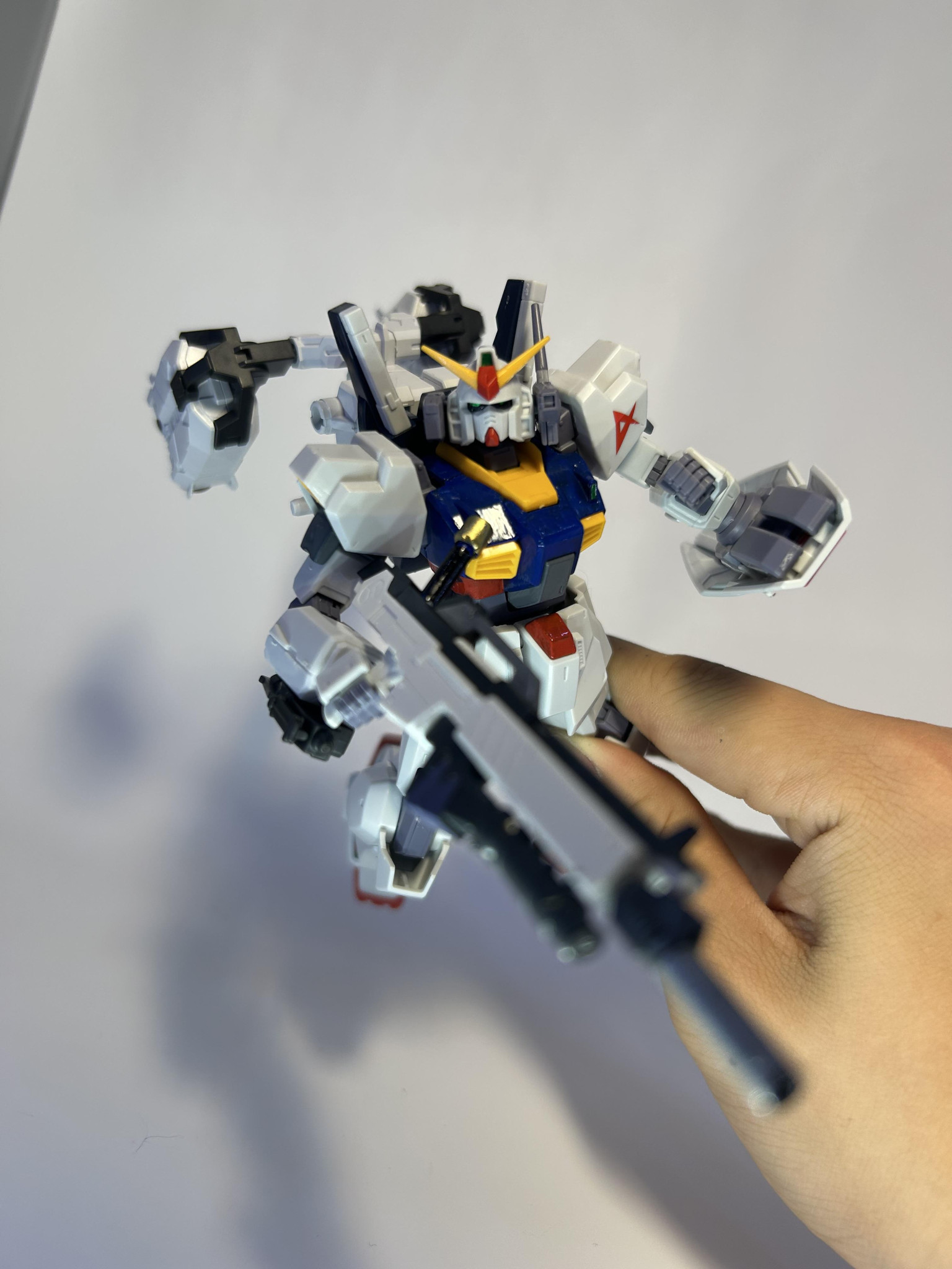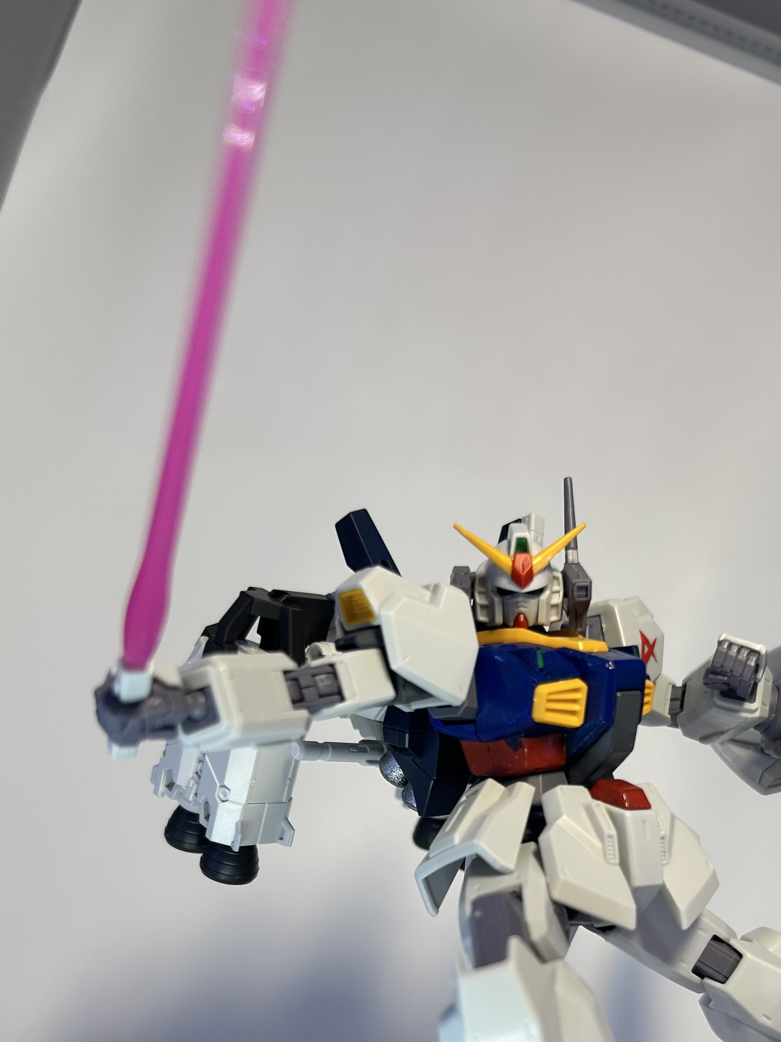 本体は筆塗りで簡単仕上げ、バックパックも大胆に改造したのですが全く見えていません笑 ライフルはνガンダムのライフルをジャンクパーツで改造しました。それ以外は何もしていないです