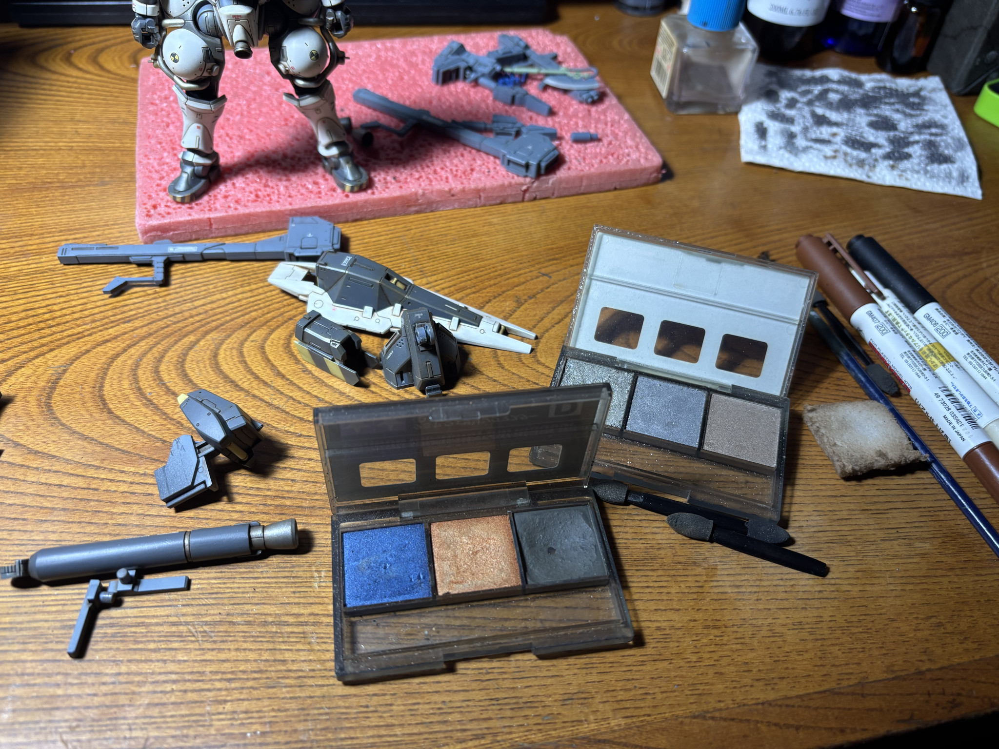 ▲制作過程5 ウェザリング中の一枚 今回は実験機想定なのでススやオイルの汚れに絞って汚したくて リアルタッチマーカーとウェザリングマスターのみの超お手軽汚しにしました