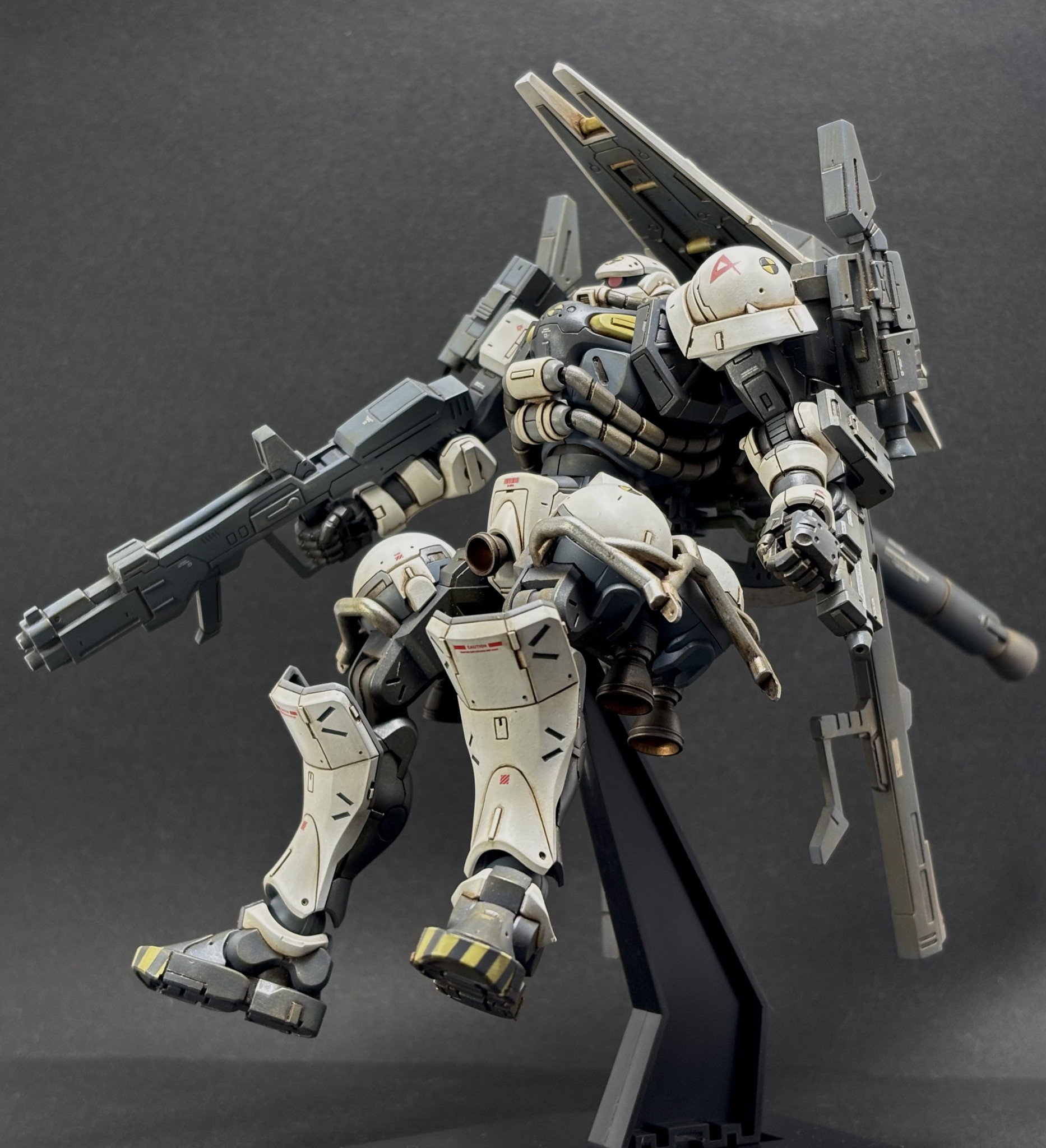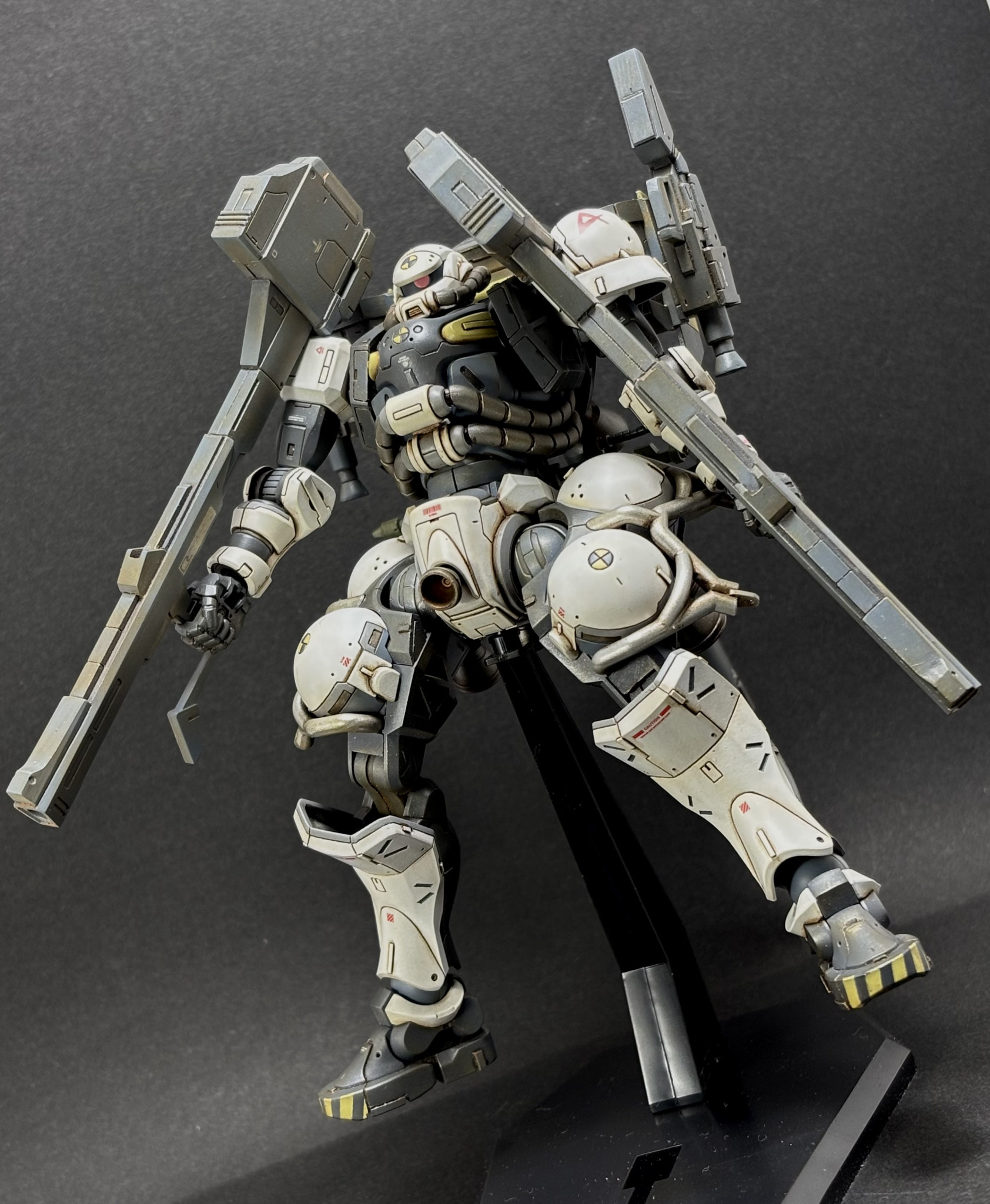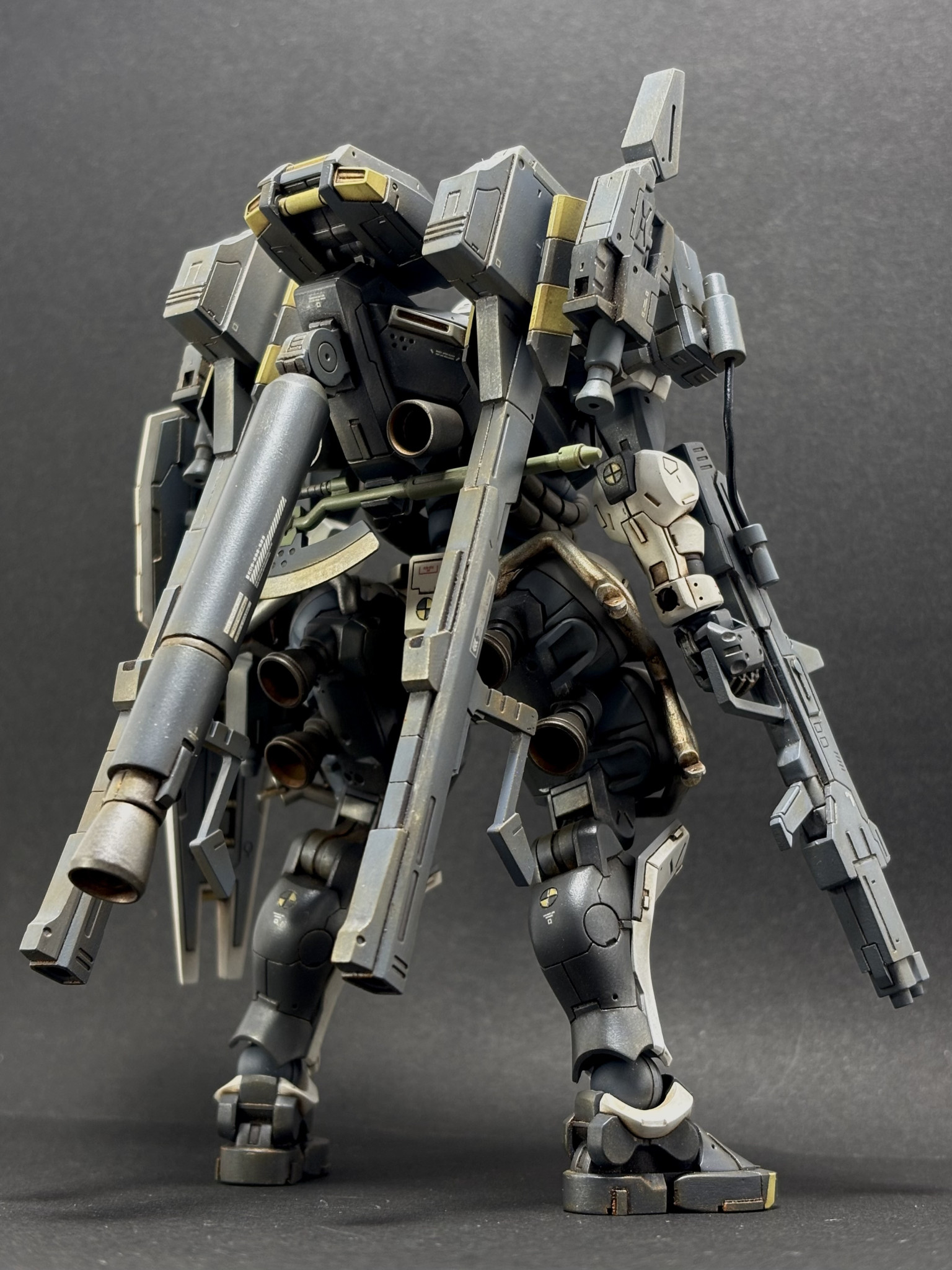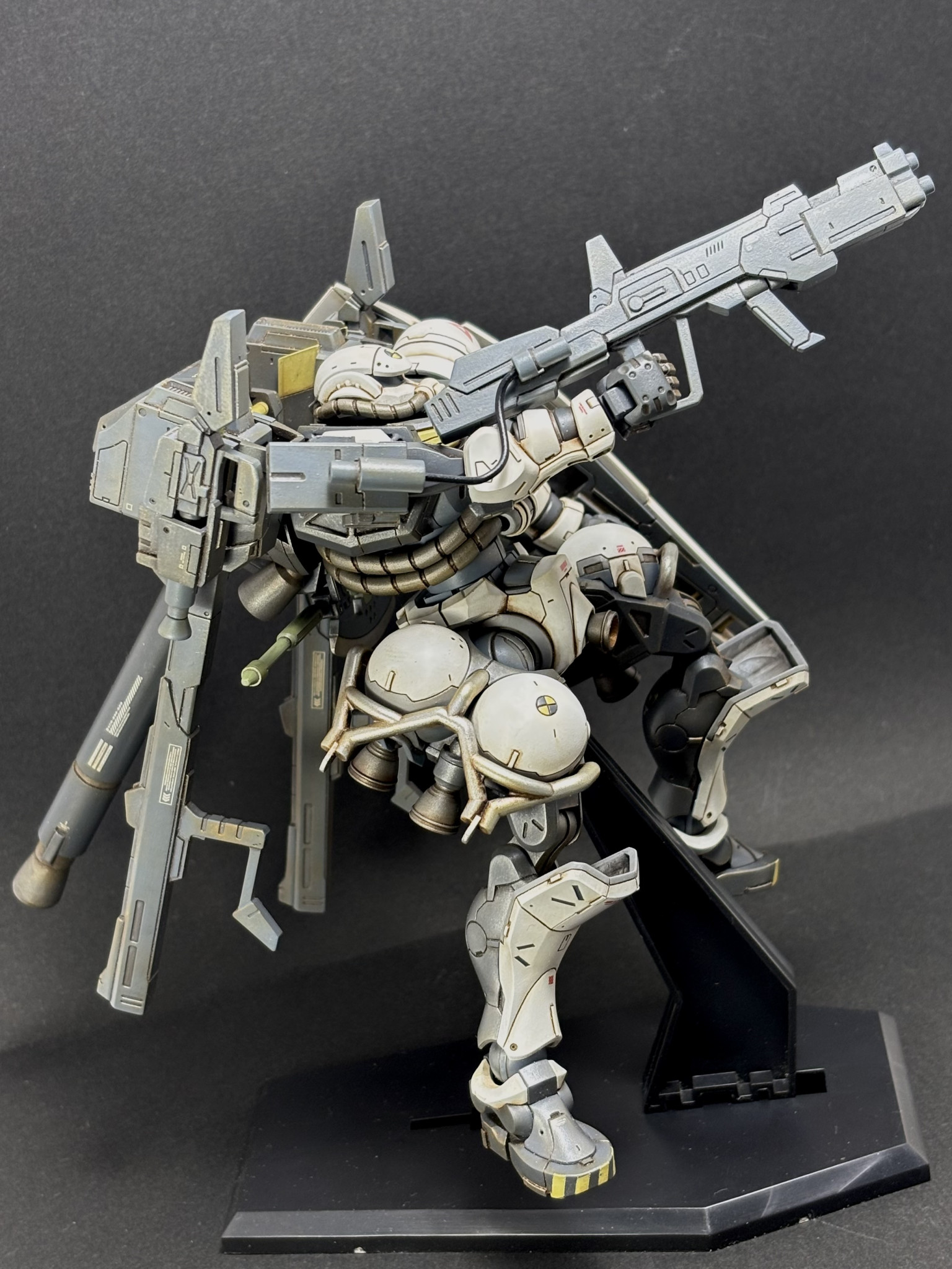 ▲後ろから かなりごちゃごちゃしてますね サイコザクを参考に武器の配置を決めたりしました メカメカしく見えるように後ろに黒やグレーの配色を多くしました