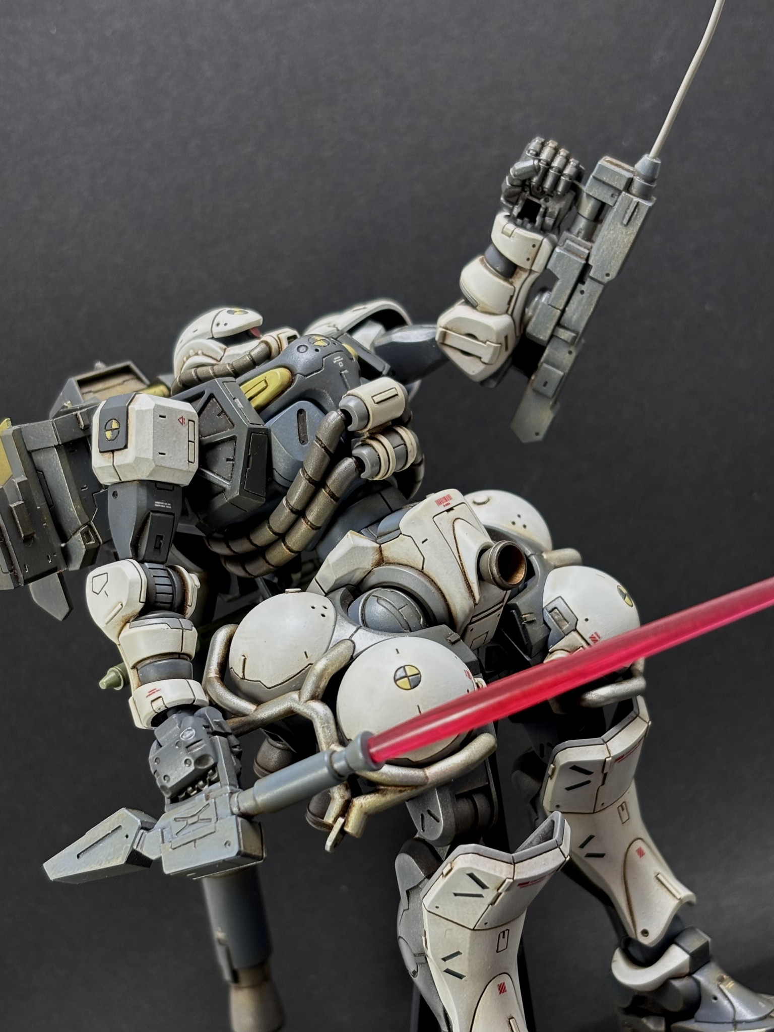 ▲制作過程2 鹵獲化が大方終わったところの一枚 ⚪︎+マークはマスキングじゃむずそうだったのでスジボリにしました ディバイダー最強 GQザク本当にいいデザインだなと思います なるべくまんま使いたかったですが腹の延長と首のメリ込み化だけしました