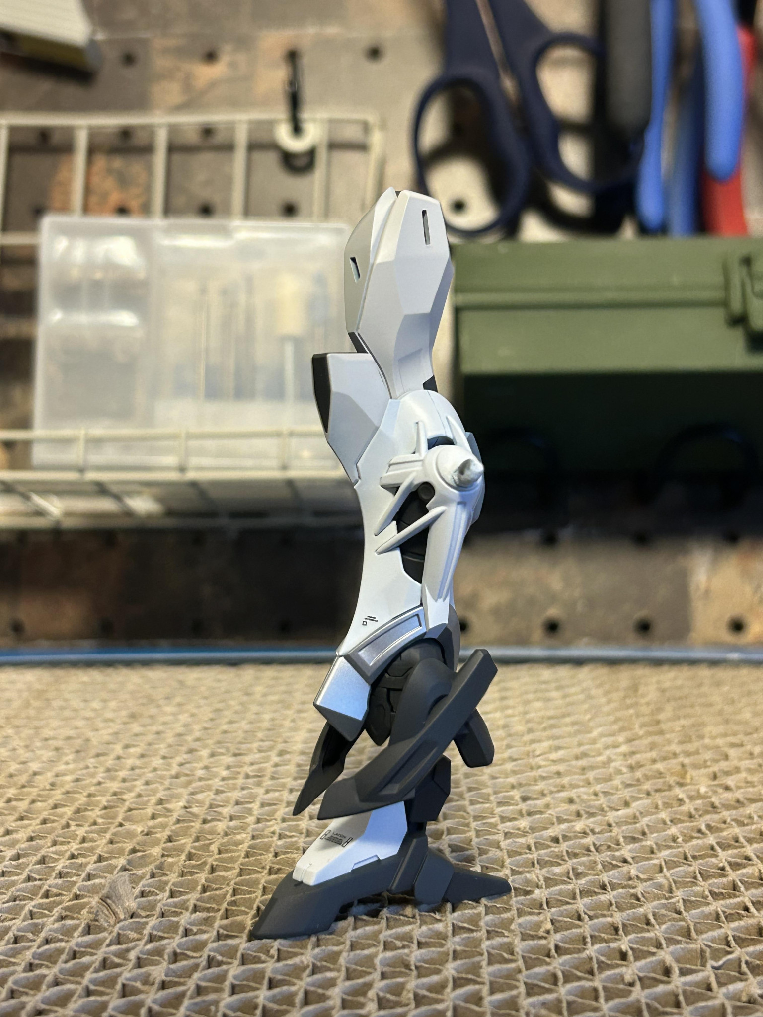 素体ジークアクスのスタイルですと、HGキュベレイのパーツが大きく見えてしまうので、既存の足の部分を踝とアンクルガードに見たて、新たに足を新調し、スタイル変更しました。