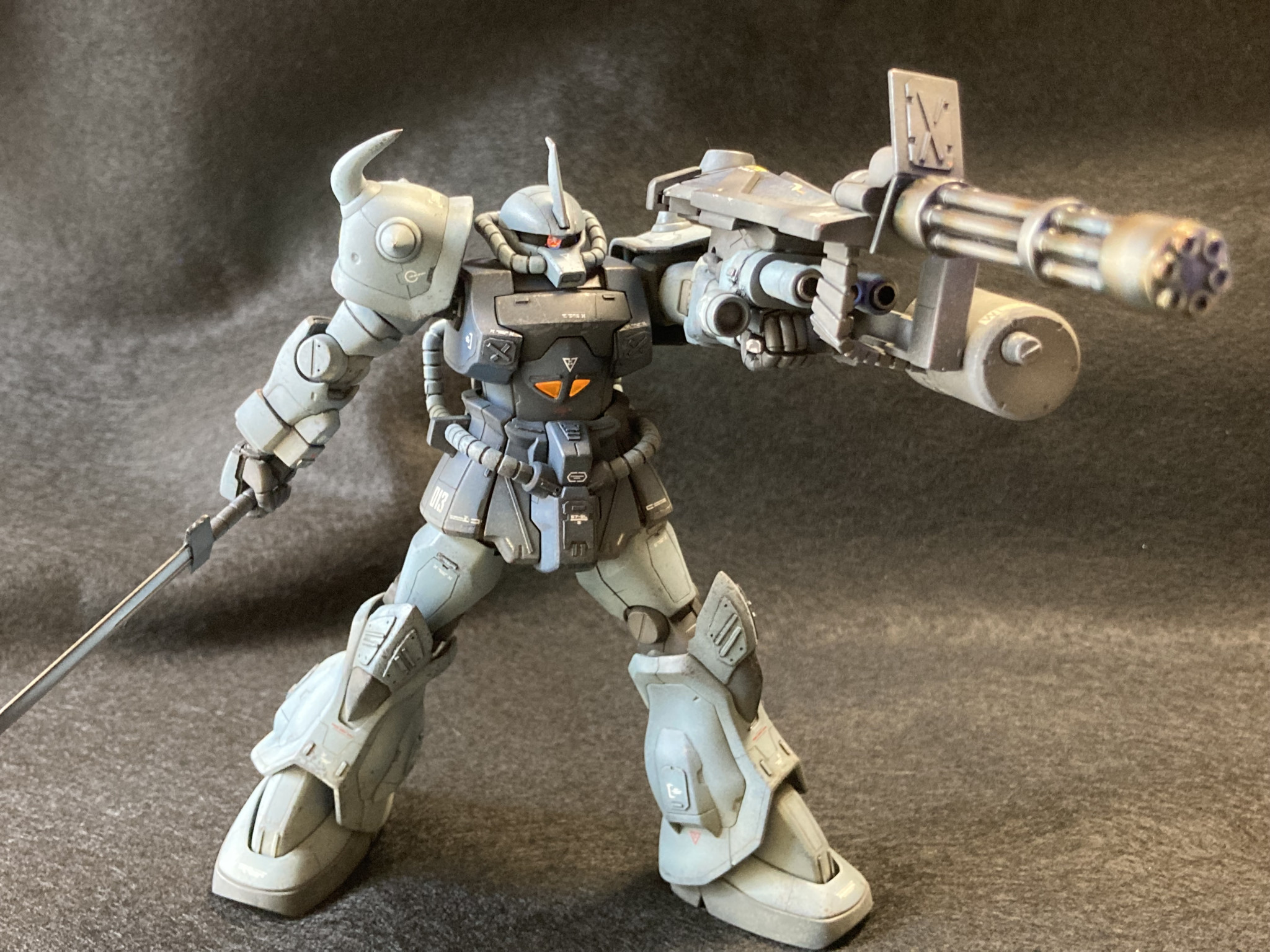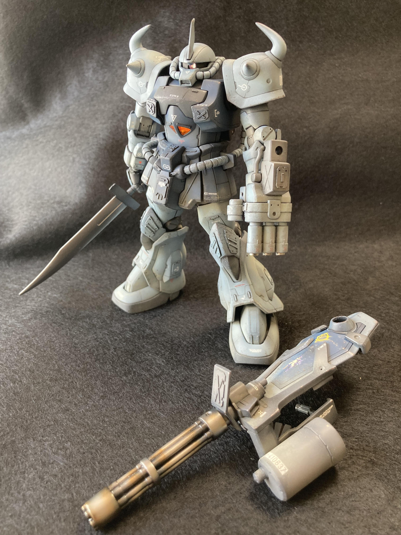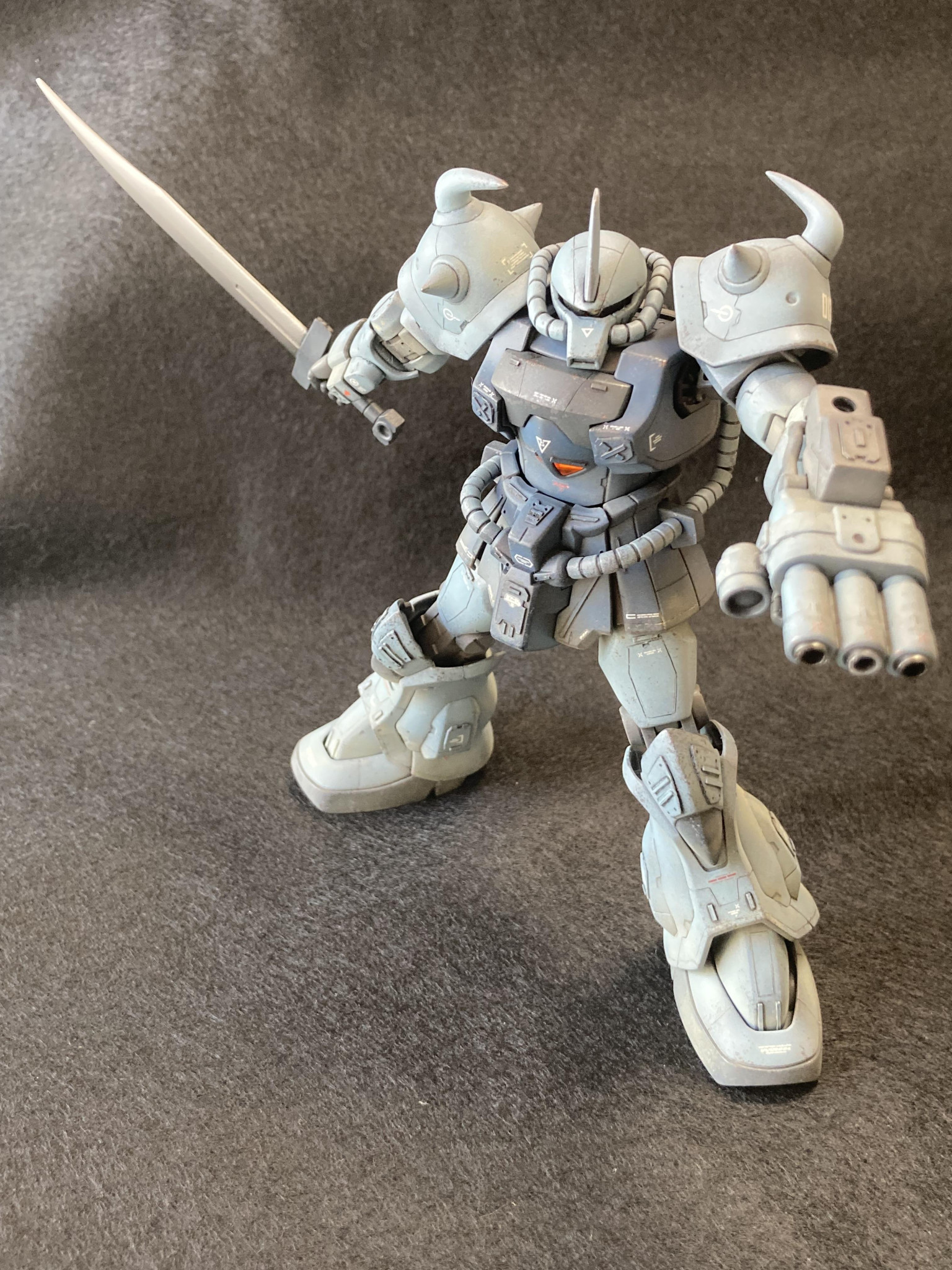 グフカスタムができました!これまた、何故かサフまで吹いた状態で数年放置していたのが発掘されまして、改めてデティール足したりスジボリしてたら元のグレーサフなんてみんな削り取られてしまいましたので黒サフから立ち上げて塗装しました。とても良くできたキットなので、プロポーションはいじっておりませぬ。