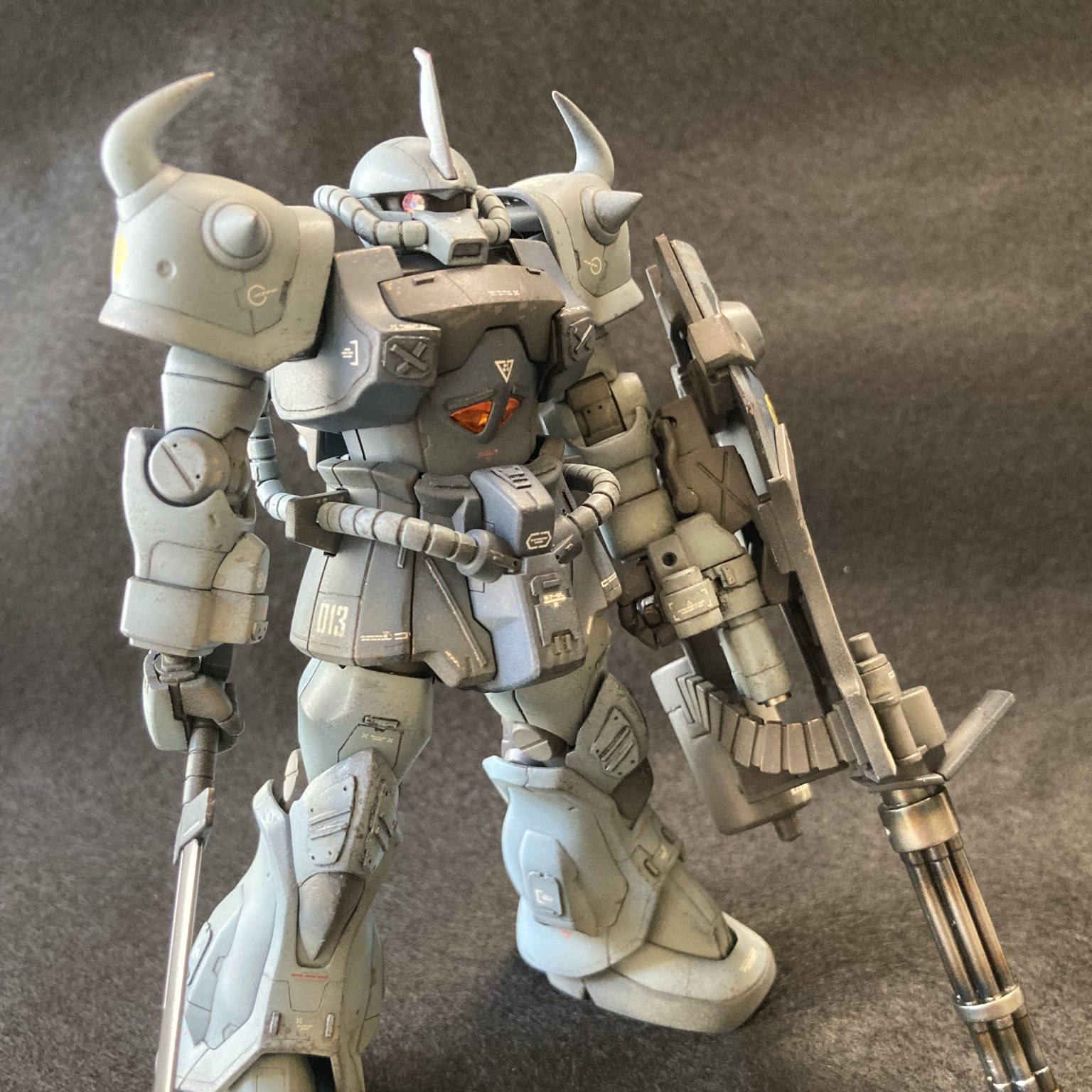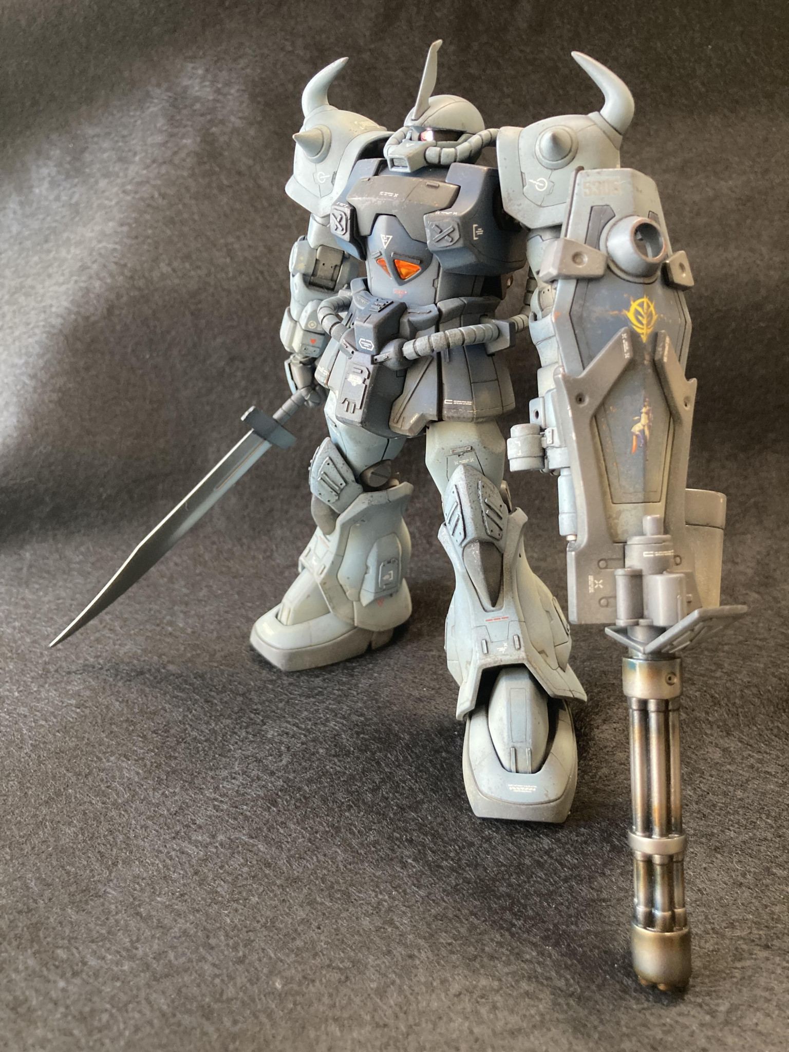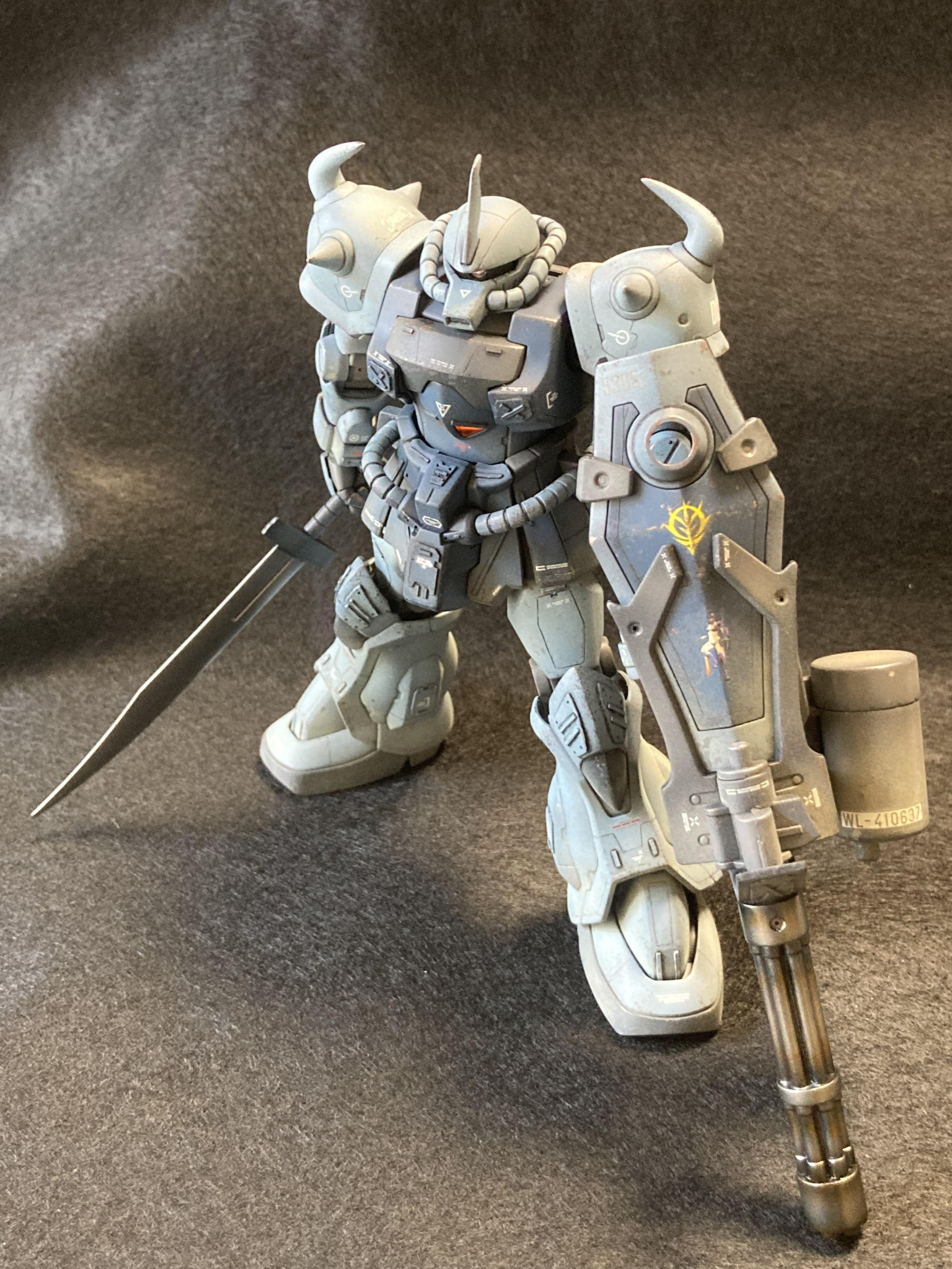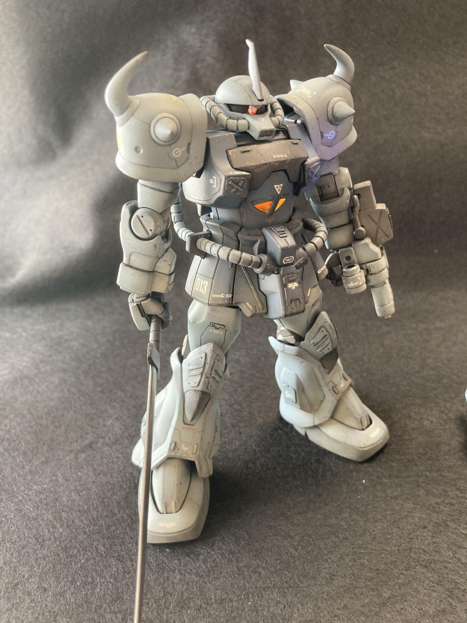 グフカスタムができました!これまた、何故かサフまで吹いた状態で数年放置していたのが発掘されまして、改めてデティール足したりスジボリしてたら元のグレーサフなんてみんな削り取られてしまいましたので黒サフから立ち上げて塗装しました。とても良くできたキットなので、プロポーションはいじっておりませぬ。