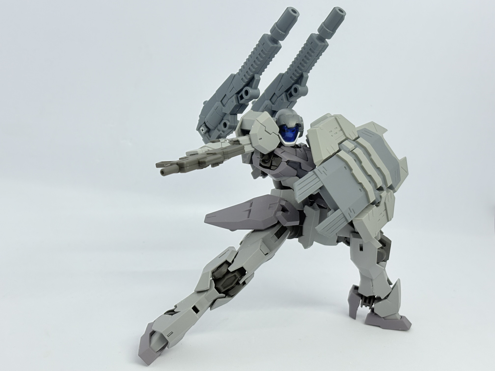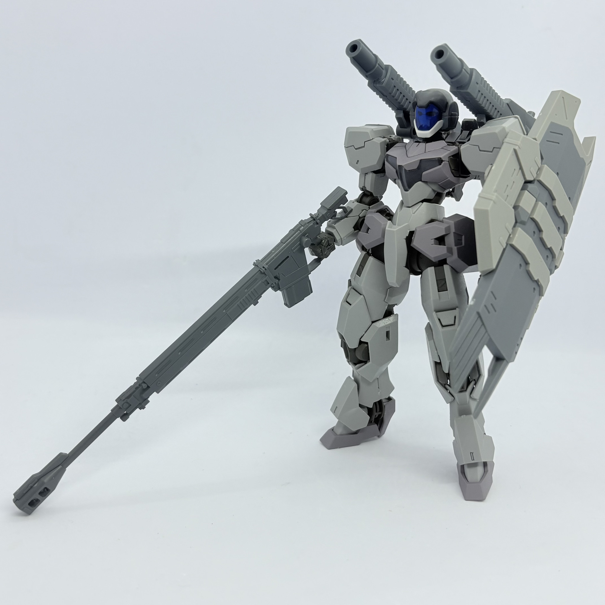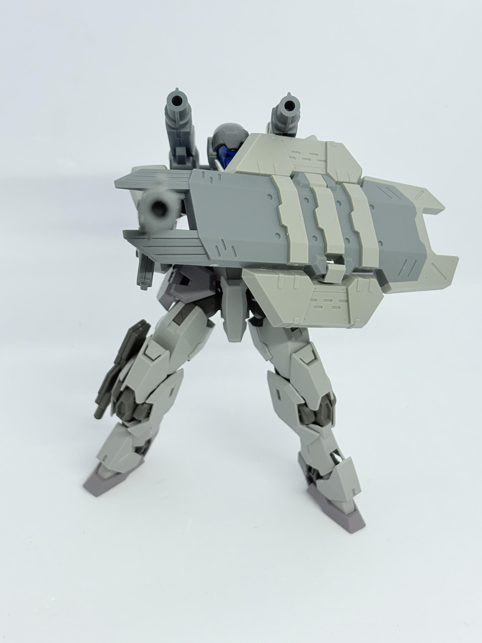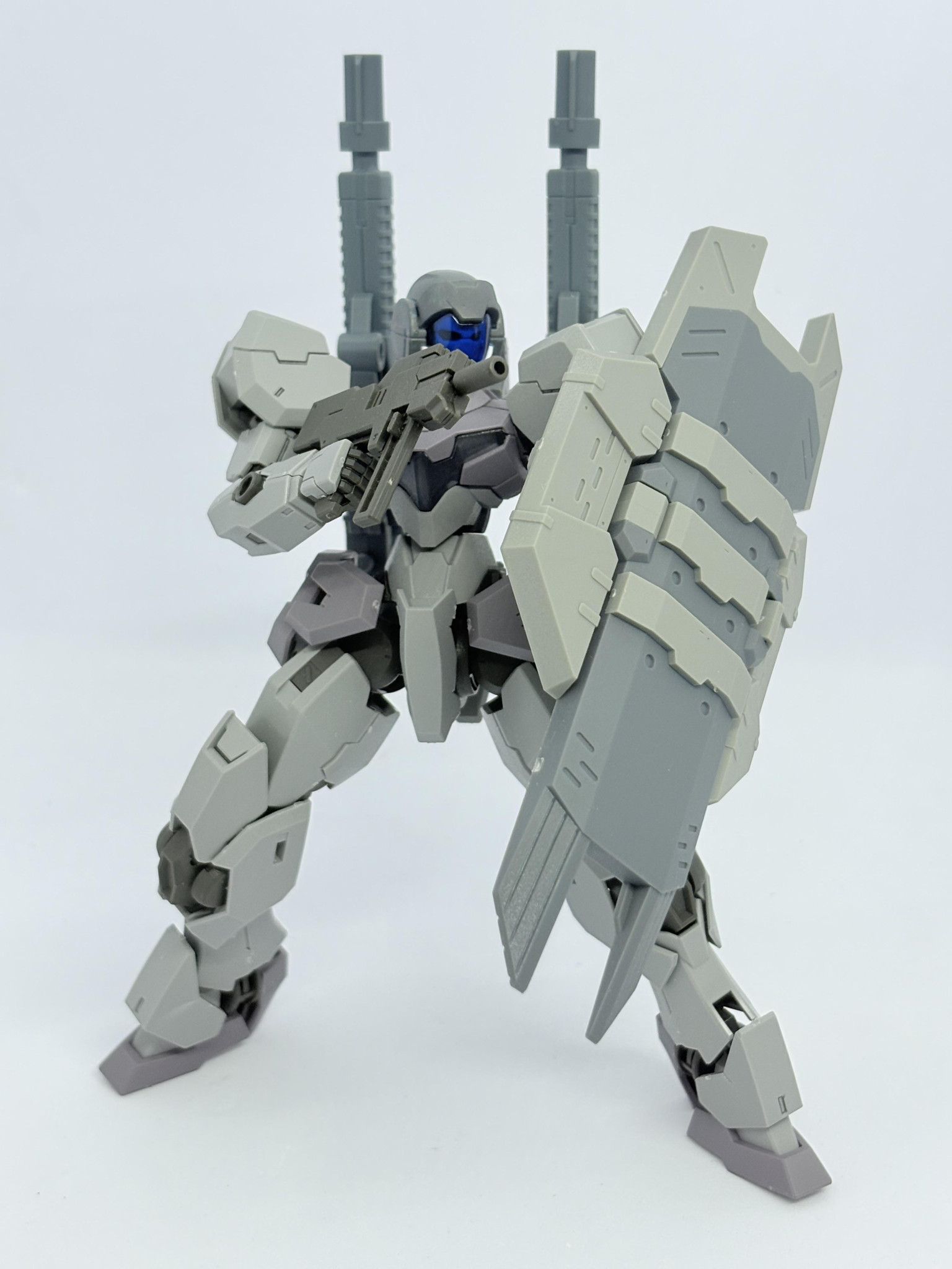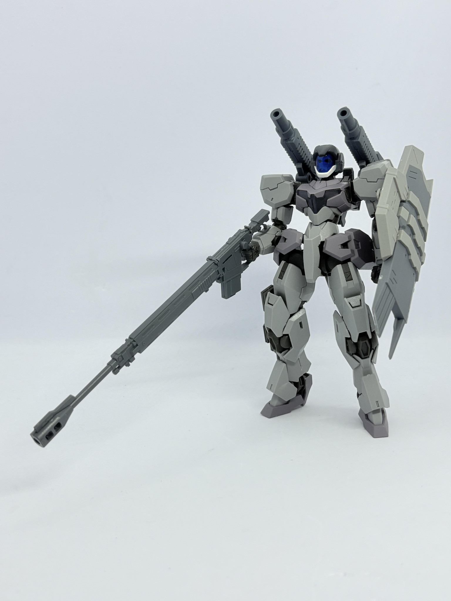前後。ガンヴォルヴァをベースにアデルの頭、30MMキャノンバイクのキャノンをフォレスティエリバックパックに装着。盾はコトブキヤマルチプルシールド。ライフルはデルタカイ?だっけ。その辺のやつ。