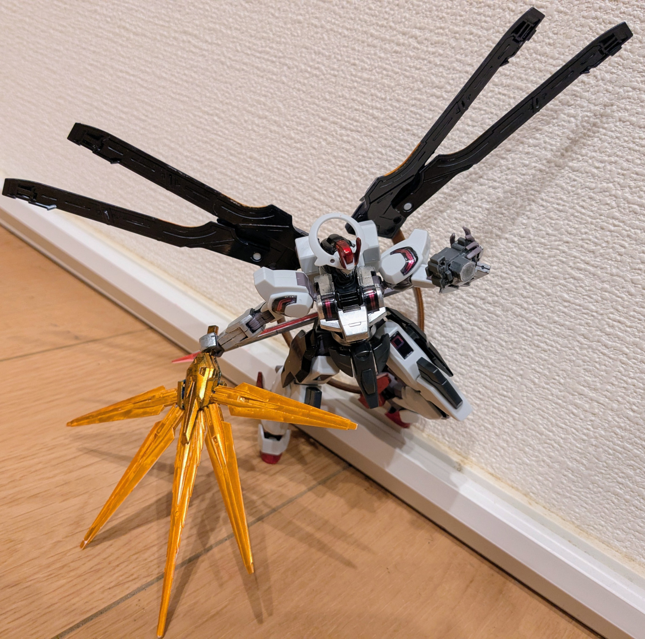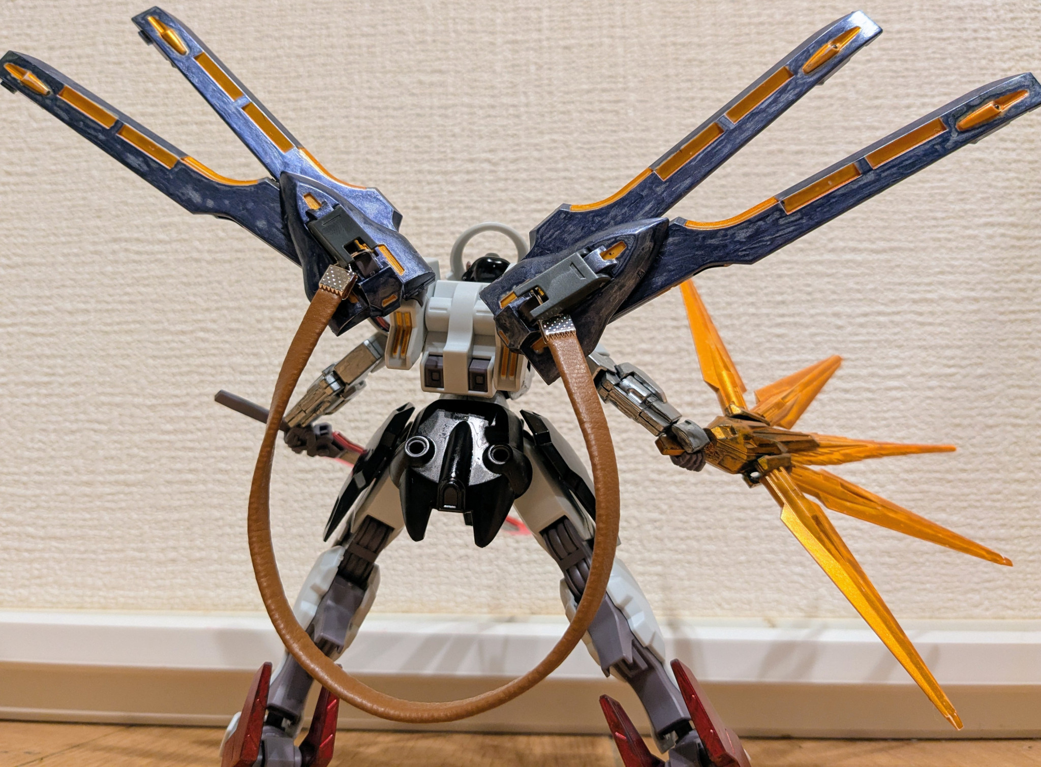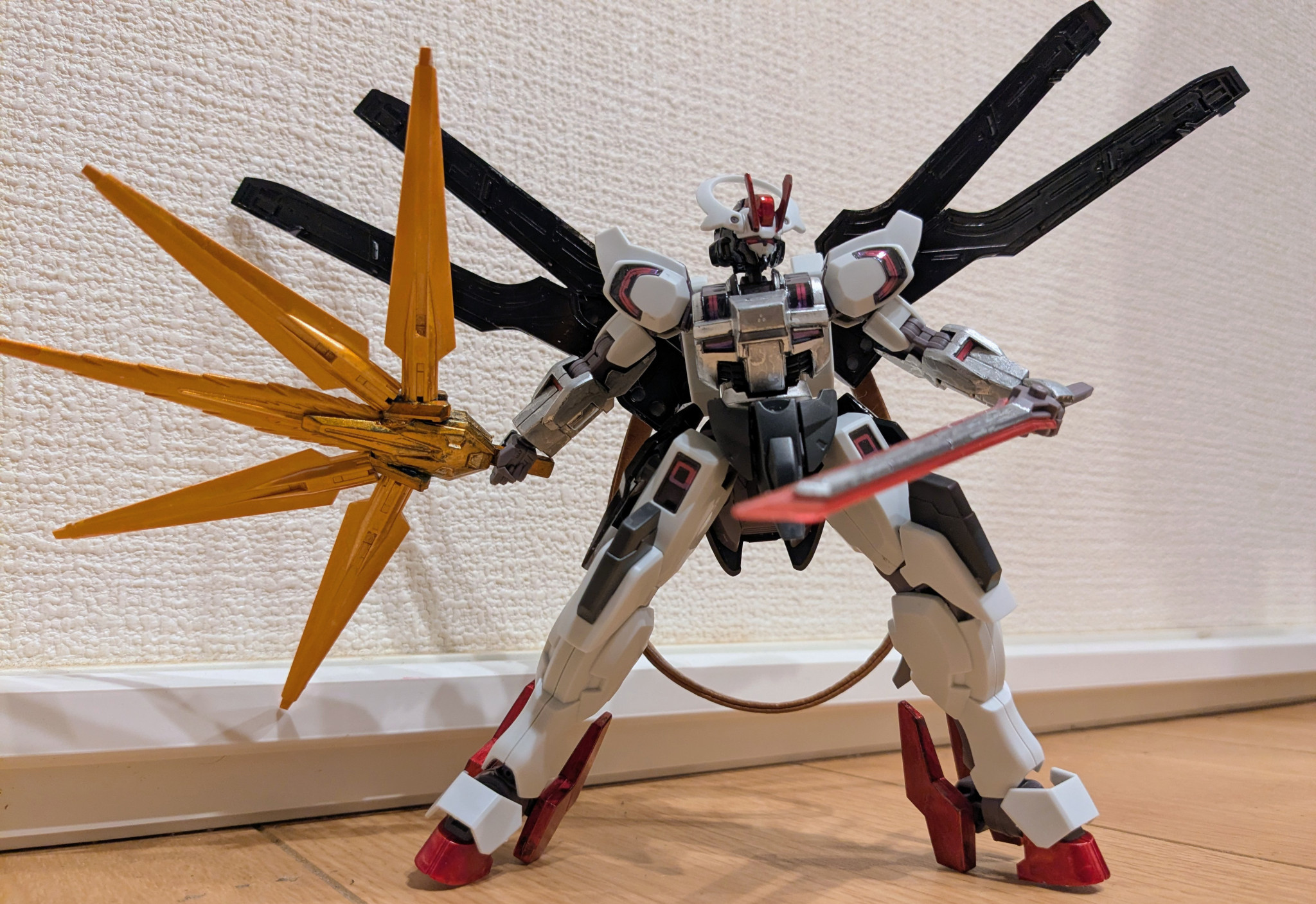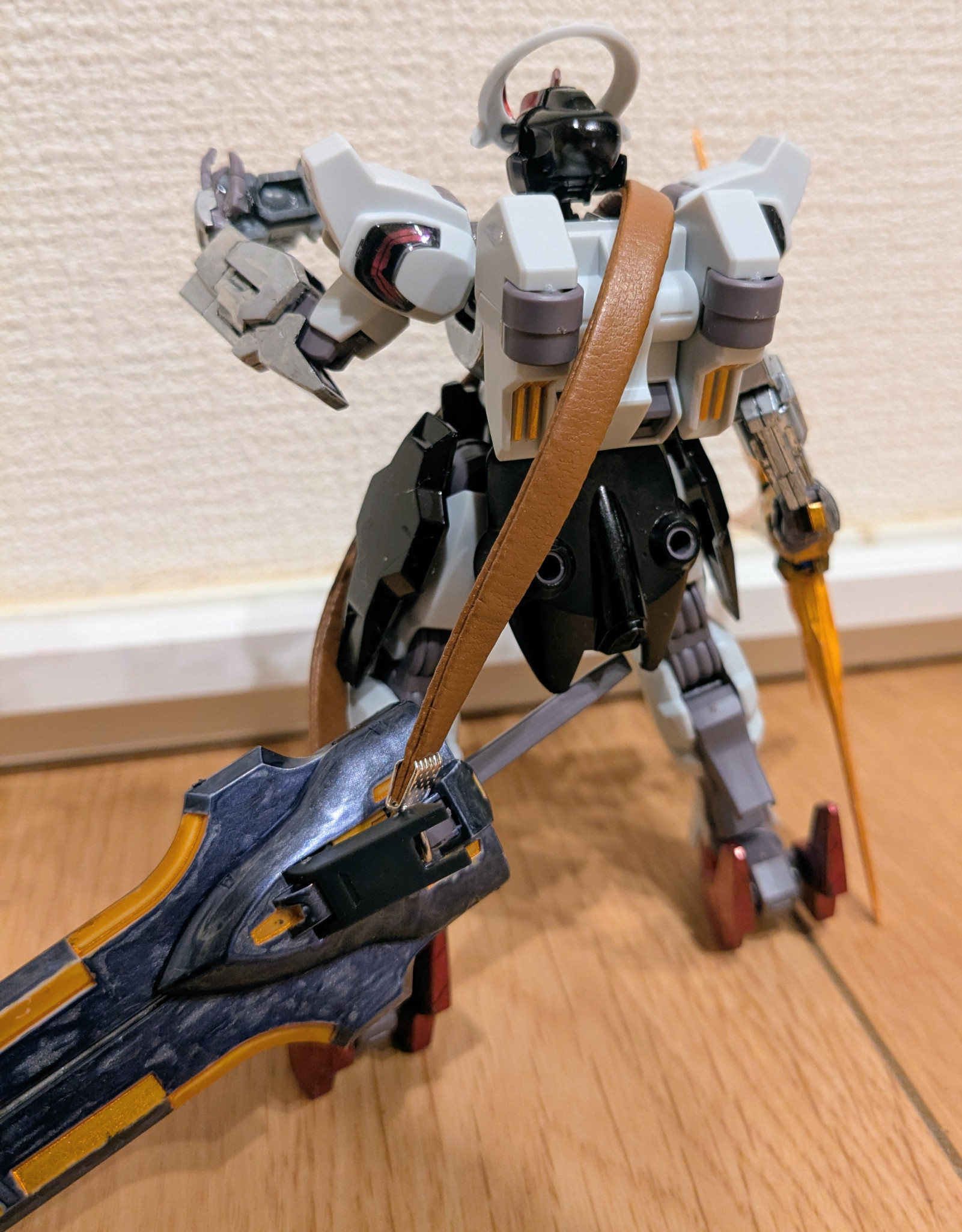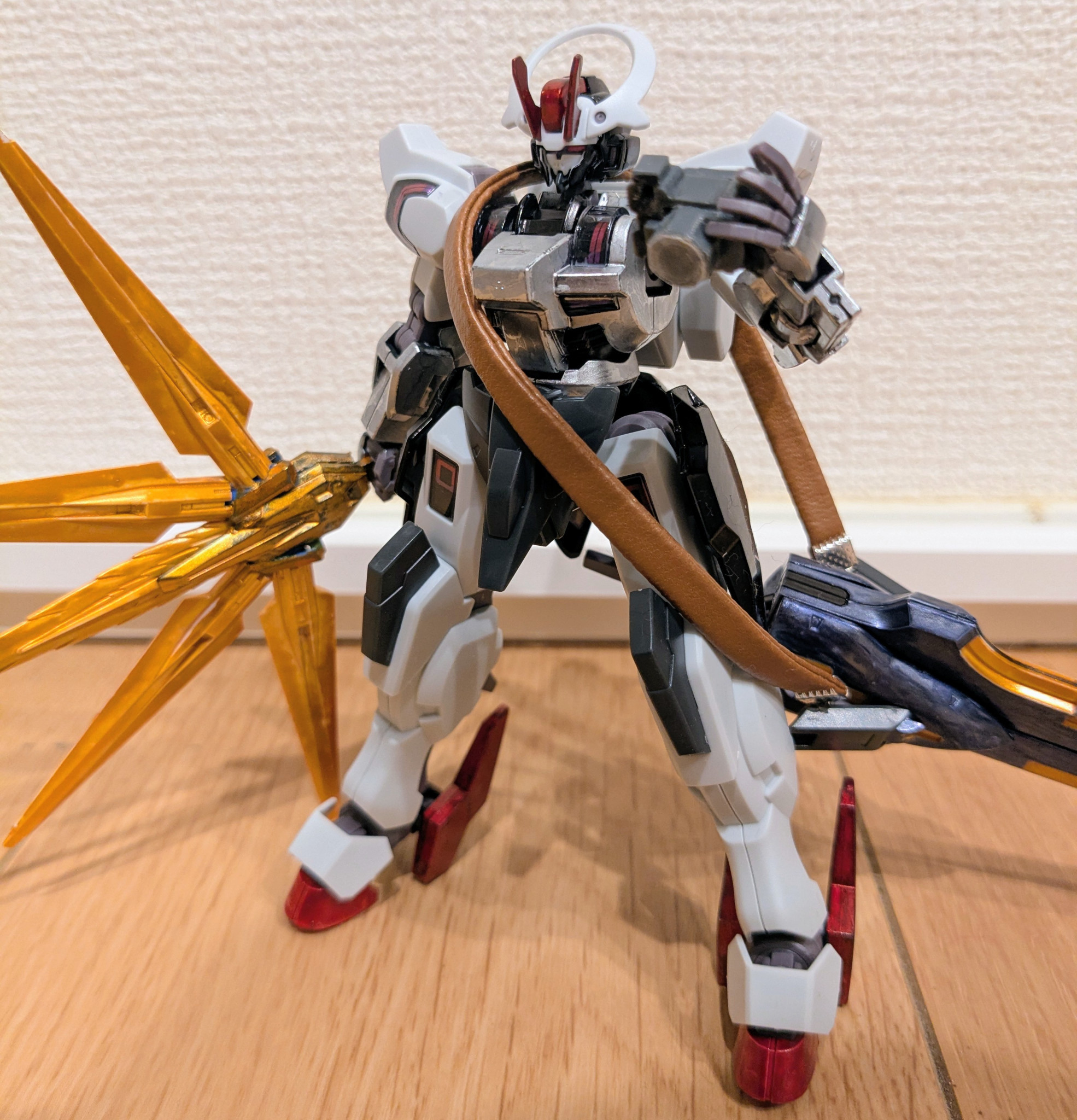 で、右手に持った武器は、文の持つもみじに見えるように、Gフレームのエアリアルのビームライフル、ダブルオー、ダブルオーダイバーのGNソード2、旧1/144ガンダムXのビームサーベルを組み合わせ、メタリックオレンジに塗装しました!元がビームサーベルとGNソード2だから、これで格闘戦も弾幕戦もできる優れものです!