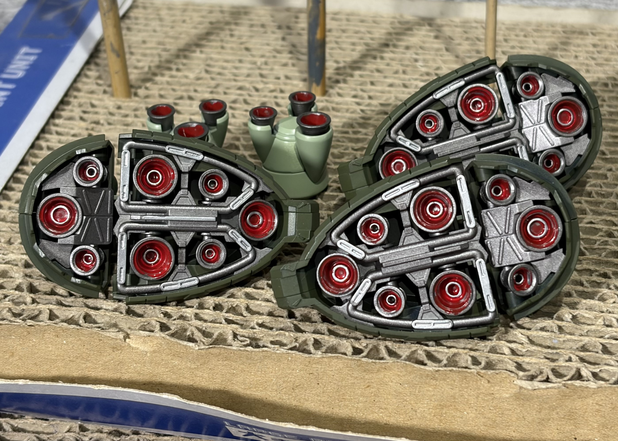 あと話題の足裏はフレームを焼鉄色で塗装。バーニア内部はレッドに塗ってシルバーでアクセント。