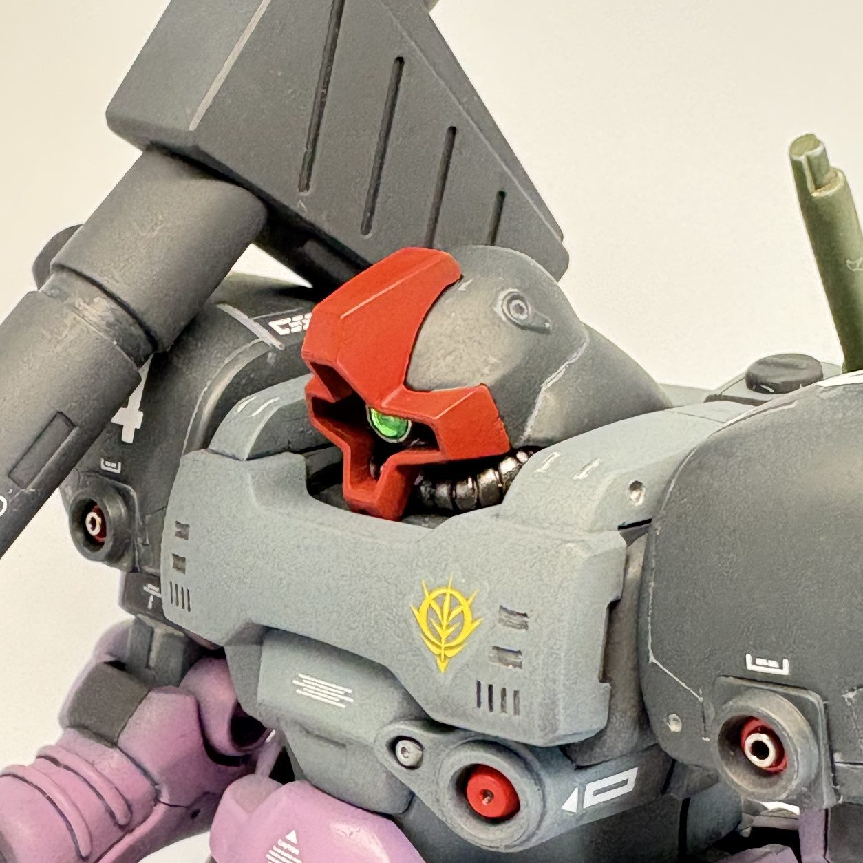 HGリックドム2を作成しました。主な工作は頭部が胴体に埋まるよう、首元を切断し、1ミリ下方に再接着、結果は…少しアゴを引けるように改修しました。頭部の中をくり抜いてモノアイをクリアパーツ化しました。あとはいつも通りバトオペ2を参考にスジボリを施し、水性ホビーカラーでエアブラシ全塗装です。拙作ですが、どうぞ最後までお付き合い下さい。