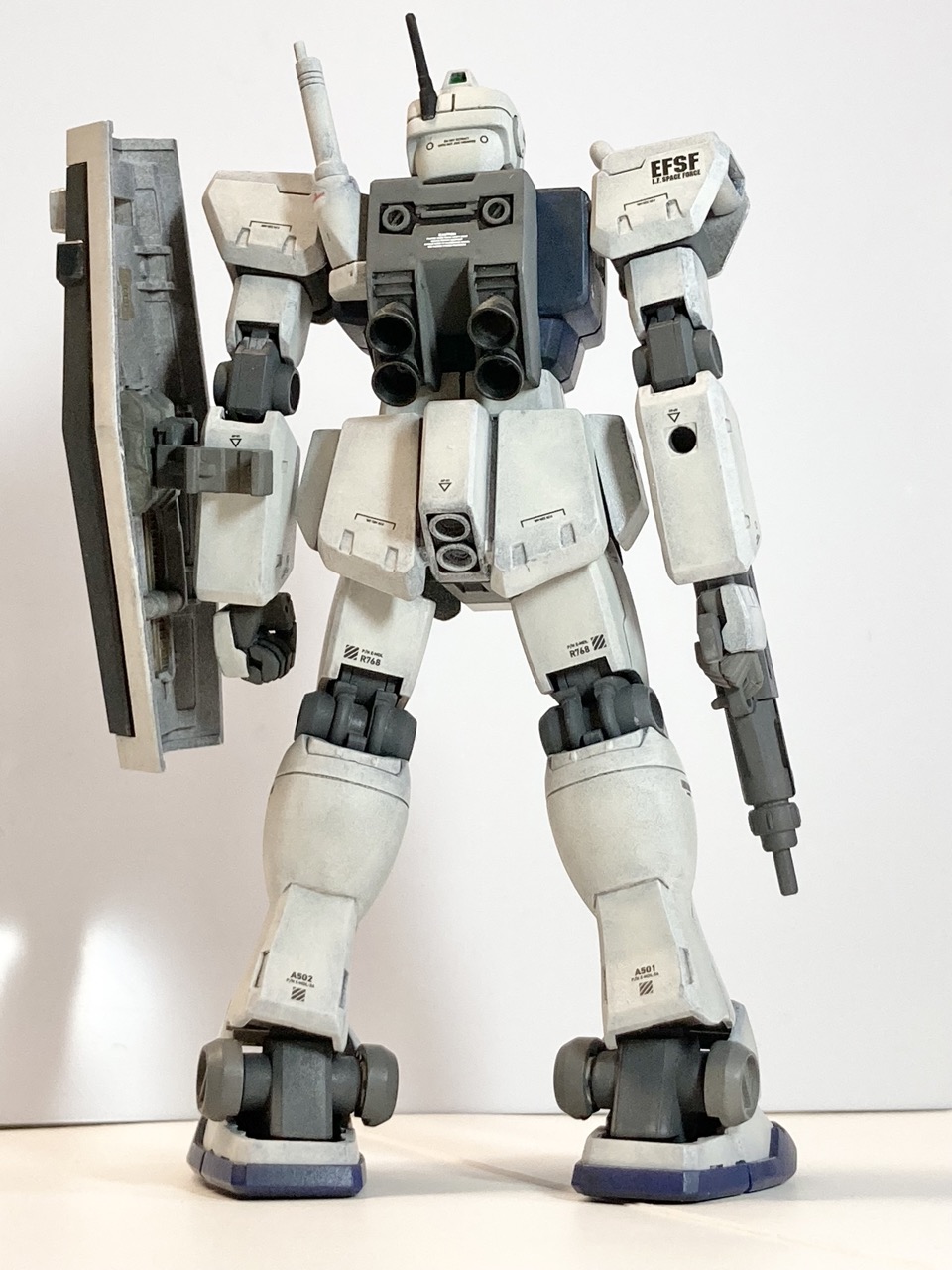 背面側。塗装や武装は関節パーツは数年前にラッカーのグレー系をエアブラシ塗装して熟成させていました。外装系は今年に入って下記の如く対応