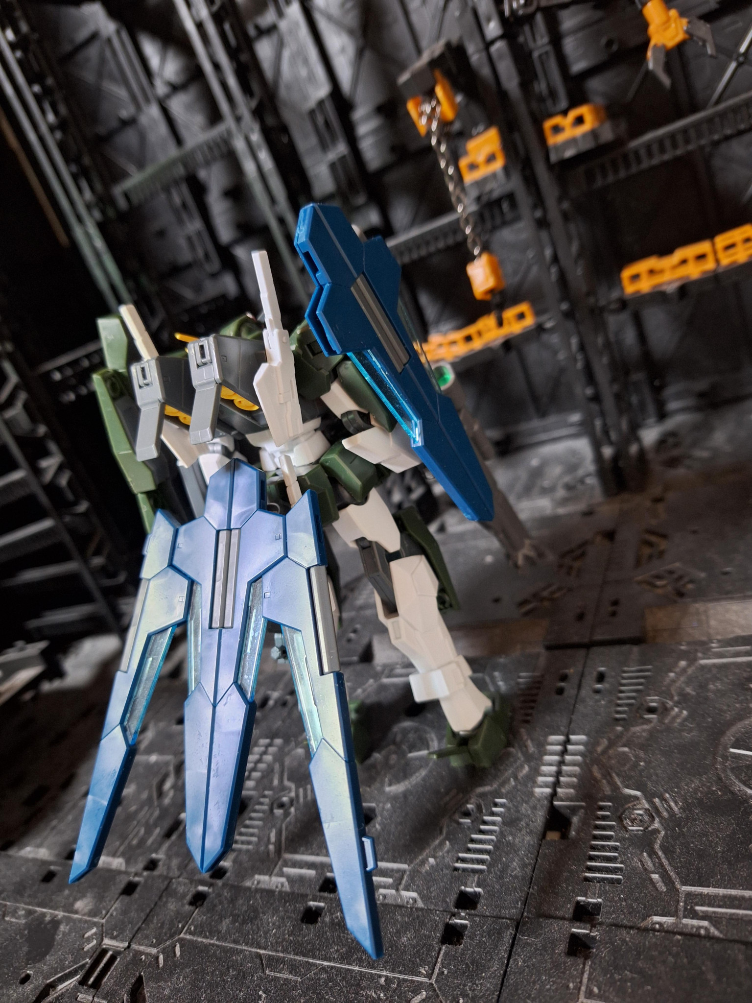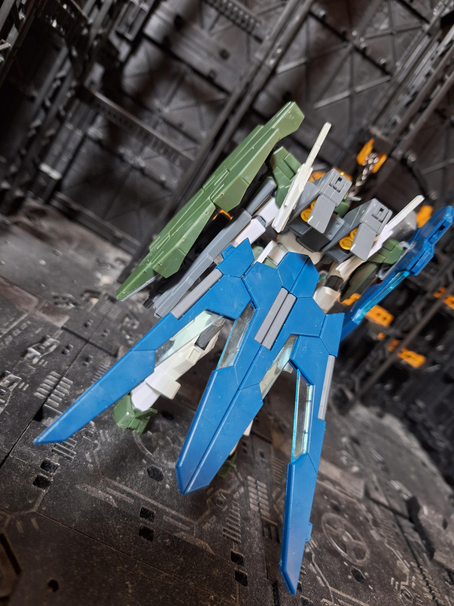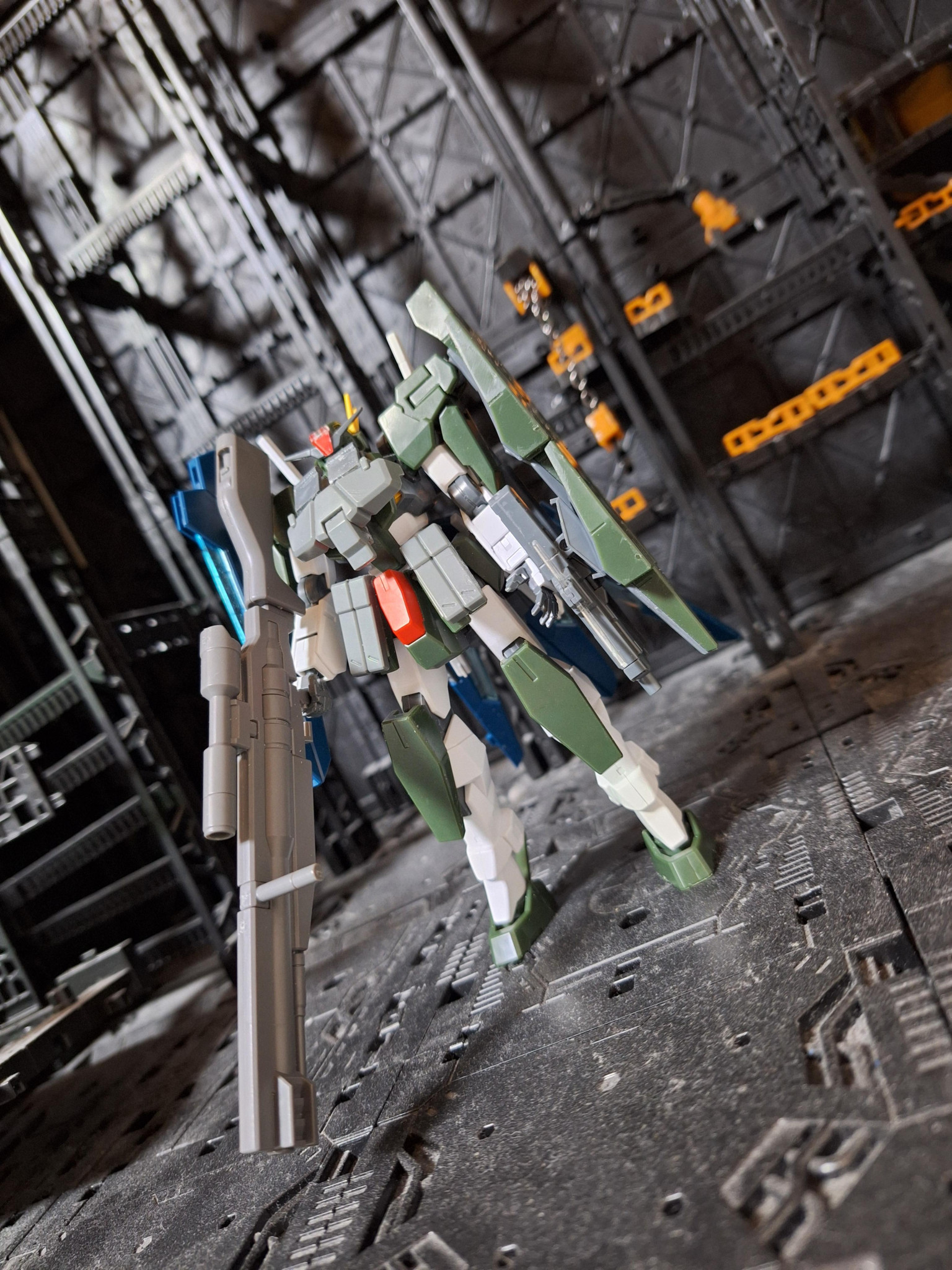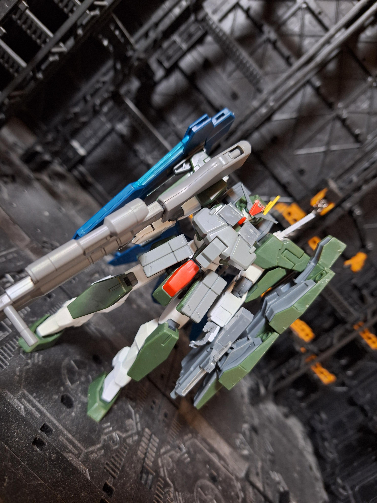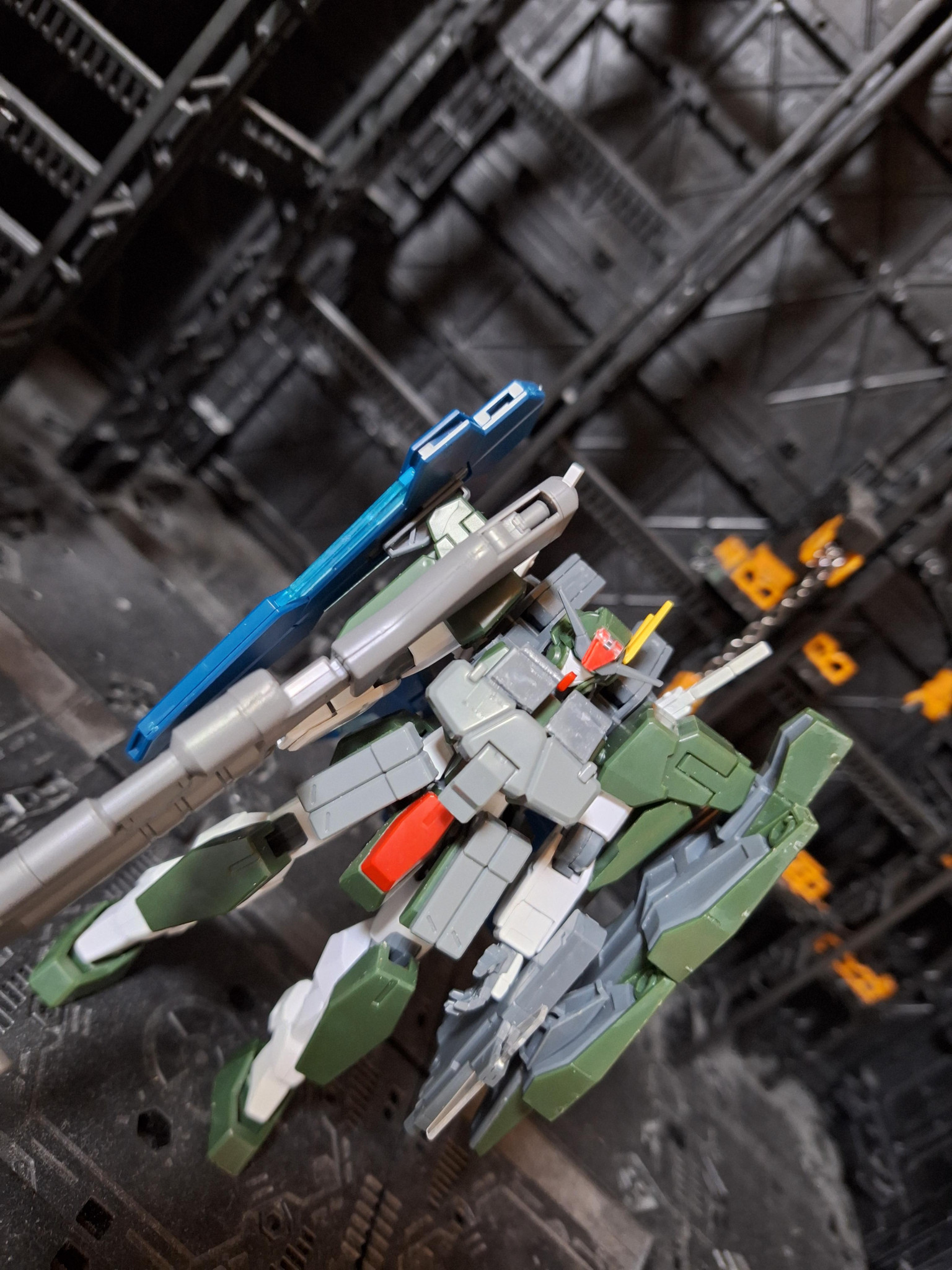 ケルディムガンダムGNHW/R-K9です。ジムスナイパーK9をジムスナイパーⅡガンダムヘッド寒冷地仕様としたことで、余ったビームスナイパーライフル他K9パーツを使用して作りました。